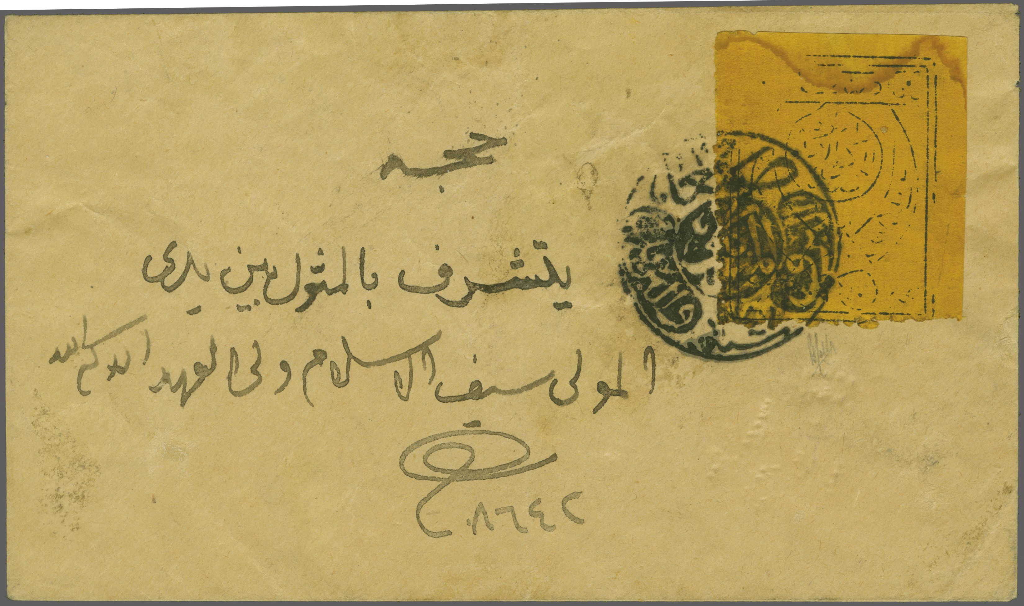 1100 cover image1926: Inland Postage, 2½ b. black on orange, imperforate on horizontally laid paper, a used example with rough perfs. at base, used on cover to one Sayf al-Islam in Hajjah (North East of Sana'a) tied by bold srtrike of circular "SANA'A" negative seal handstamp (Type 2) in black. Natural staining at top of the stamp, a rare and very fine cover. Signed Holcombe. Provenance: DF, Geneva, Dec 2015, lot 50240, where wrongly described (Image 1) (Image 2)