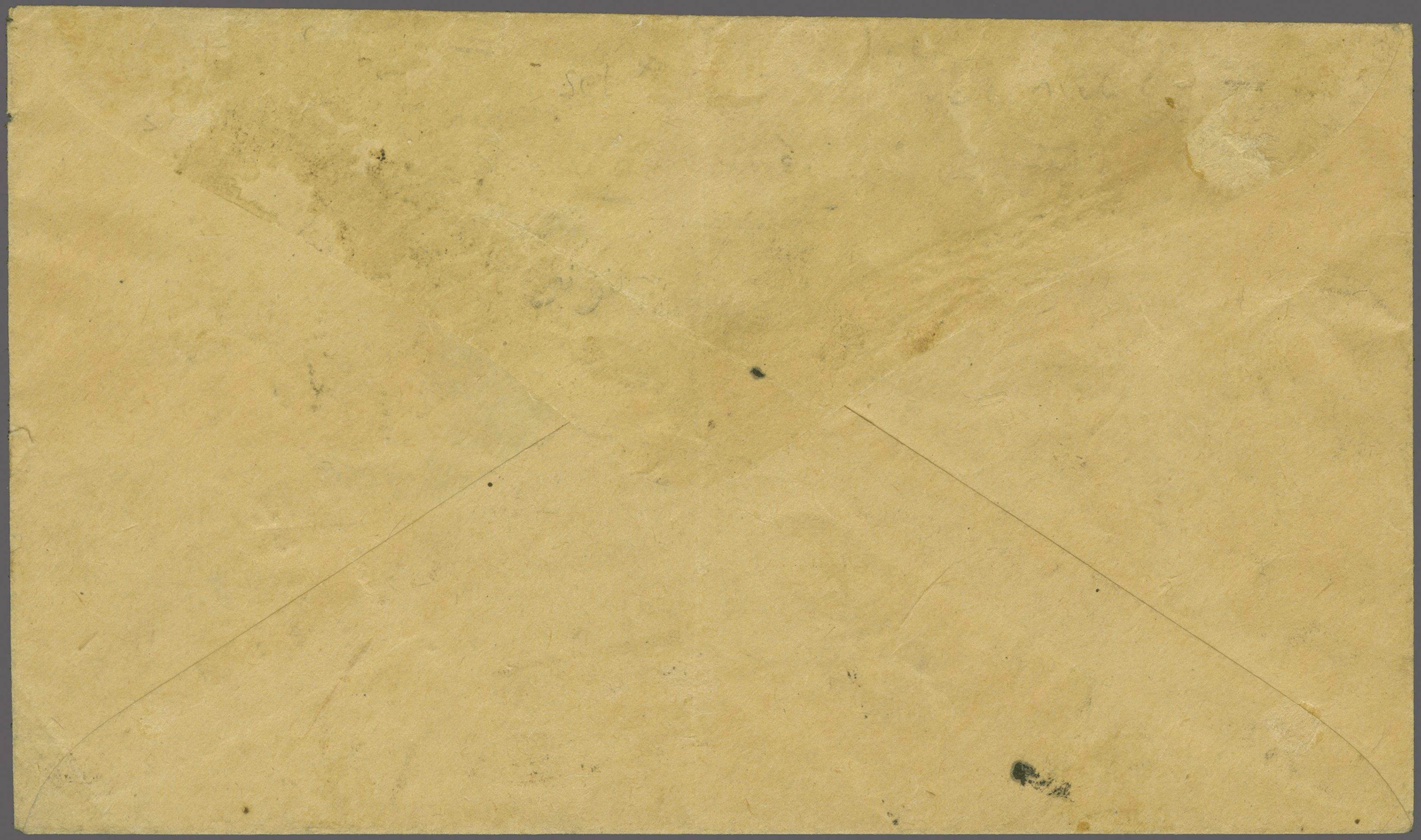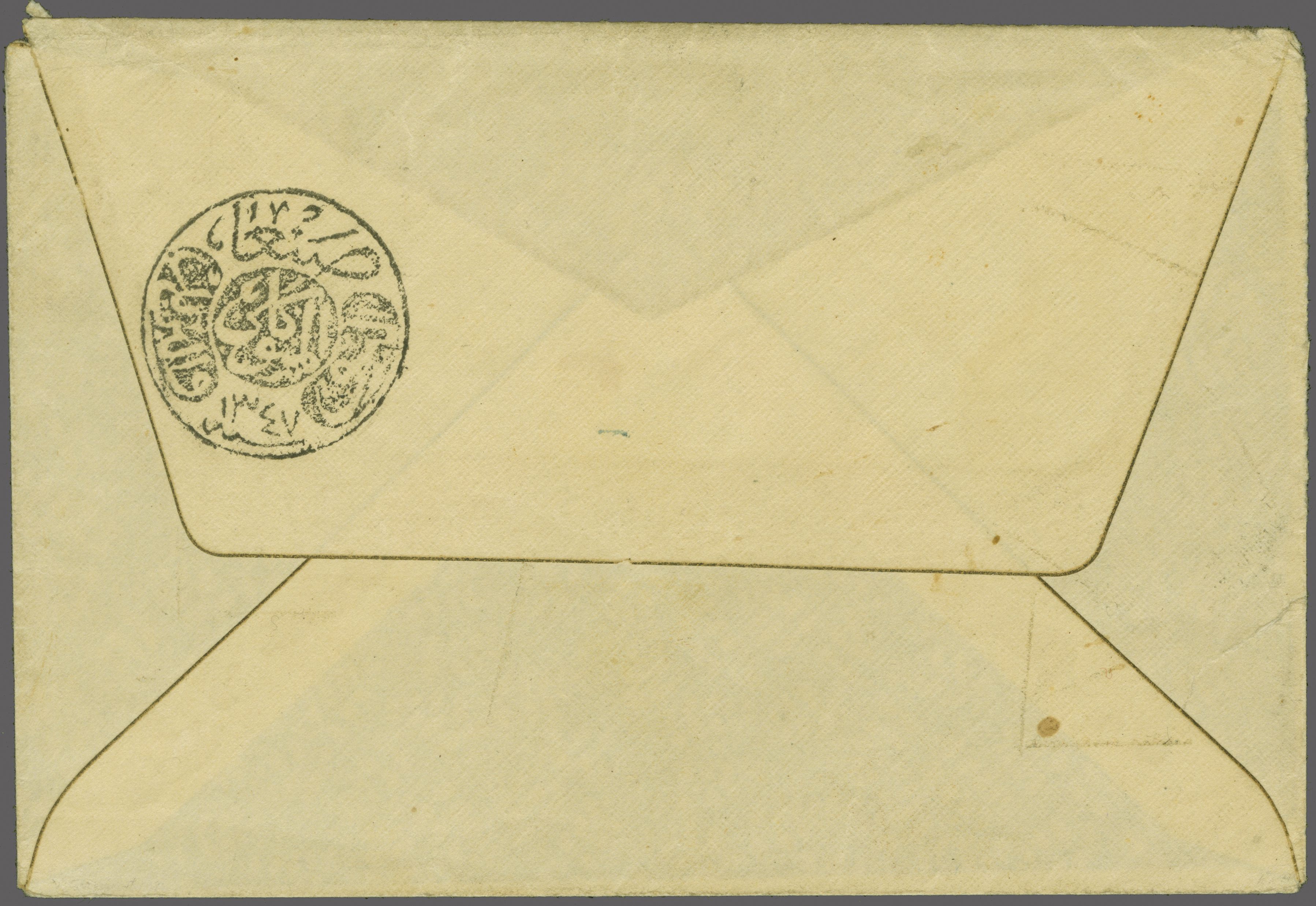 1102 cover image1926: Inland Postage, 2½ b. black on orange and 5 b. black on white, imperforate on horizontally laid paper, used examples with large margins all round on bilingually addressed cover to Brno, Czechoslovakia tied by bold strike of circular "SANA'A" negative seal handstamp in black (Type 2) with further information strike on reverse. This cover would have been supplied to the addressee direct from the Sana'a Post Office upon request and receipt of payment, nevertheless rare (Image 1) (Image 2)