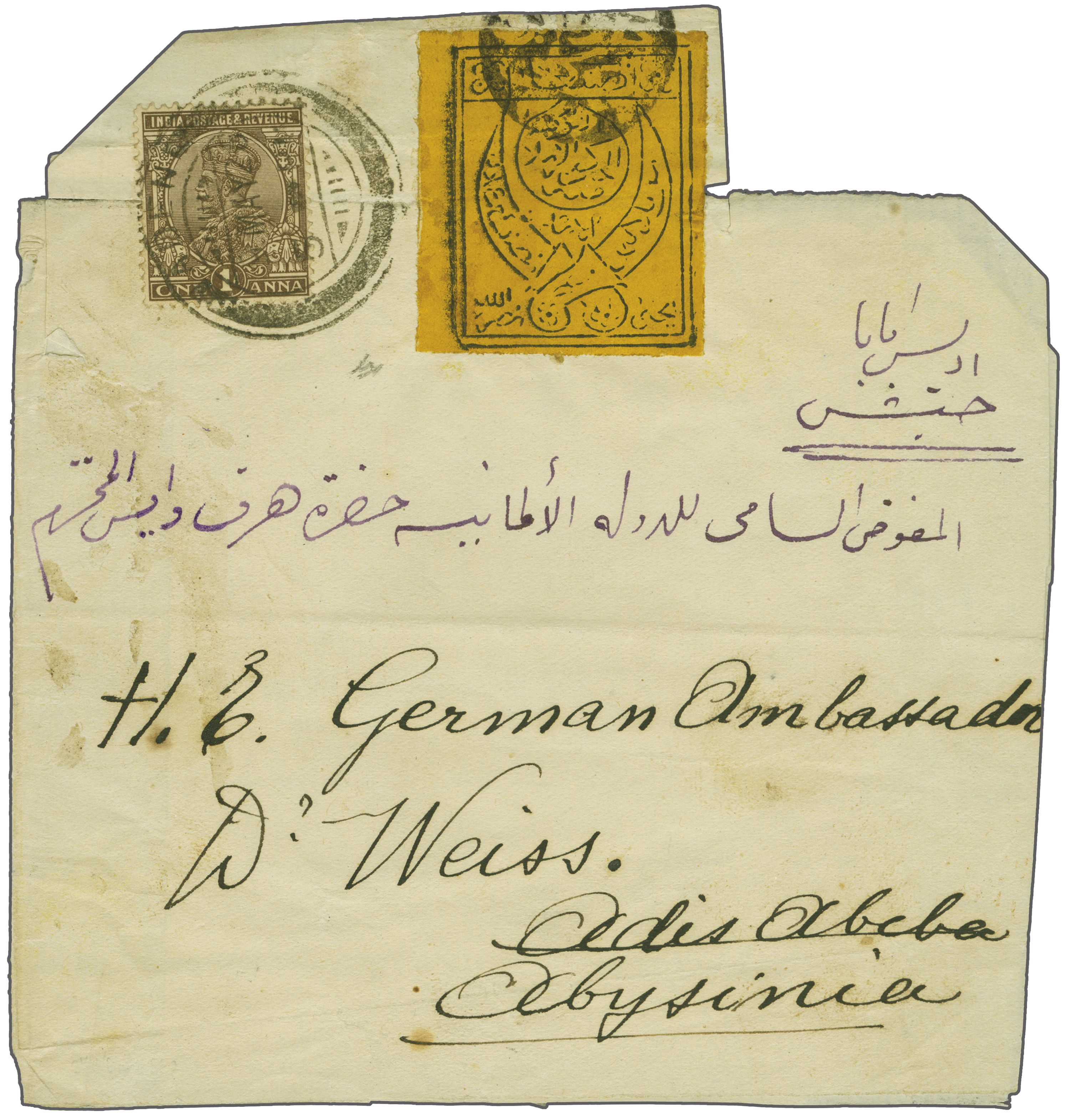 1101 cover image1926: Inland Postage, 2½ b. black on orange, imperforate on horizontally laid paper, a used example with large margins all round used on large part wrapper, probably from a Newspaper, mailed to the German Ambassador in Addid Abeba, cancelled by large part "SANA'A" negative seal handstamp (Type 3) in black, with India 1926 1 a. chocolate (Gi 203) applied for onward transmission, tied by ADEN cds (May 9, 1928) in black. An exceptional and extremely rare combination usage. Provenance: Soler y Llach, Barcelona, 24 Oct 2005 (Image 1) (Image 2)