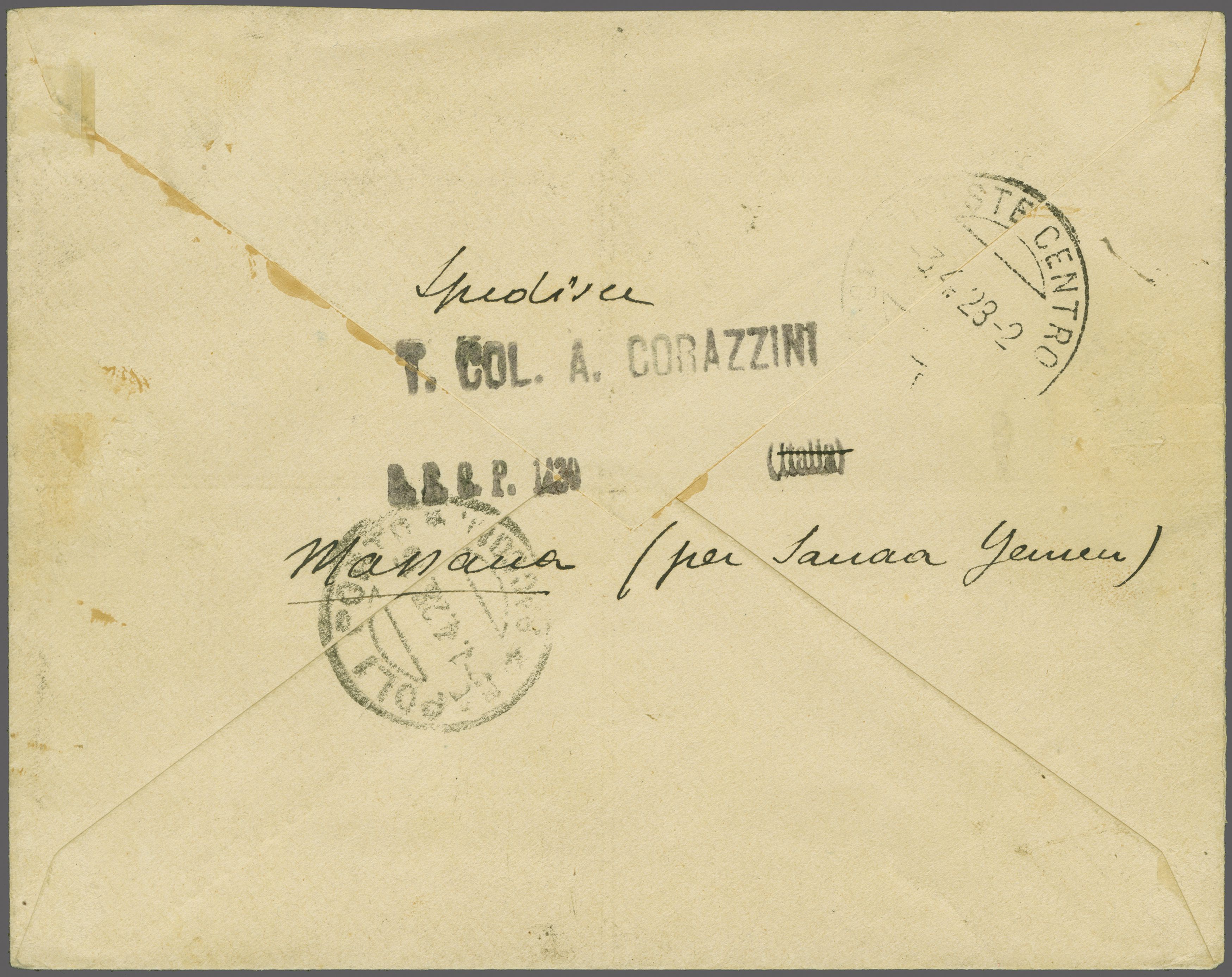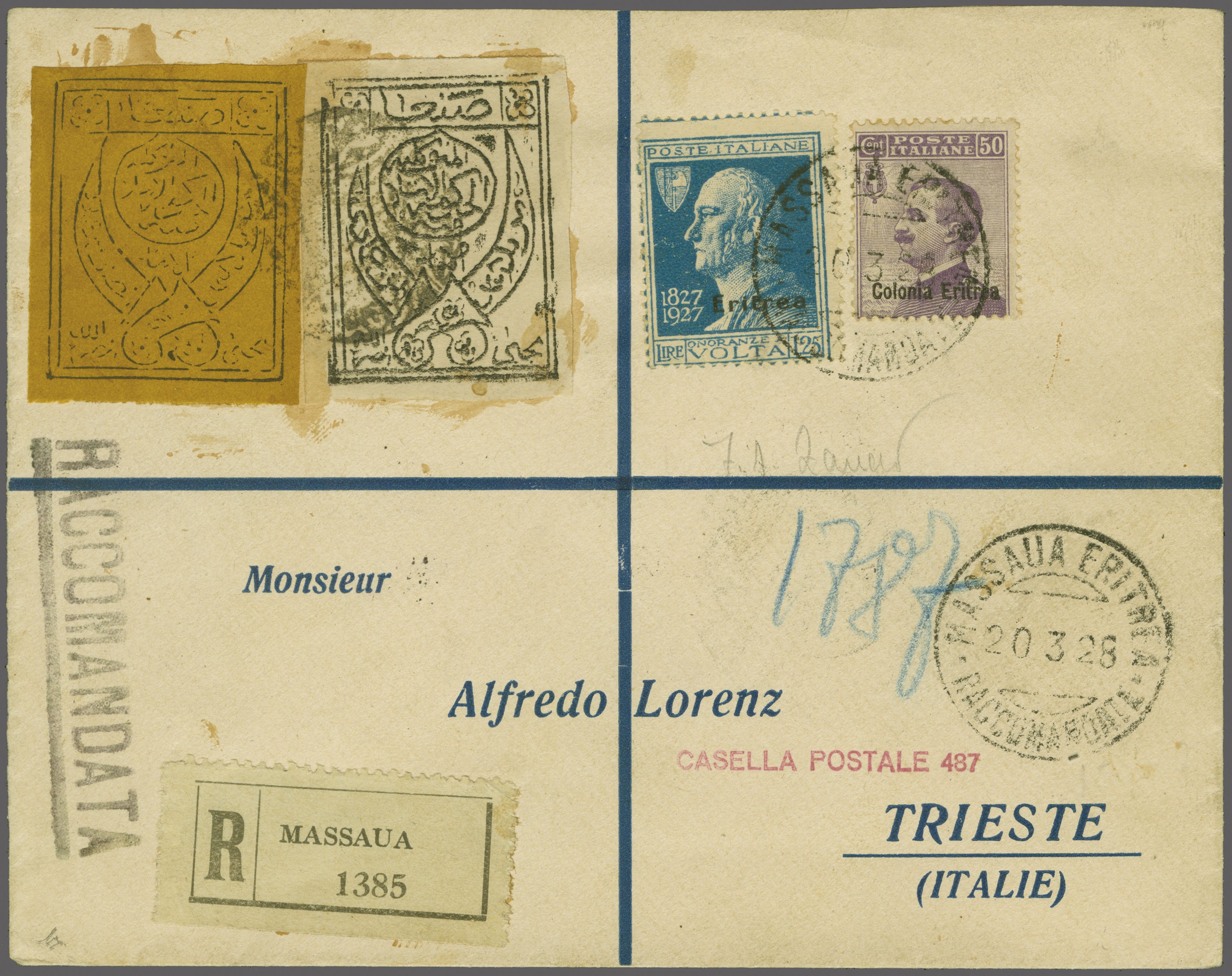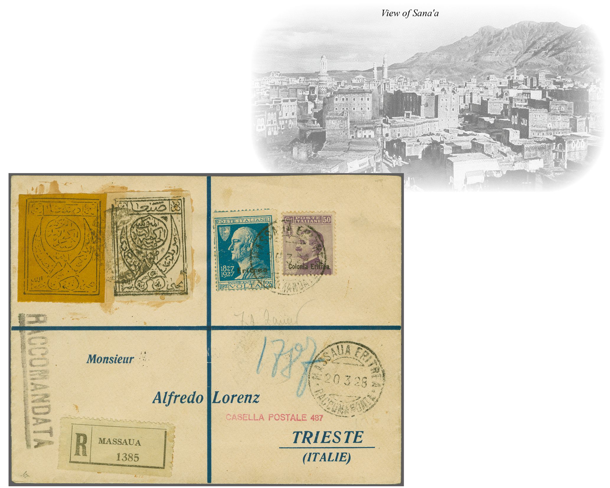 1103 cover image1926: Inland Postage, 2½ b. black on orange and 5 b. black on white, imperforate on horizontally laid paper, used examples with large margins all round, on registered 1928 cover from Colonel A. Corazzini of the Italian Diplomatic Mission in Sana'a to Trieste, Italy tied by "SANA'A" negative seal handstamp in black; with Eritrea 50 c. violet and 1 l. 25 c. blue applied for onward transmission tied by "MASSAUA ERITREA / RACCOMANDATE" cds (March 20) in black with registration label at left. Naples transit cds (April 1) and Trieste arrival on reverse. Slight stains from the glue used to apply the Yemeni stamps (issued without gum) otherwise a splendid and an extremly rare and fine cover (Image 1) (Image 2) (Image 3)