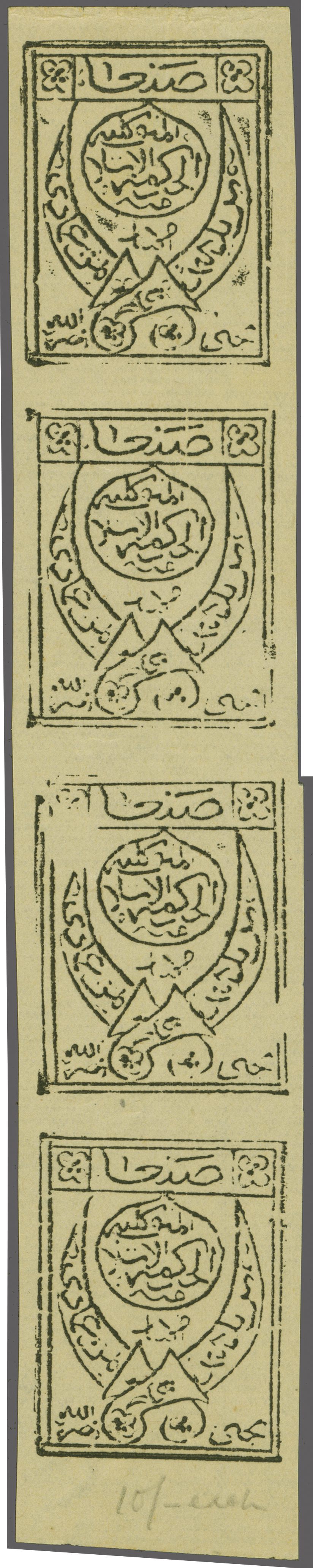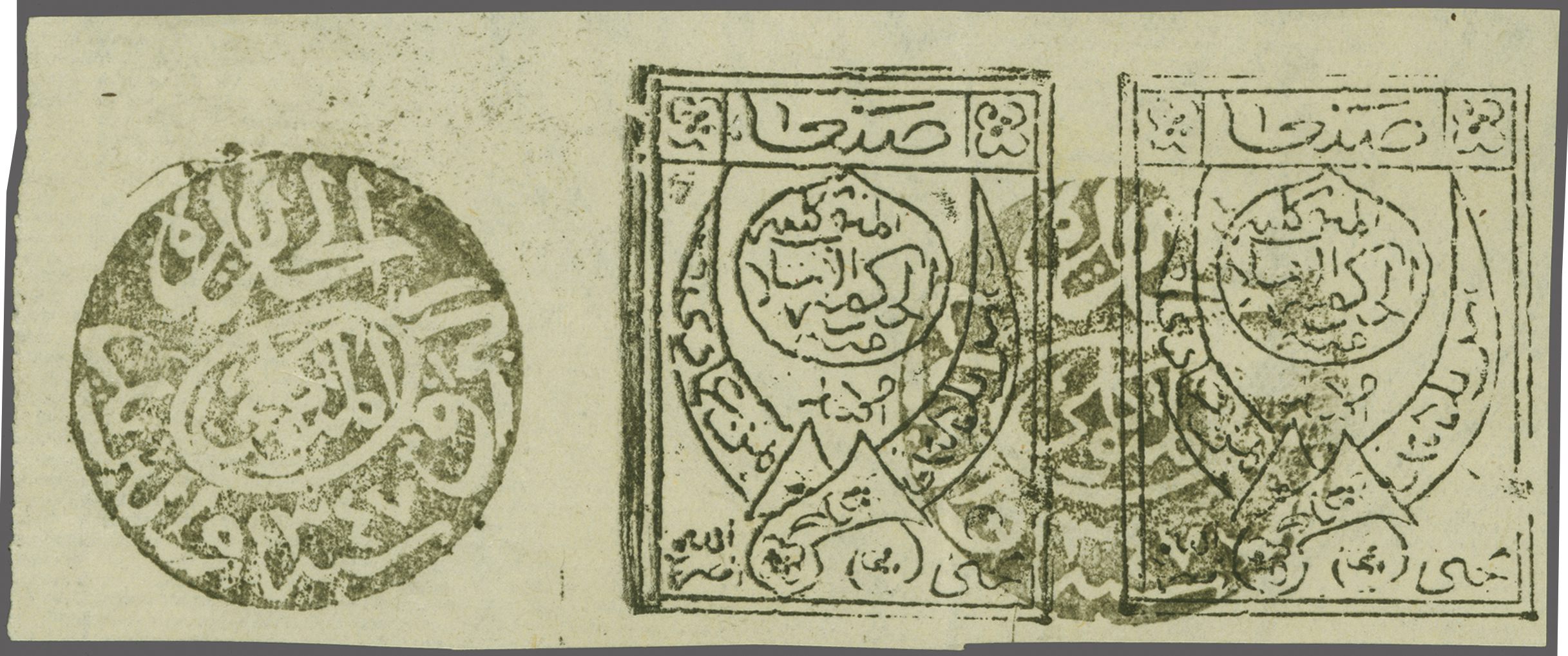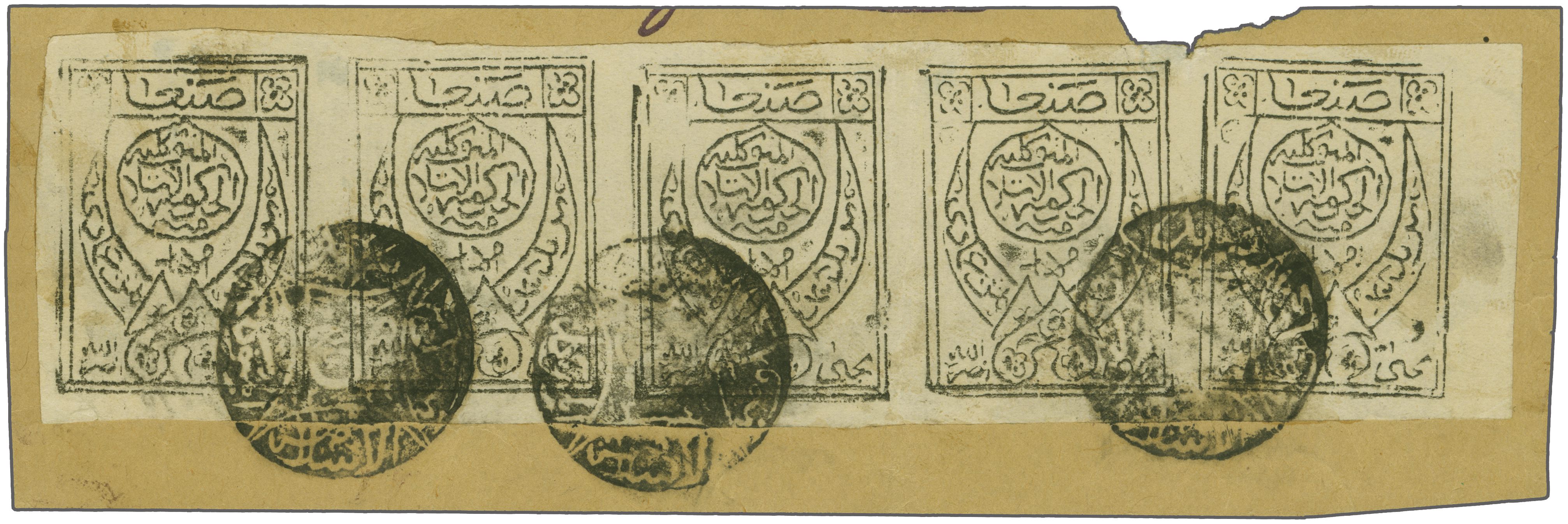 1112 piece image1926: Inland Postage, 5 b. black on white, imperforate on horizontally laid paper, a used horizontal strip of five with large margins all round (positions 11-15) on piece, cancelled by three strikes of circular "SANA'A" negative seal handstamps (Type 1) in black. Minor imperfections but rare. Provenance: Collection Harry Hibbert, Harmers, London, 10-11 March 1987, lot 984 (Image 1) (Image 2)