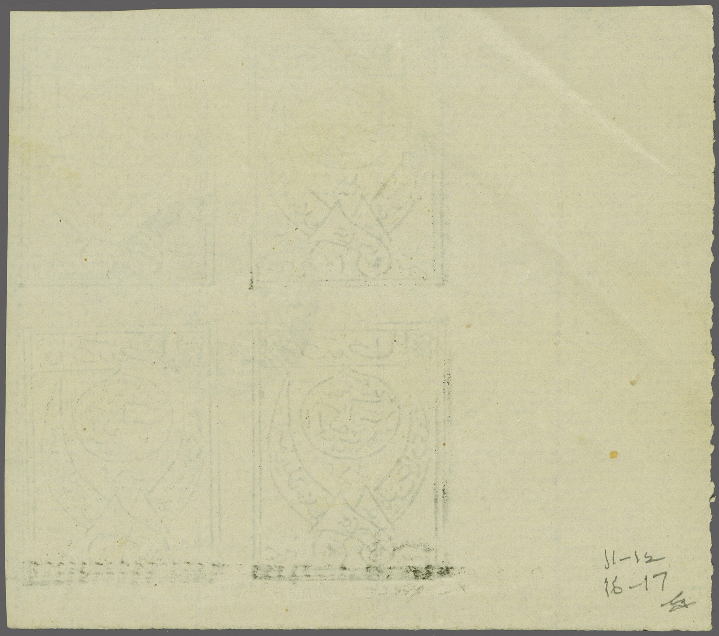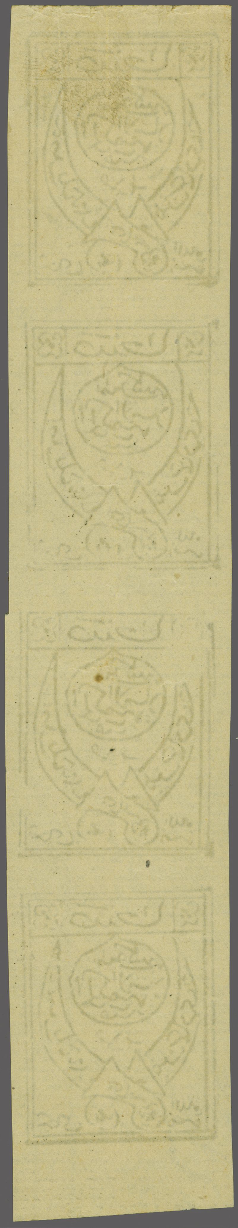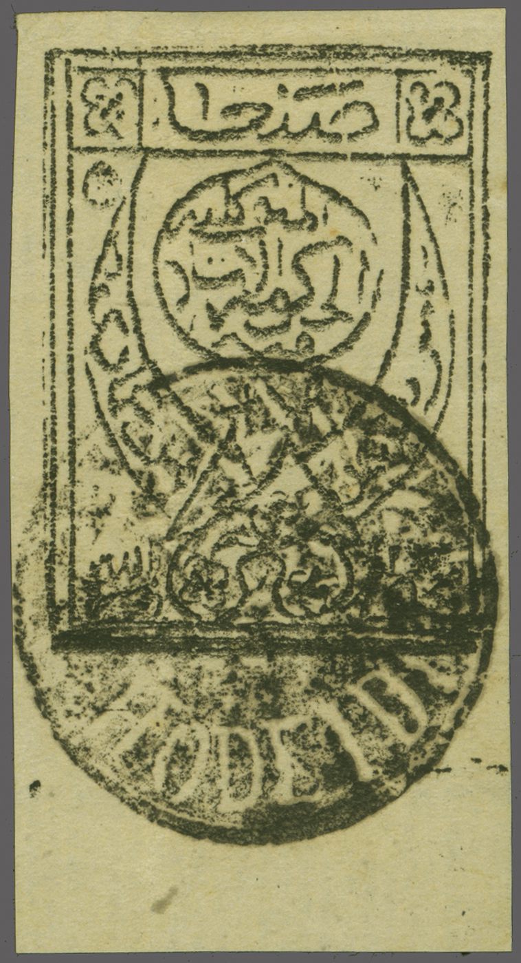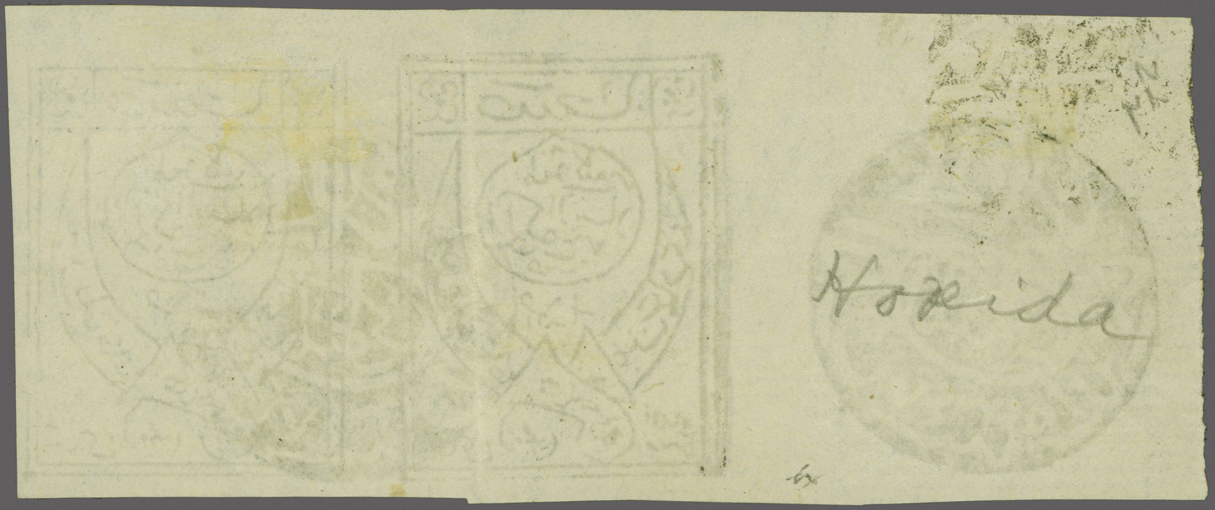 1108 image1926: Inland Postage, 5 b. black on white, imperforate on horizontally laid paper, a used horizontal pair (position 11-12), sheet marginal at left with good margins all round, cancelled by two strikes of circular "HODEIDA" negative seal (Type 1) in black. Ironed vertical crease not impacting the exquisite appearance Gi = £ 180+. Provenance: Collection C. Angus Parker, Cavendish, Derby, 22 April 2009, lot 177 (Image 1) (Image 2)