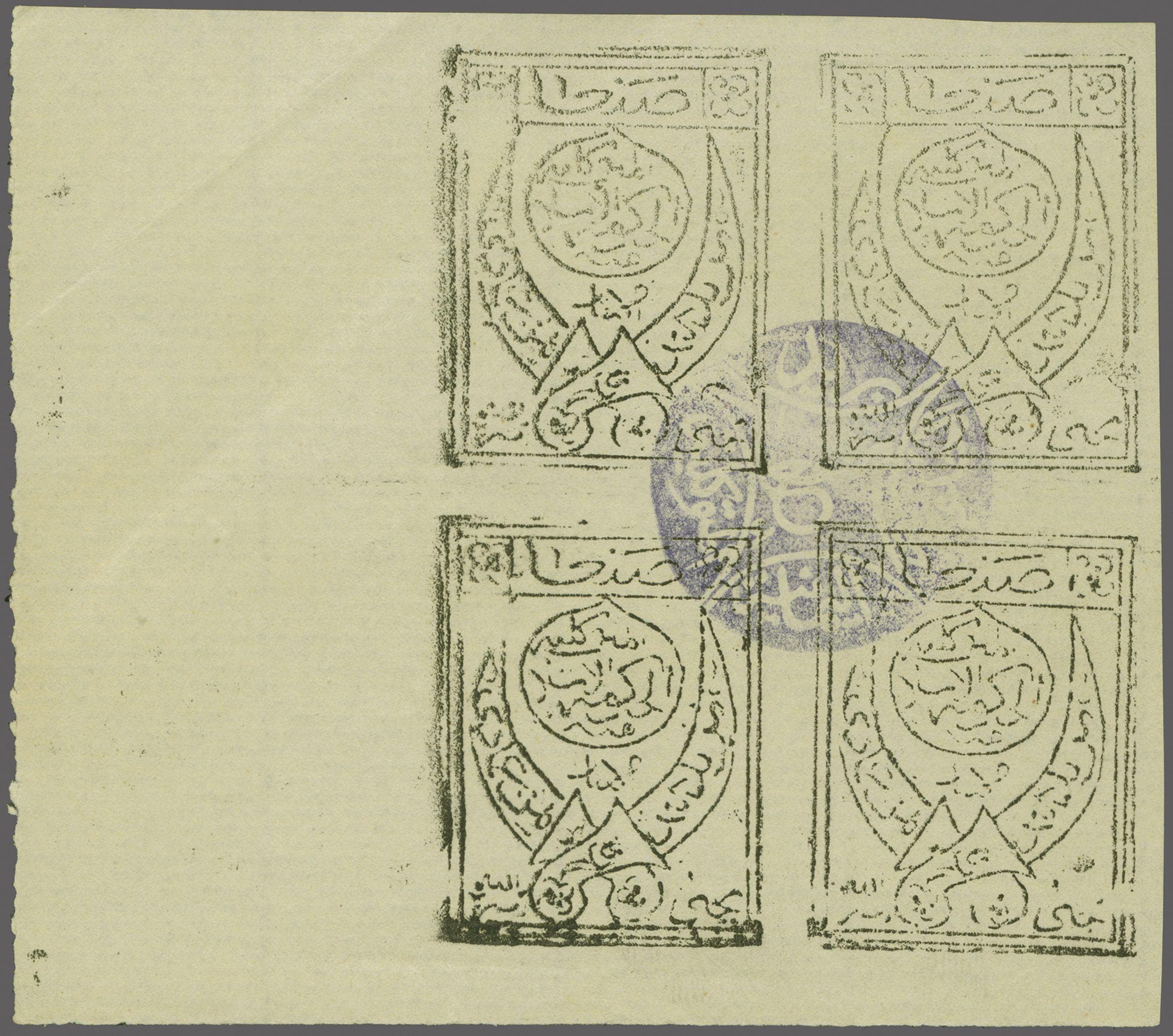 1109 bof image1926: Inland Postage, 5 b. black on white, imperforate on horizontally laid paper, a sheet marginal block of four (positions 11-12 / 16-17), large margins all round, cancelled centrally by circular "SANA'A" negative seal handstamp (Type 1) in violet. Two minor diagonal bends but scarce and most attractive Gi = £ 360+ (Image 1) (Image 2)