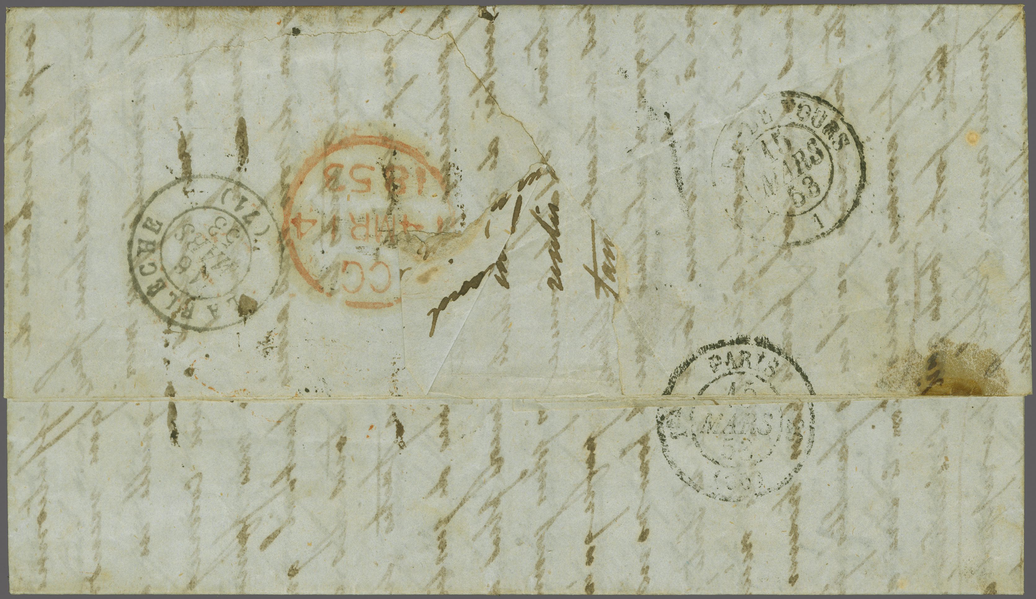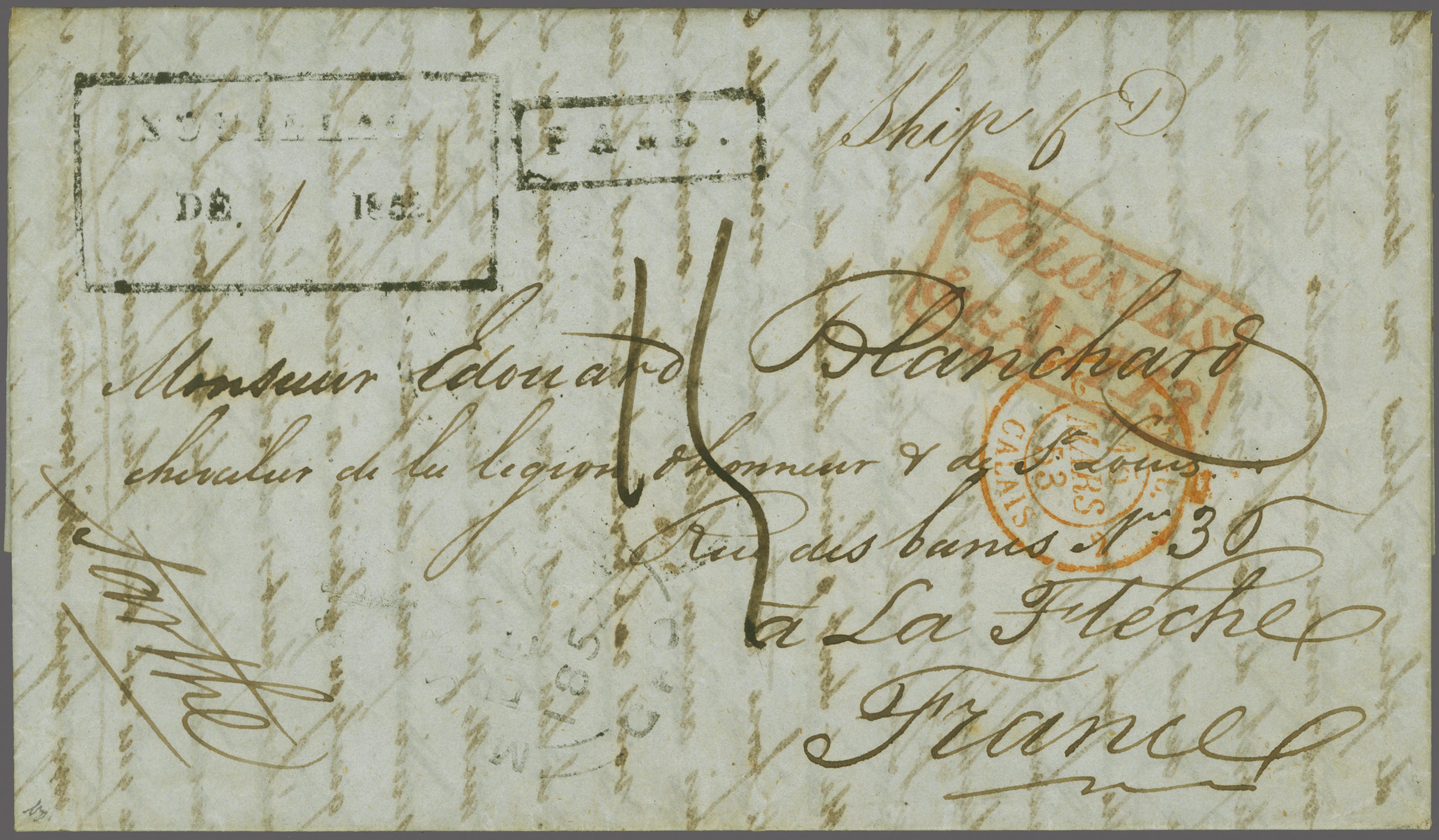 alongside (Inland fee of 2 d. + 4 d. Ship fee). "♚ / Mauritius / GPO" cds lightly struck in black of transit, thence via London (March 14) where "COLONIES / &C. ART 13." Accountancy marking applied in red. Charged "15" décimes due to pay upon