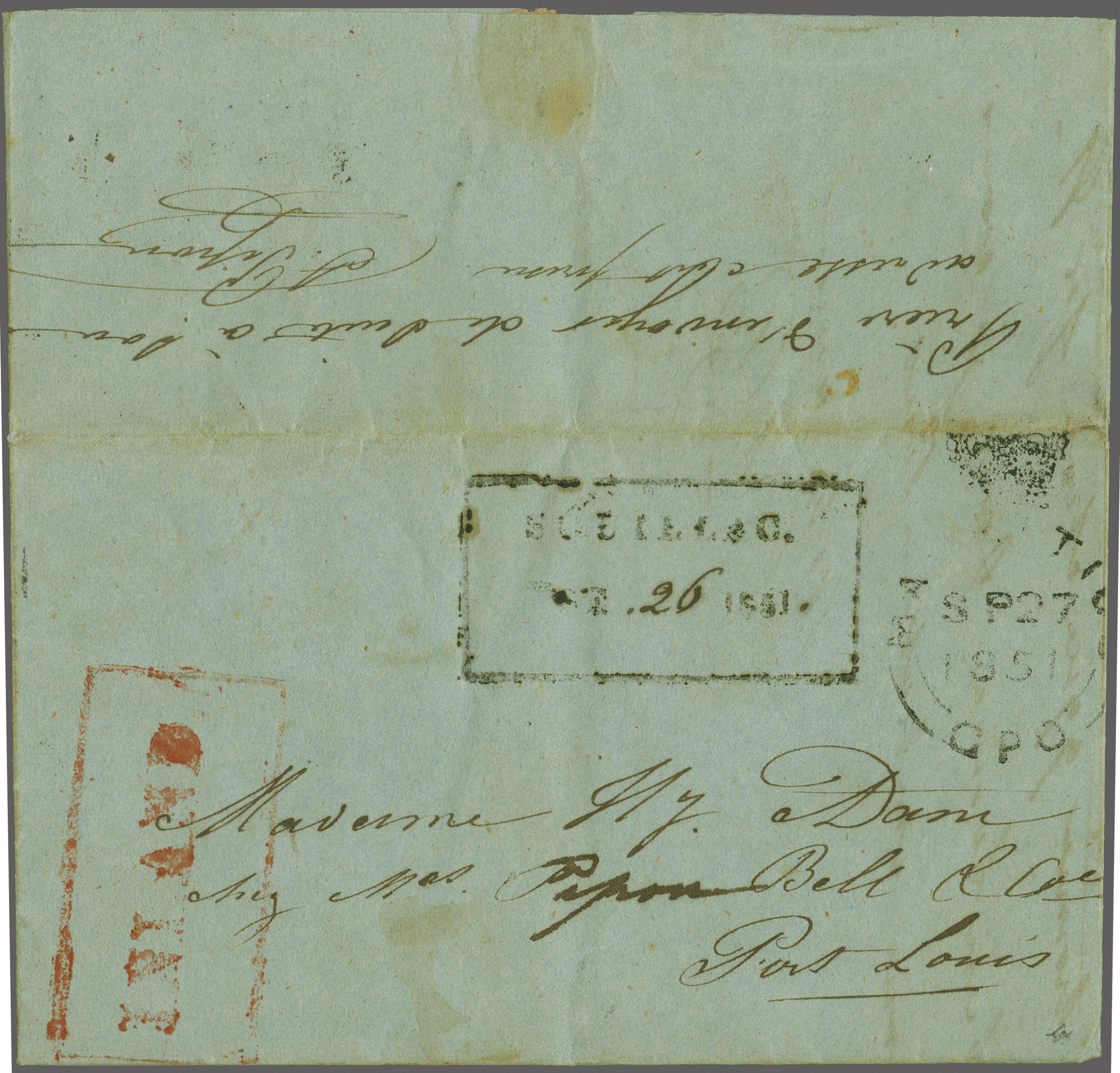 1851 (Sept 26): Entire letter from Souillac to Port Louis struck with fine framed "SOUILLAC" despatch hanmdstamp in black (Proud D1) with day in manuscript; with manuscript notation on reverse "Prière d'envoyer de suite à son