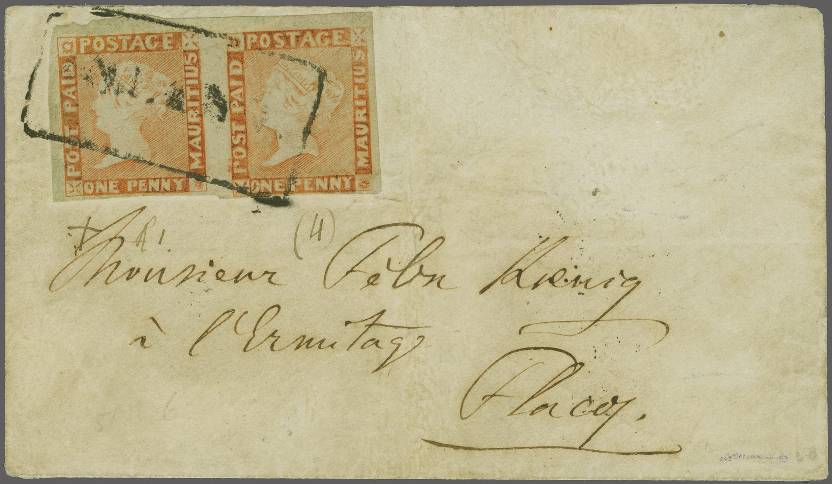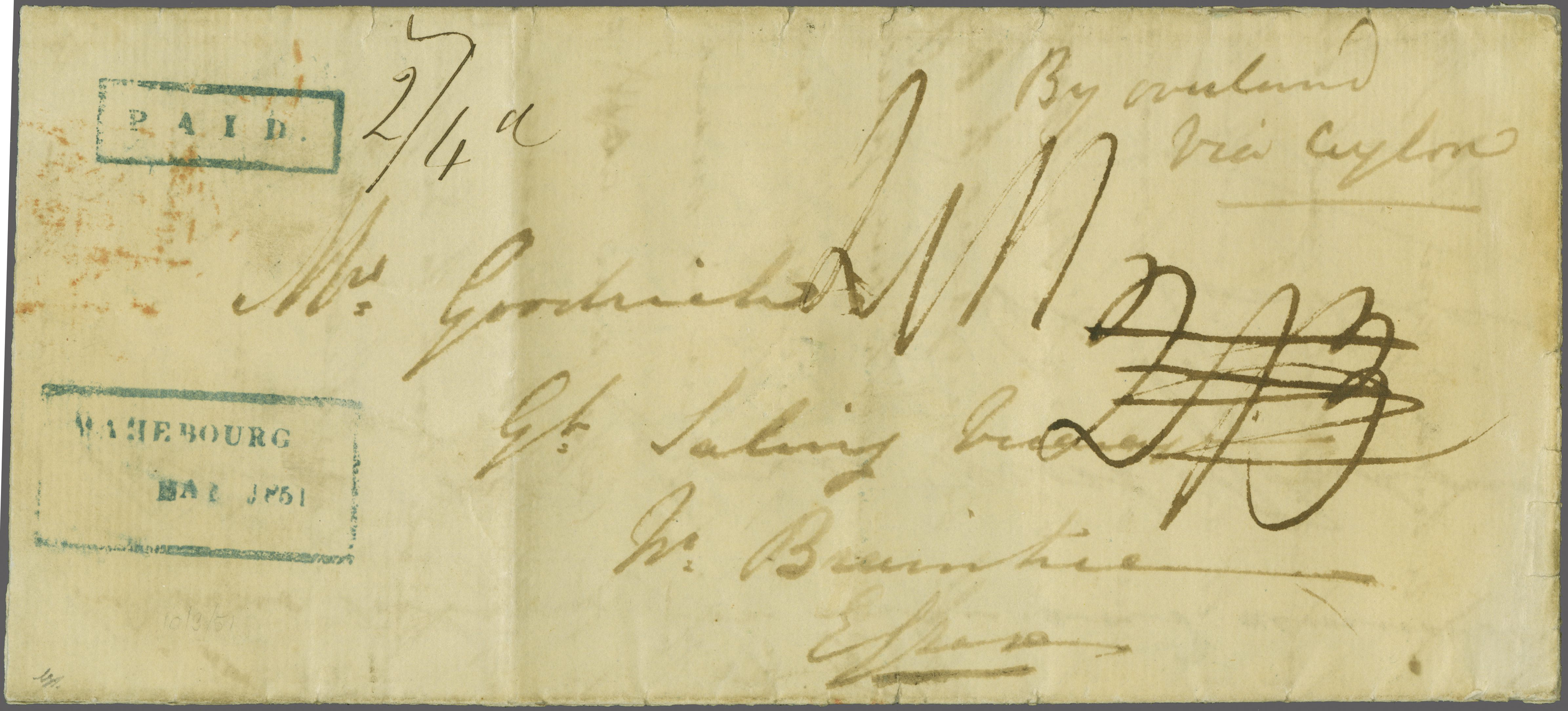 1851 (March 10): Entire letter from Mahebourg to Braintree, Essex endorsed "By Overland via Ceylon", the letter mentions enclosures; struck with fine strikes of framed "PAID" and "MAHEBOURG" datestamp of despatch (with