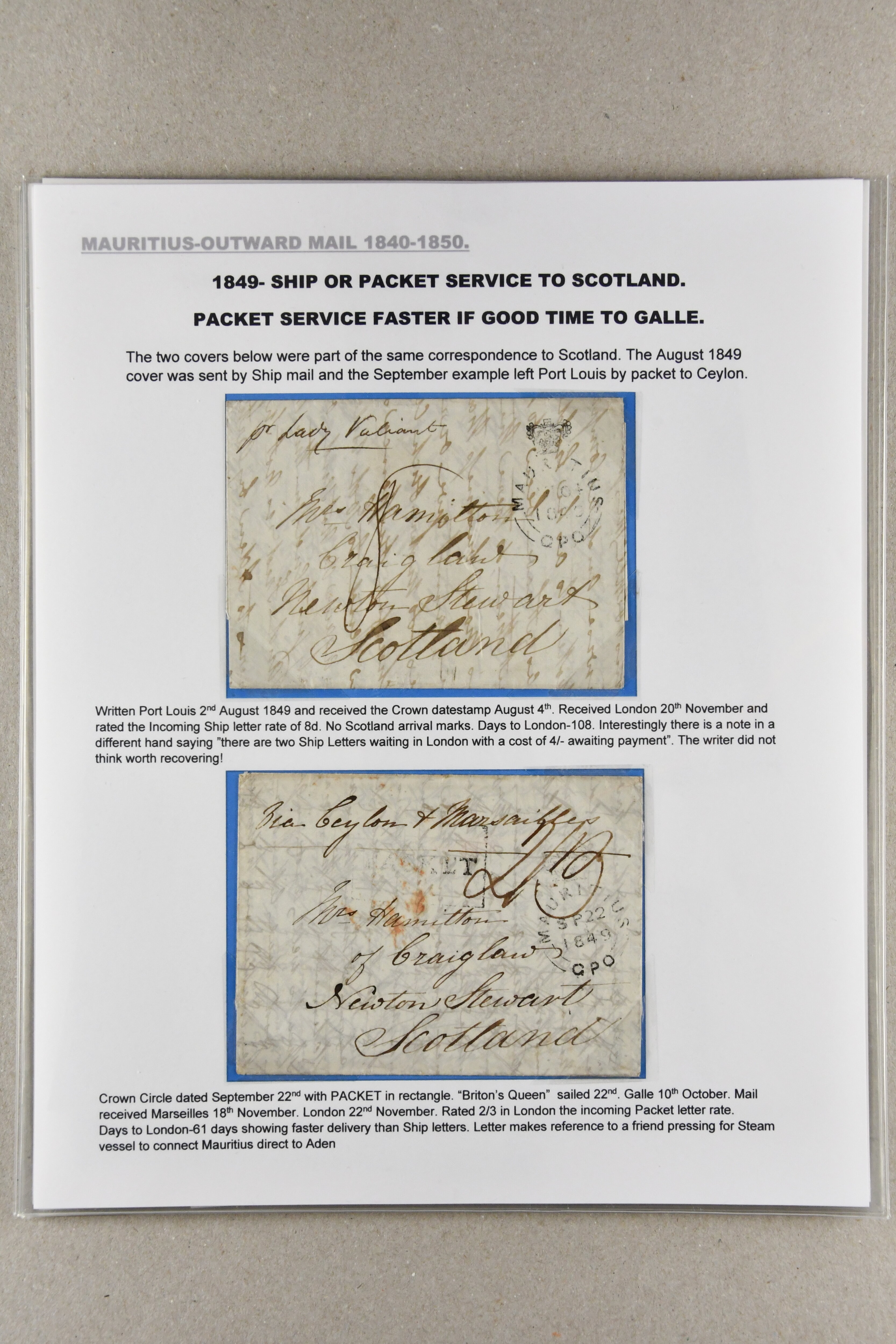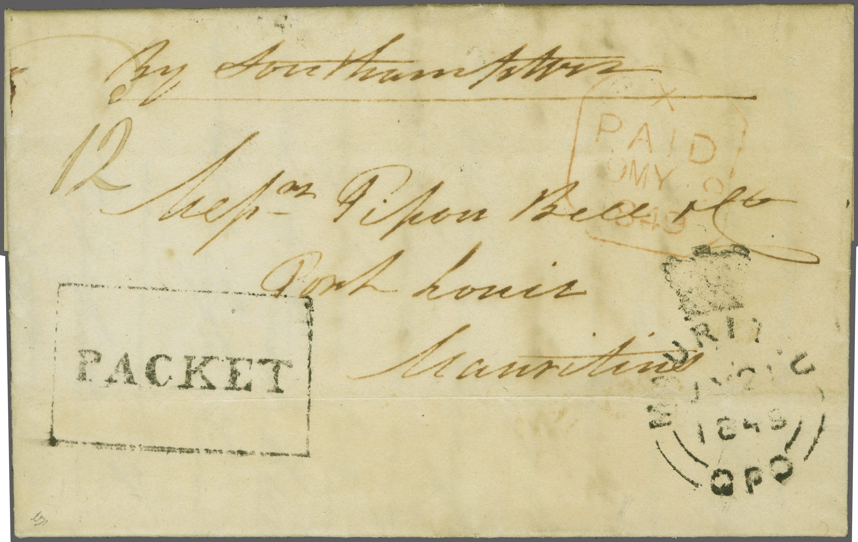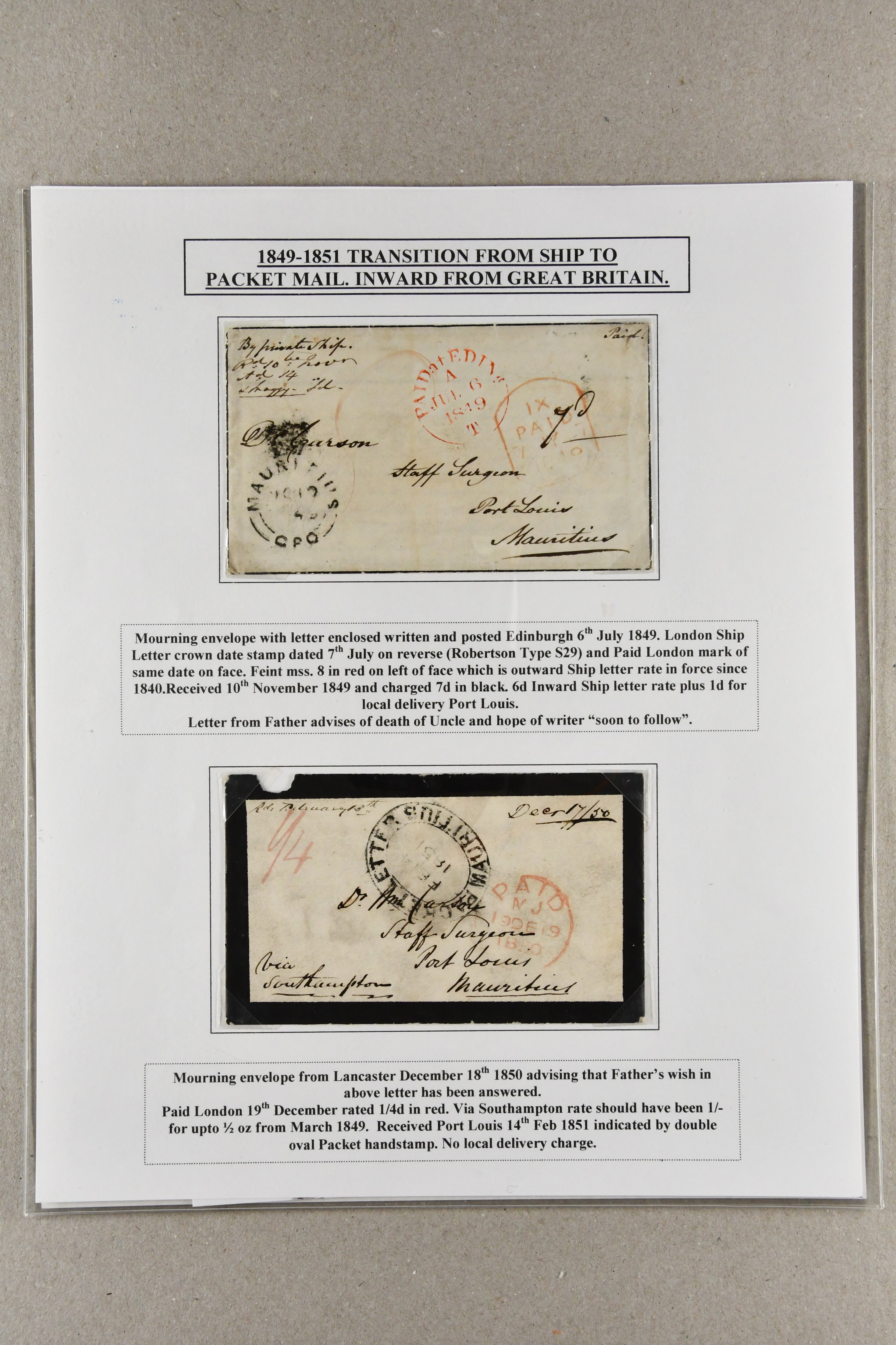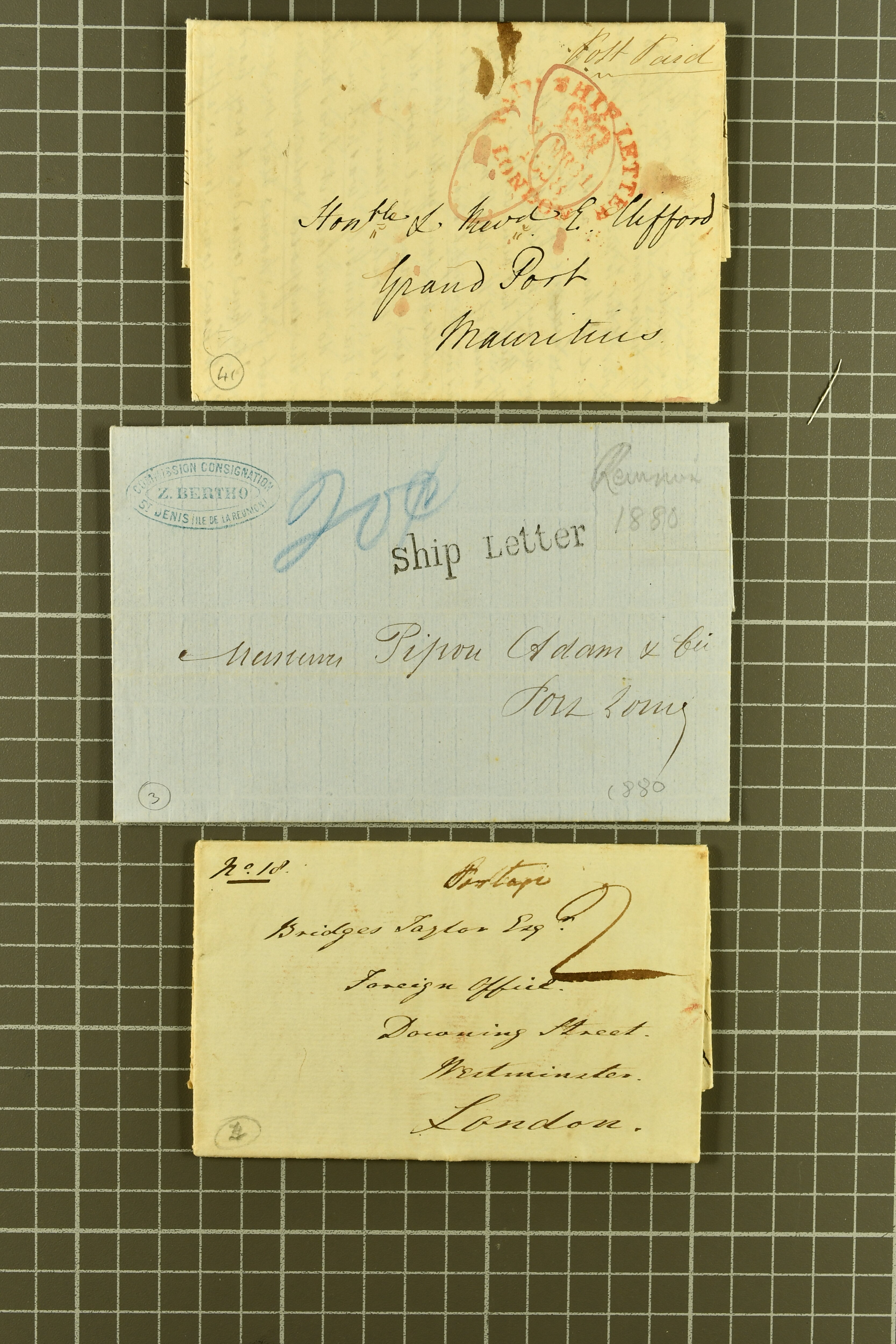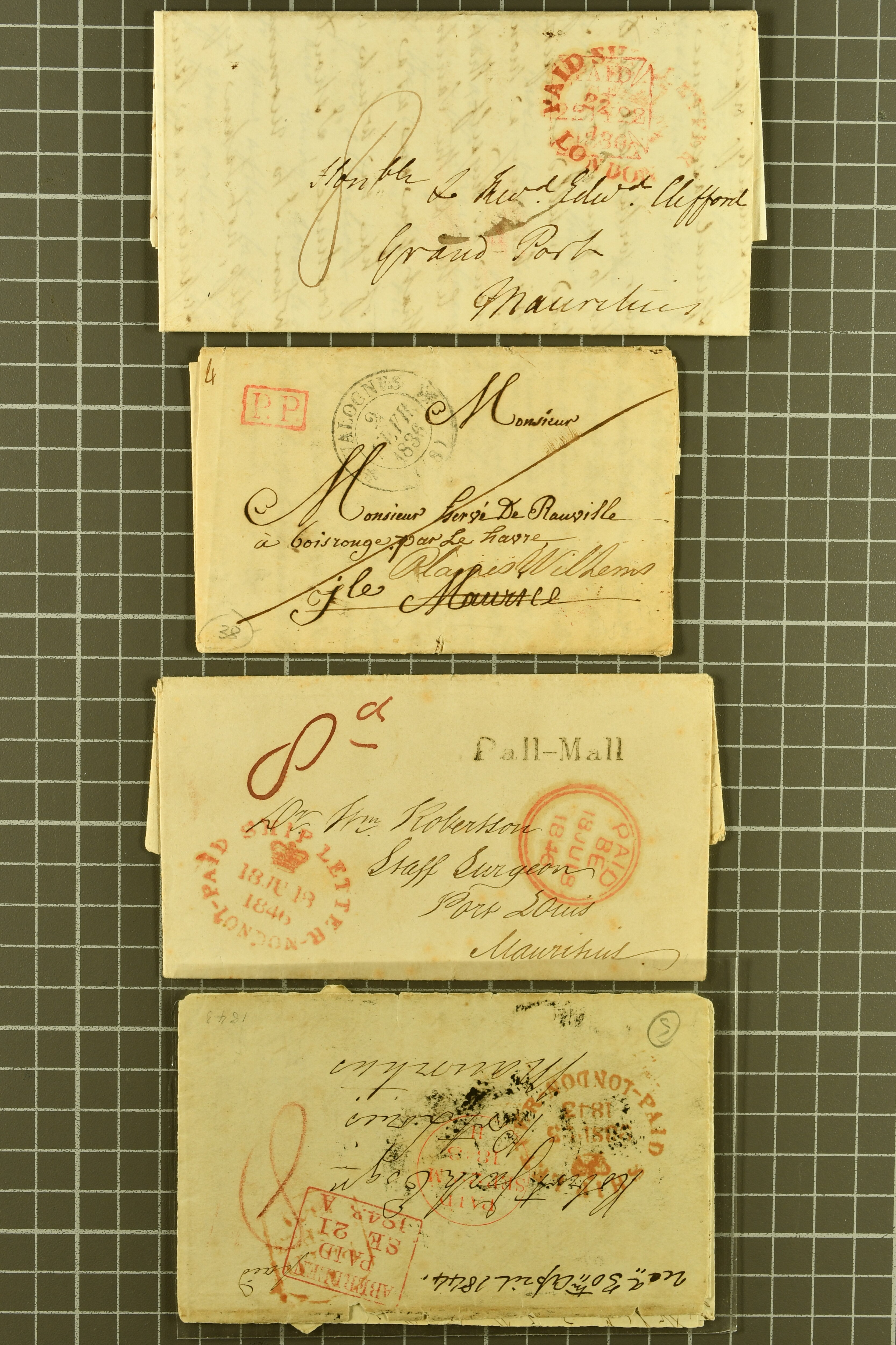"MAURITIUS / POST OFFICE" cds of receipt in red (both ex Clifford correspondence); 1843 prepaid entire from Aberdeen; 1846 prepaid entire from London also struck with "PAID SHIP LETTER / ♚ / LONDON" in red, this last with "MAURITIUS / POST OFFICE"