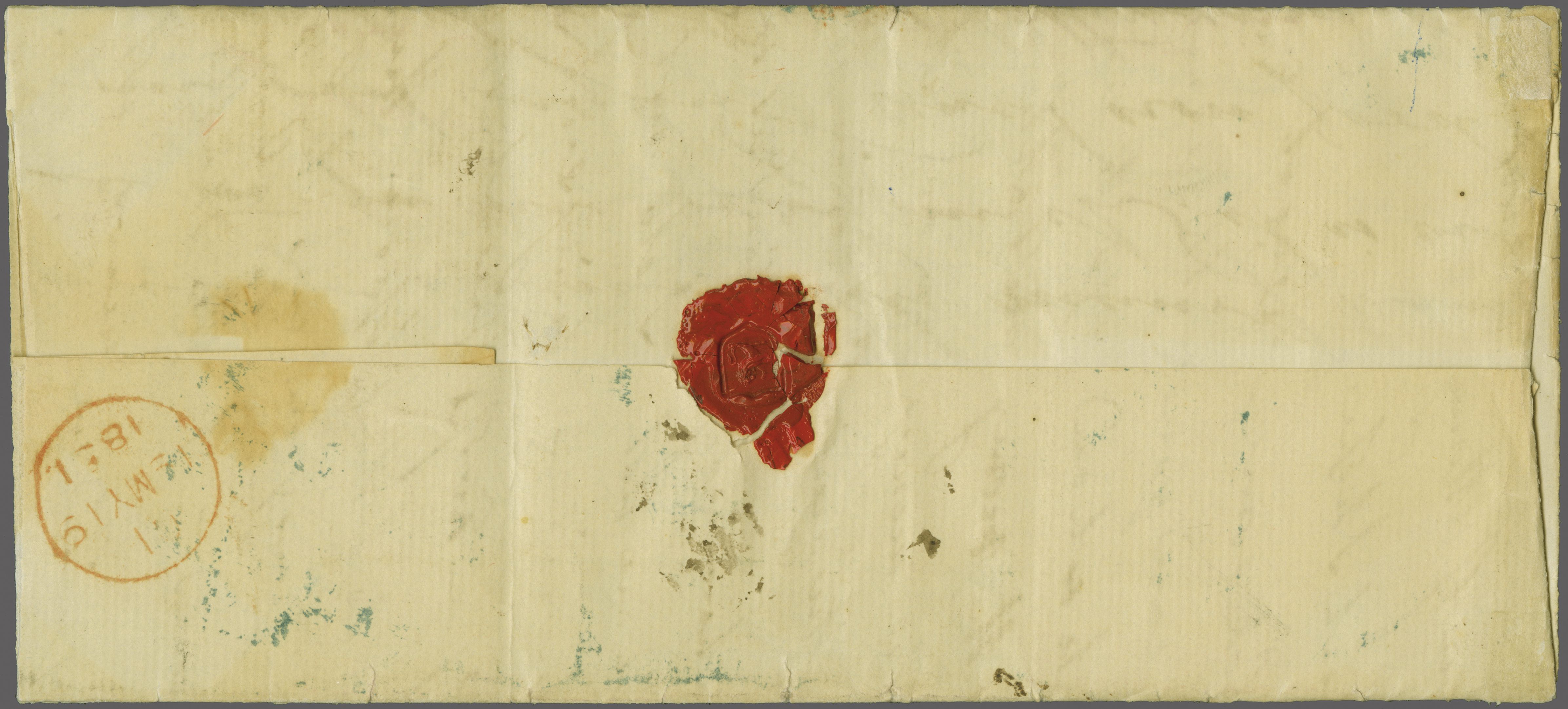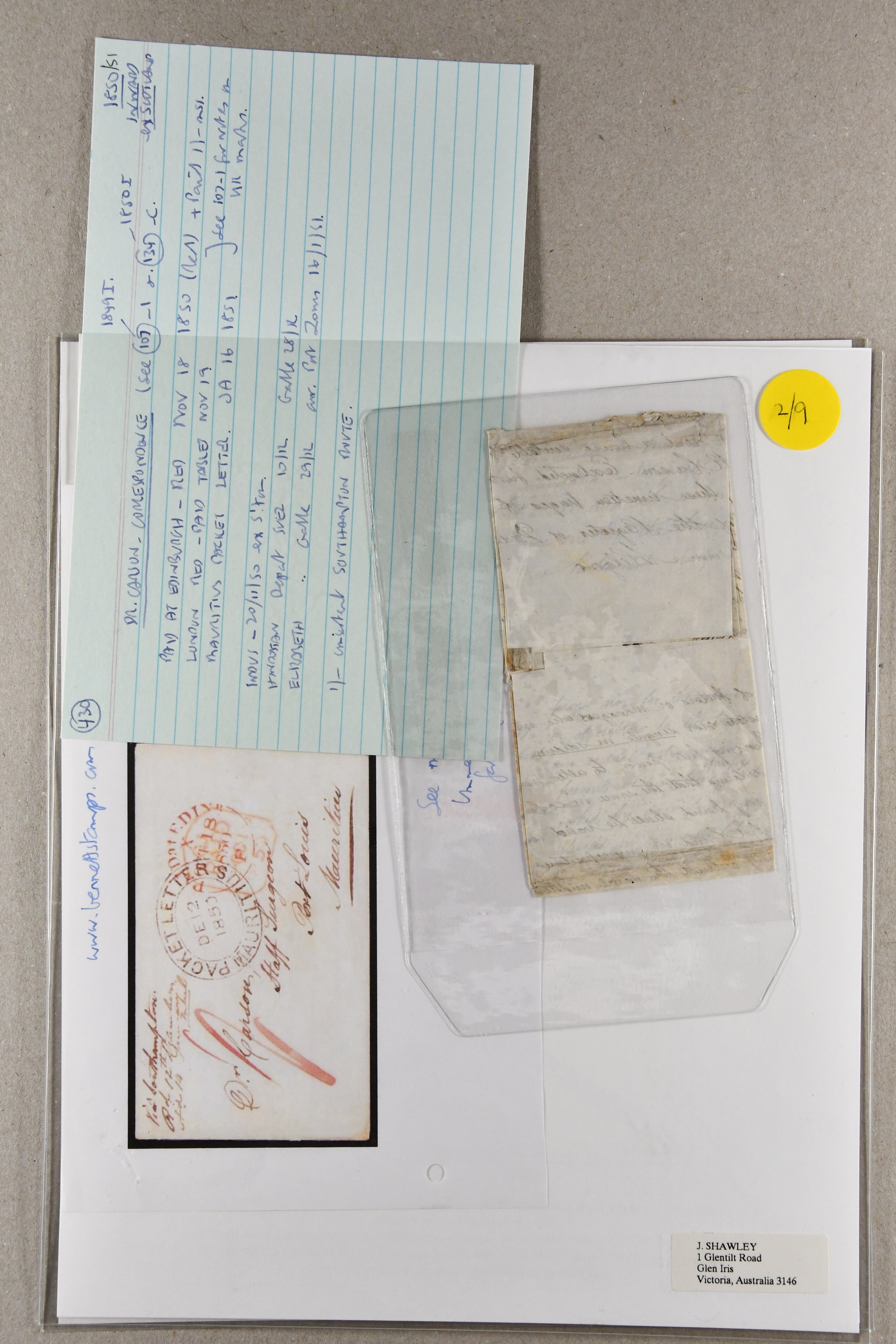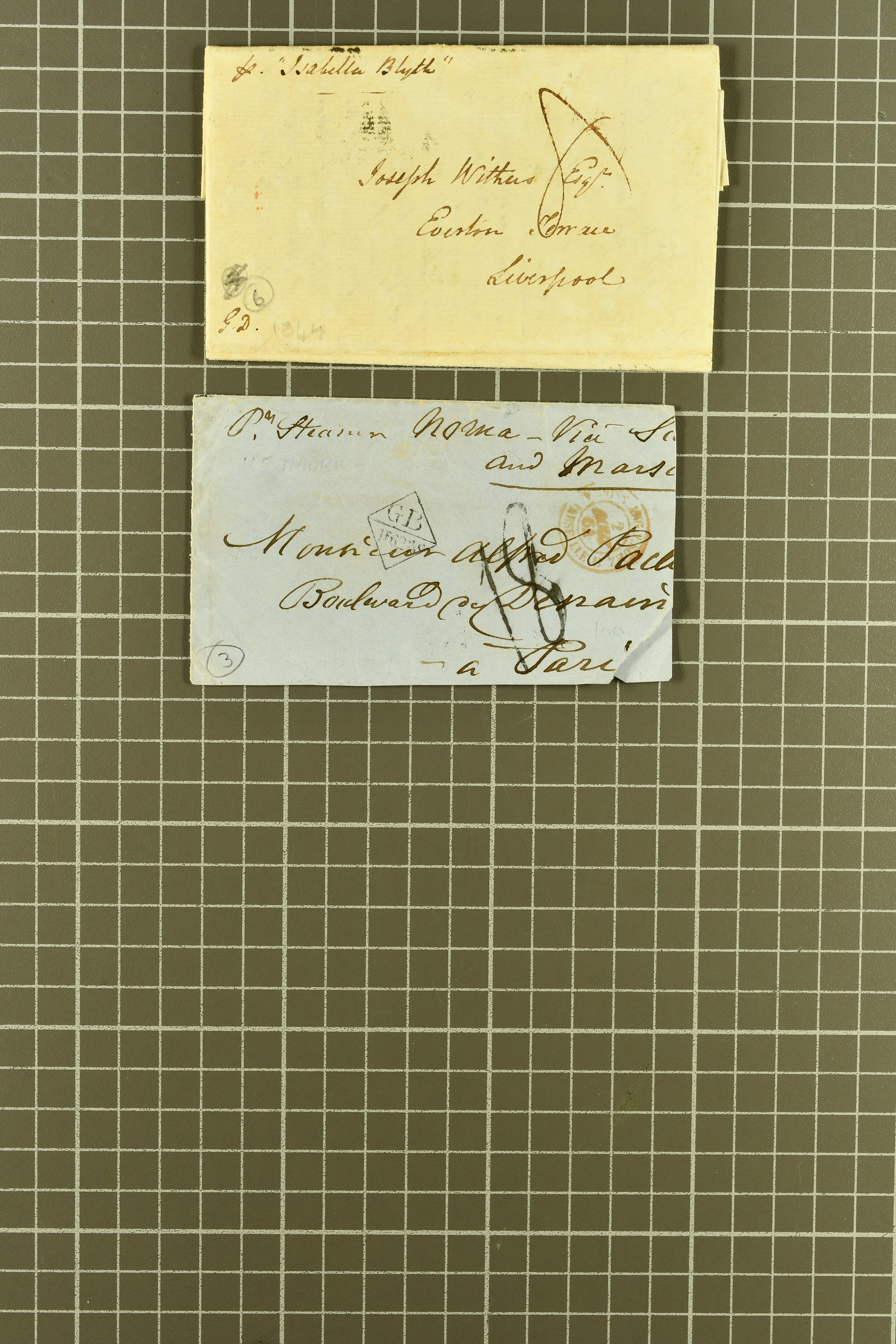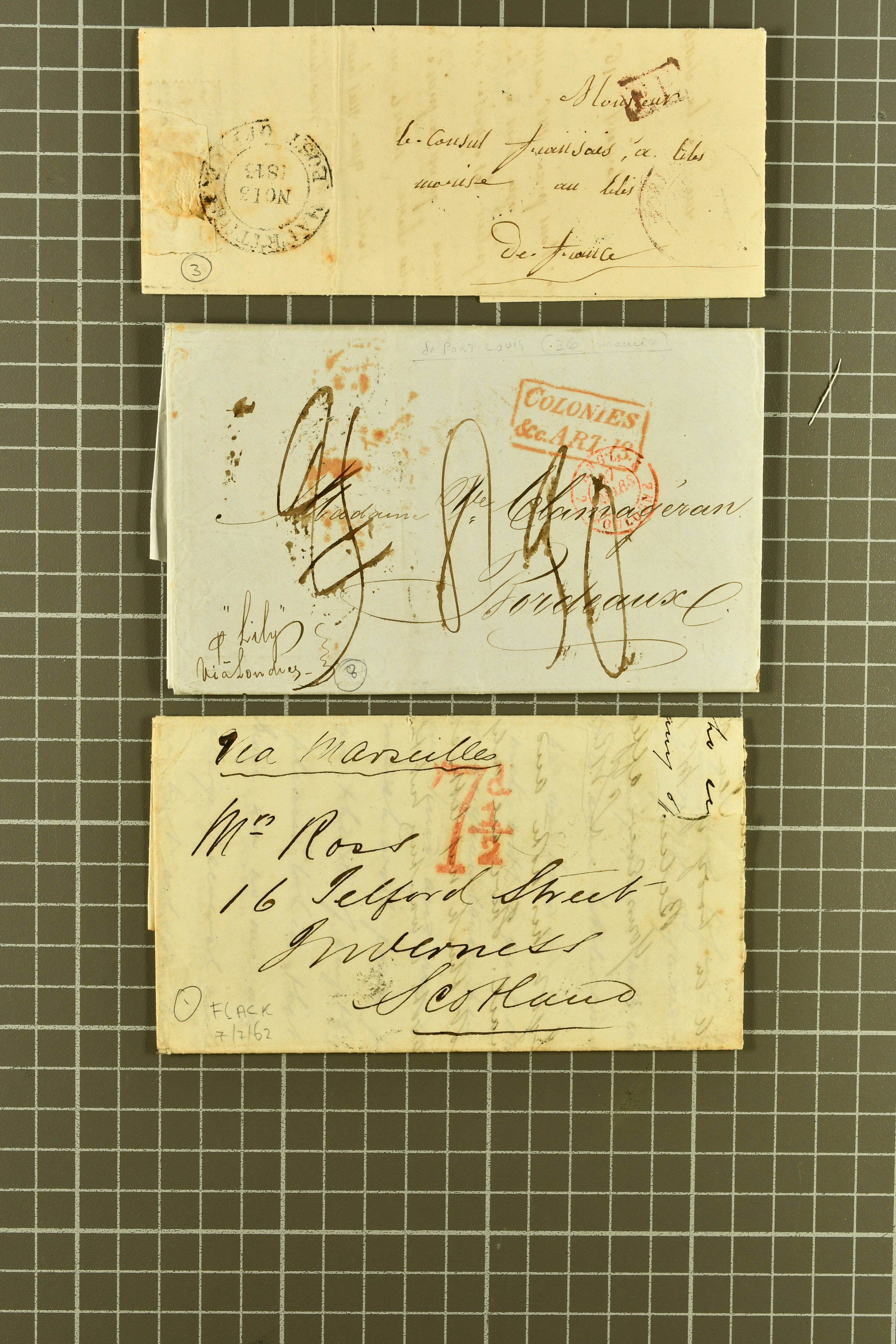 "MAURITIUS / POST OFFICE" cds of receipt in red (both ex Clifford correspondence); 1843 prepaid entire from Aberdeen; 1846 prepaid entire from London also struck with "PAID SHIP LETTER / ♚ / LONDON" in red, this last with "MAURITIUS / POST OFFICE"