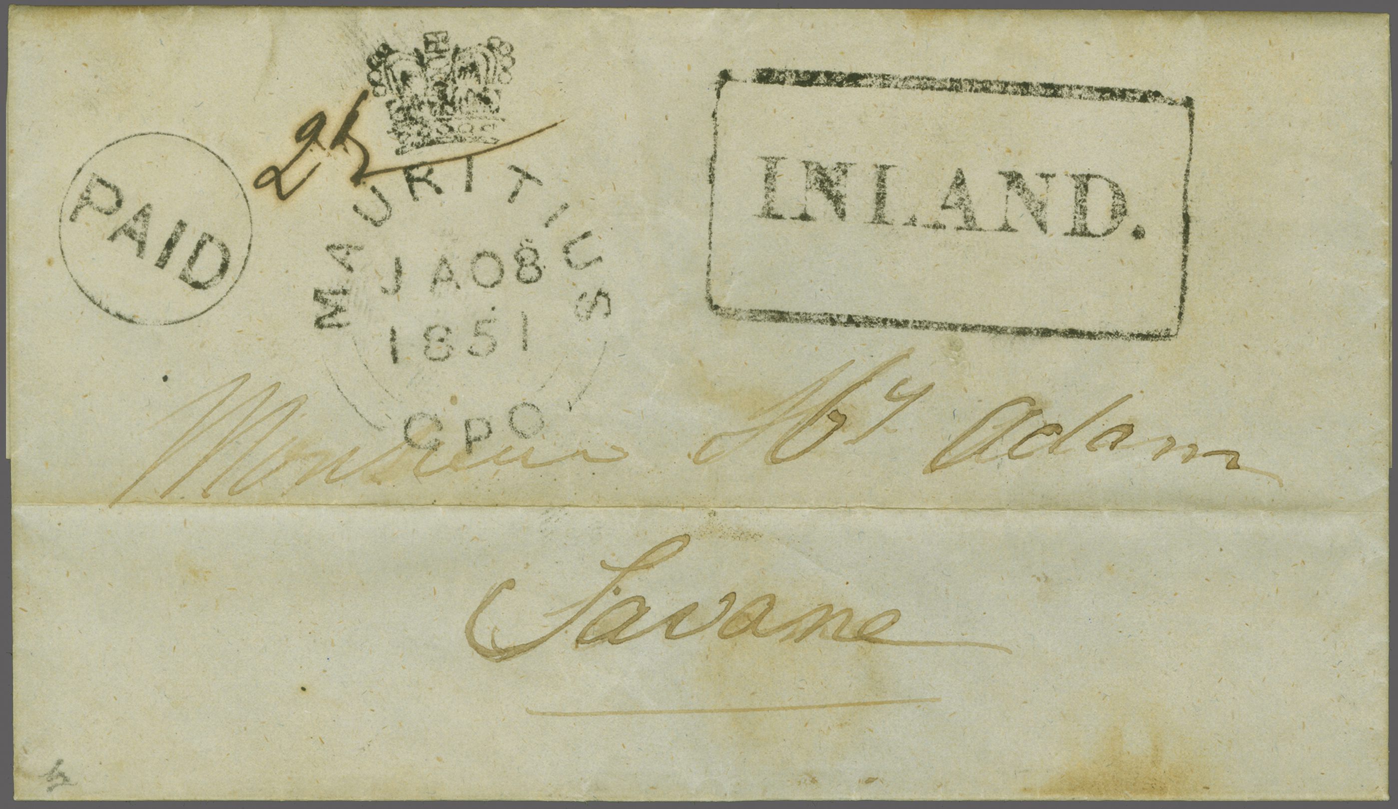 1851 (Jan 8): Entire letter from Port Louis to Savane struck with scarce early usage of circular "PAID" (Proud fig. PD4) - second month of use, superb "♚ / MAURITIUS / GPO" cds and equally fine framed "INLAND" all in black,
