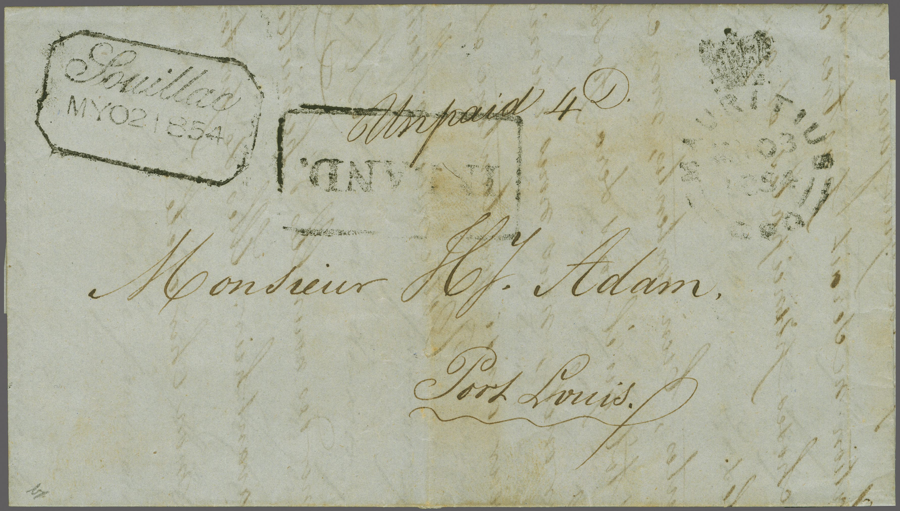 manuscript "Unpaid 4d." alongside; with framed INLAND and "♚ / MAURITIUS / GPO" cds if receipt (May 3) at right. Minor file folds but a rare entire with the "Souillac" strike exquisite. Note: The Souillac handstamp is the example illustrated in the