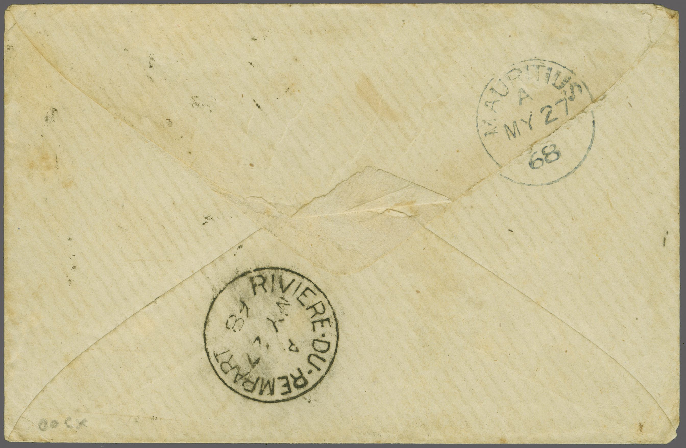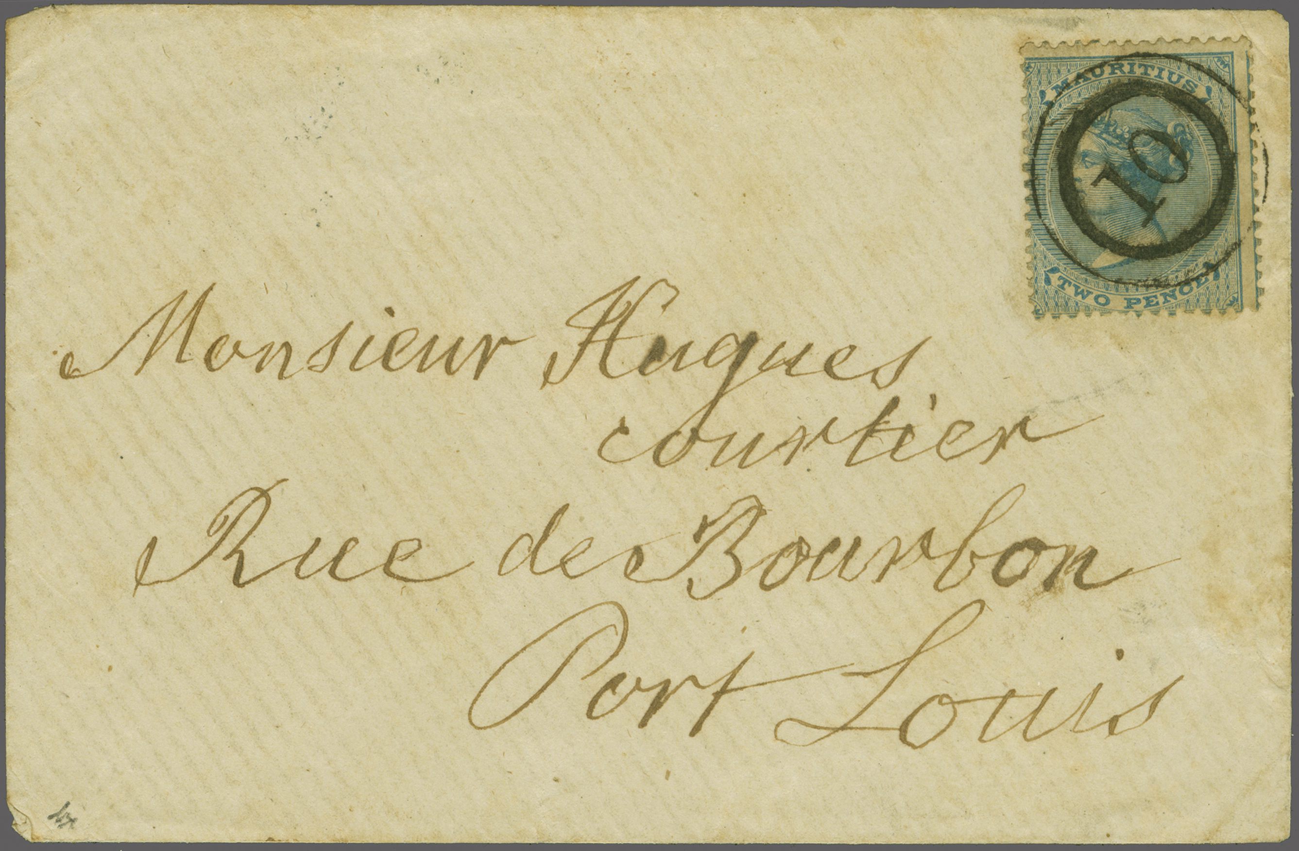 1863/72: 2 d. pale blue, wmk. Crown CC, a used example on 1868 cover to Port Louis tied by ciruclar numeral "10" handstamp of Rivière du Rempart (Proud fig. K1) - the latest recorded usage. Reverse with fine Riviere du Rempart