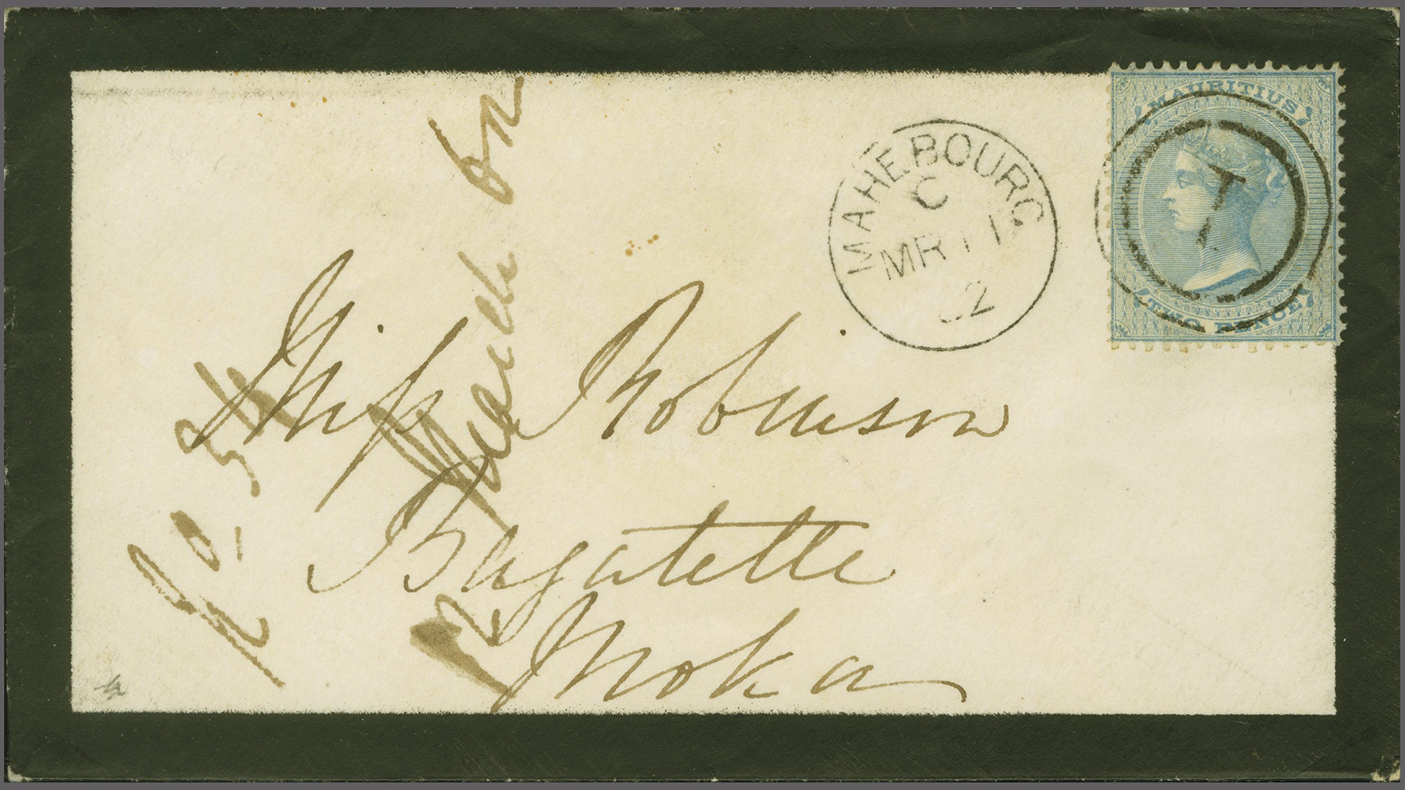 1860/63: 2 d. blue, a single example used on local 1862 mourning envelope to Bagatelle, Moka tied by fine "1" circular numeral handstamp in black with "MAHEBOURG" cds (March 11) alongside (Proud fig. K2) - this being the