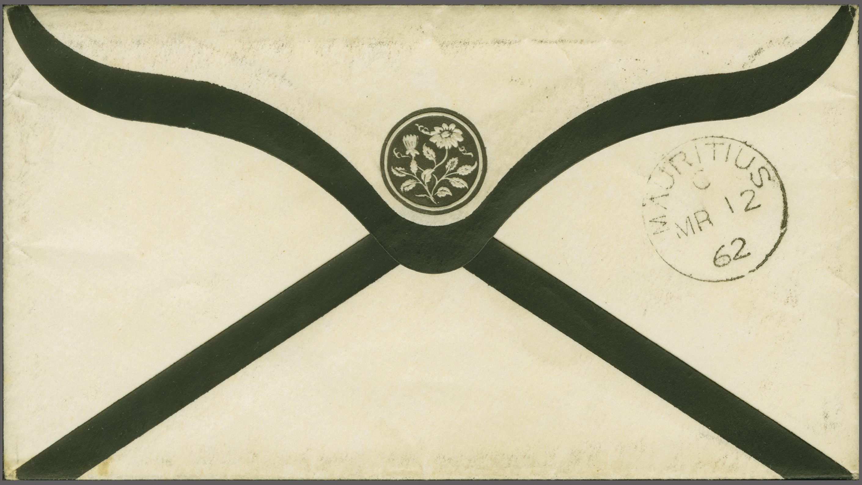 with "♚ / MAURITIUS / GPO" despatch cds (Jan 12) in black. The left stamp with repair to margin at upper left and the envelope restored but nevertheless of charming appearance (Image 1)