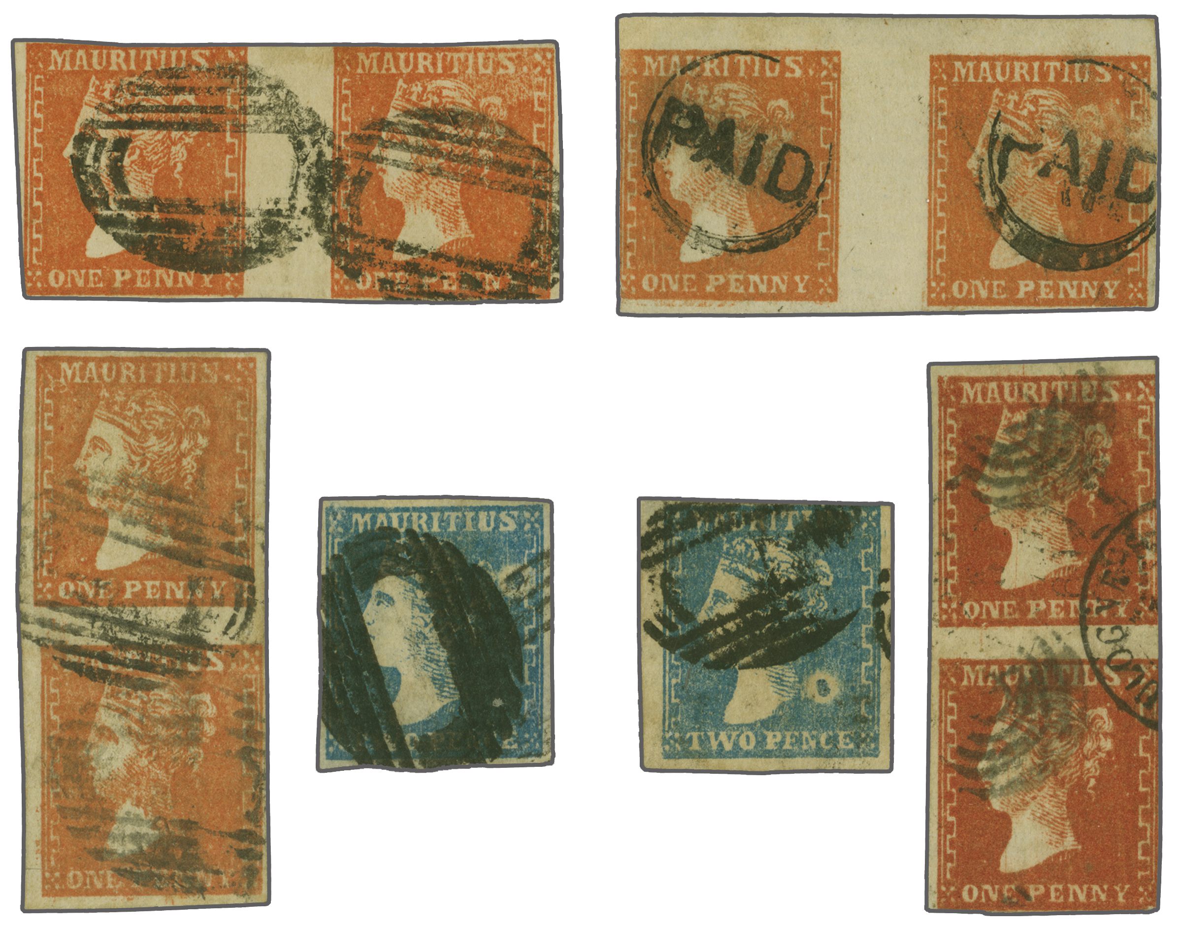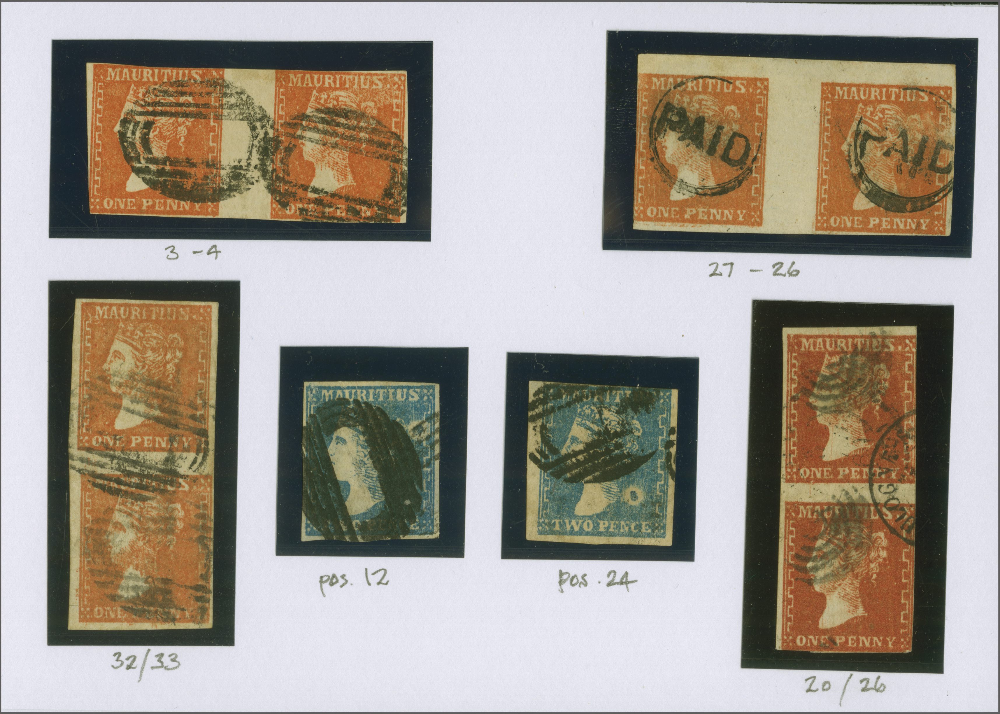 pair cancelled by target handstamps and part "Boulogne" cds (pos. 20/26); 1 d. vermilion horizontal pair with three good to large margins cancelled by circular "Paid" in black (pos. 27 and 26) and 1 d. vermilion in a vertical pair (pos. 32/33) on the