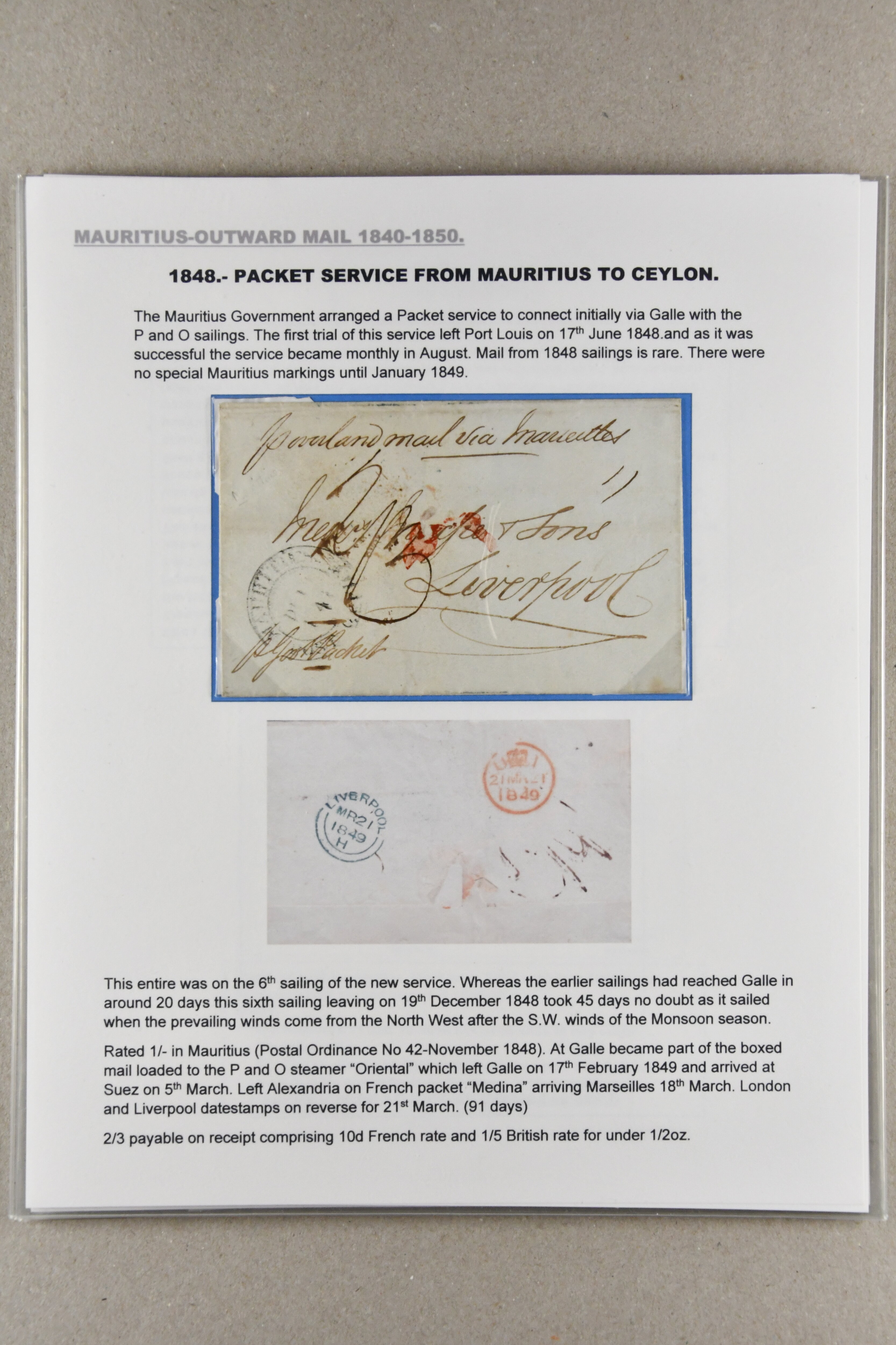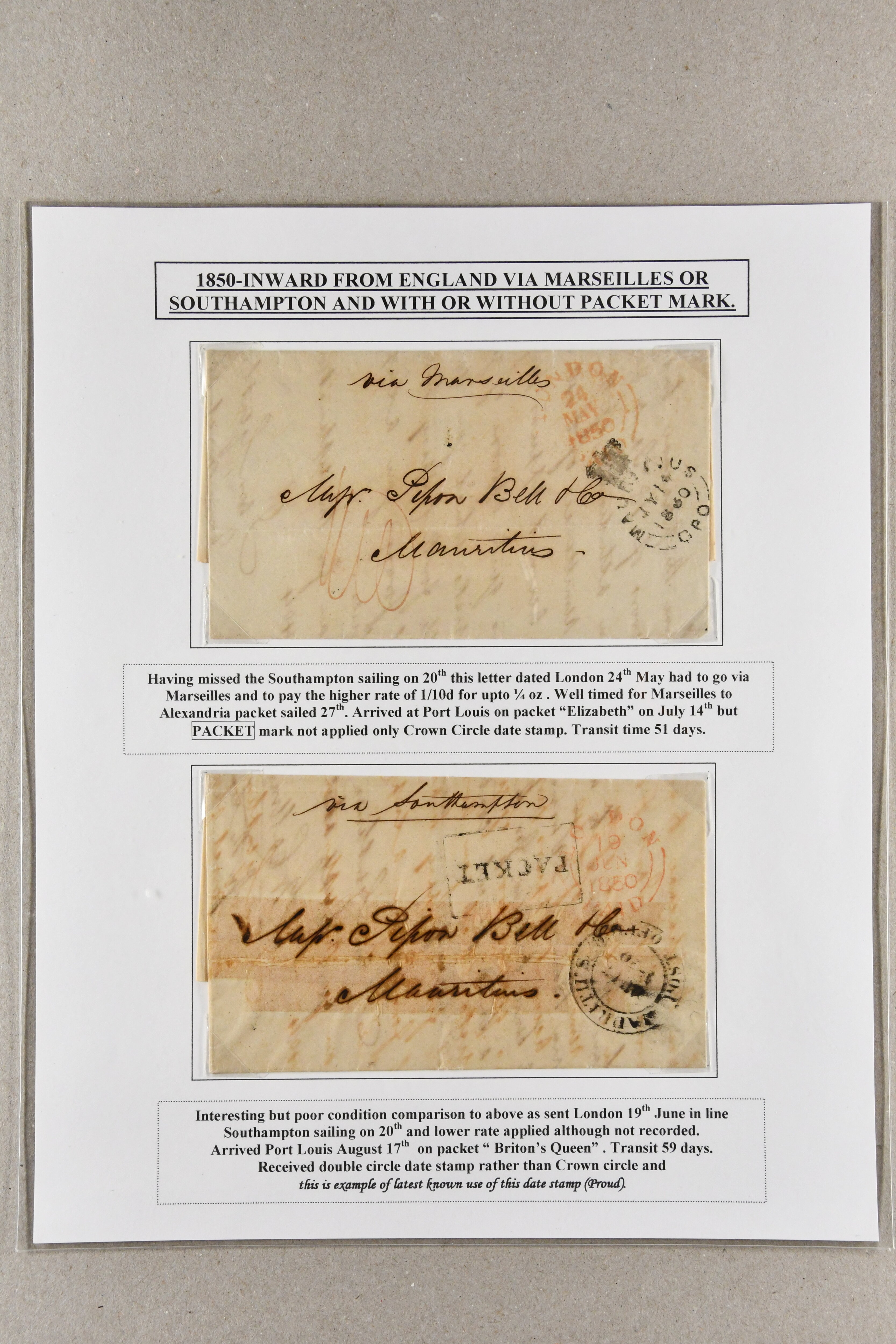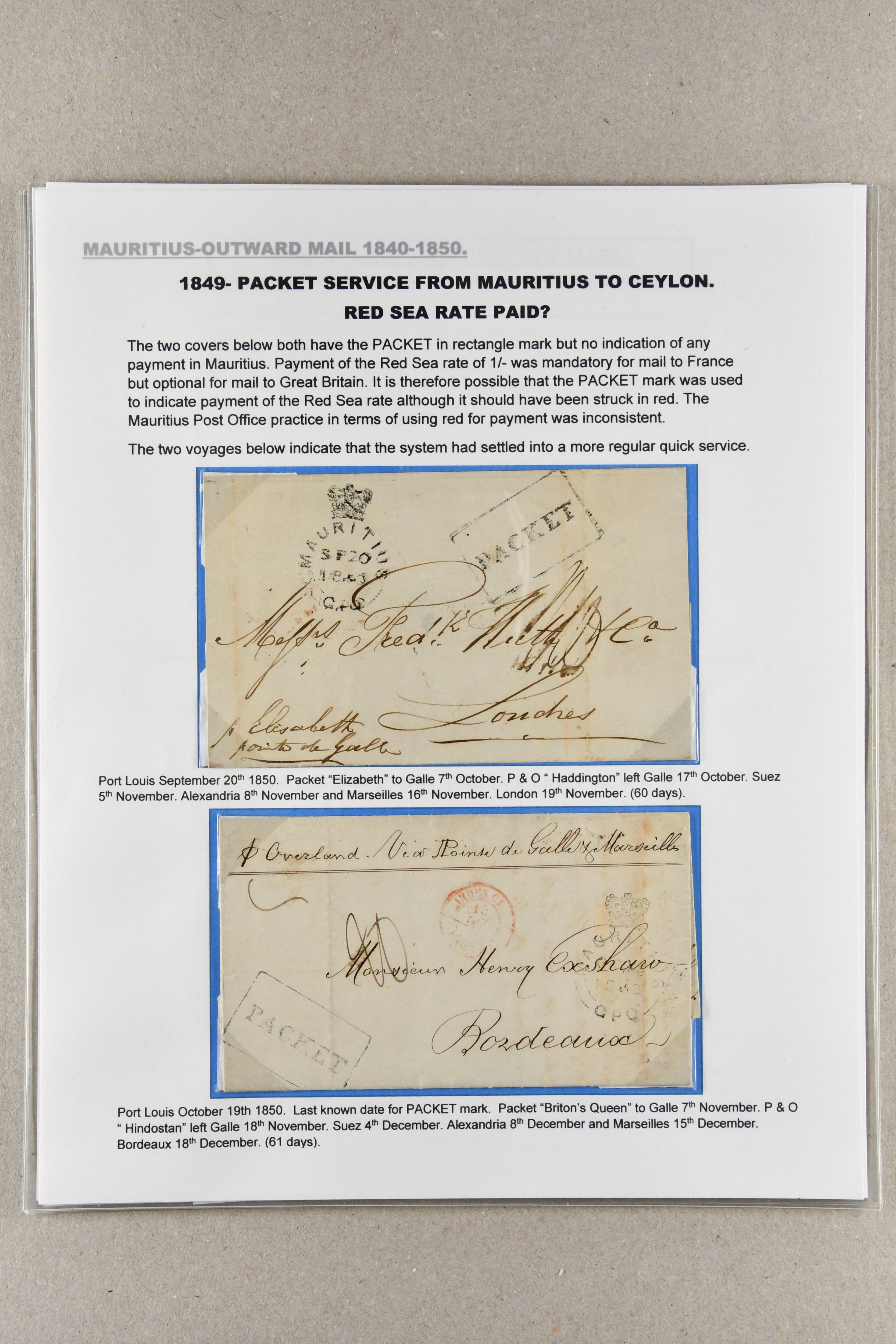 1848/1850: Packet Service from Mauritius via Ceylon and Red Sea and return; the collection on leaves with 16 April 1848 entire prepaid 2 s. in manuscript via Galle, Alexandria and Malta; 16 Oct 1848 entire to