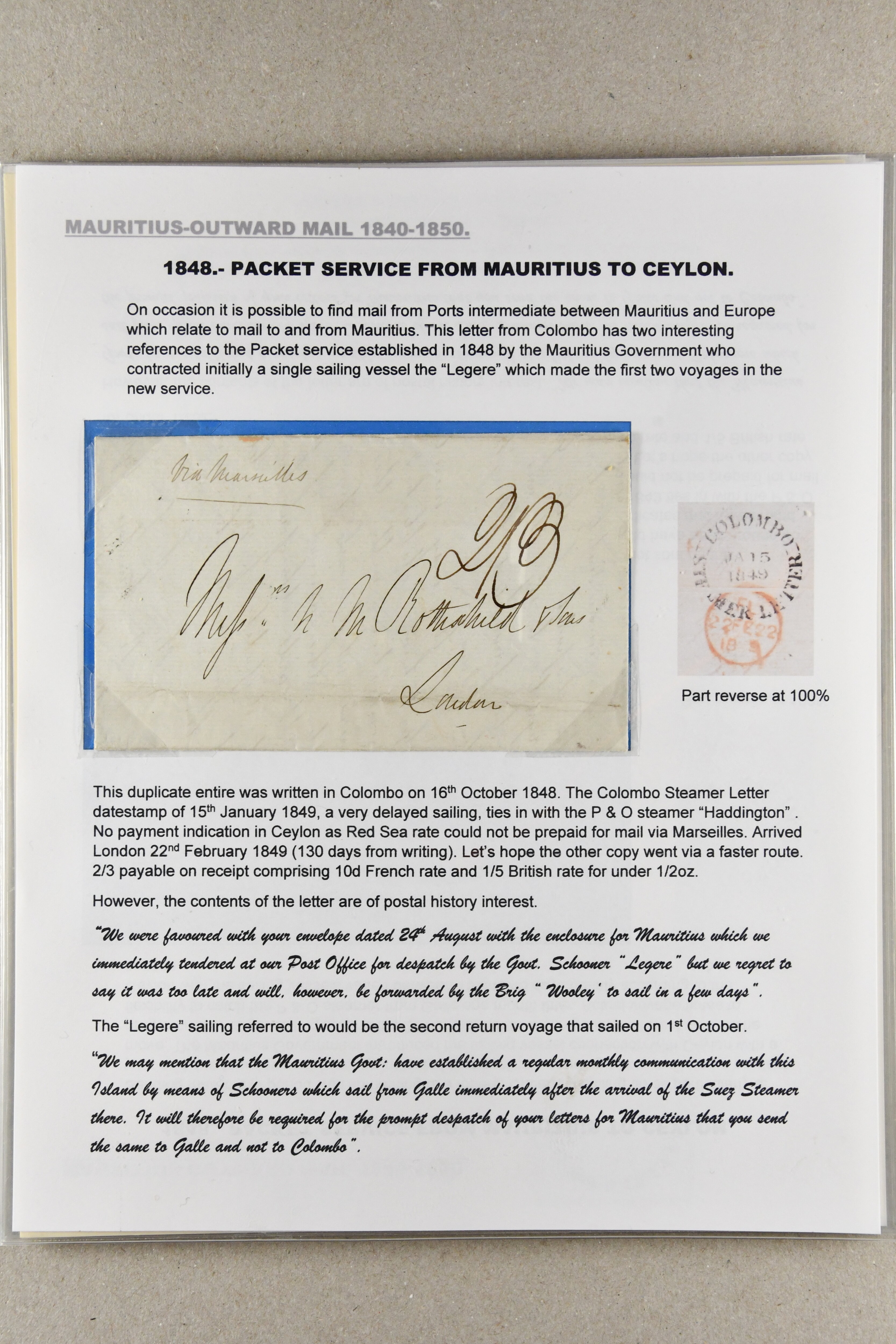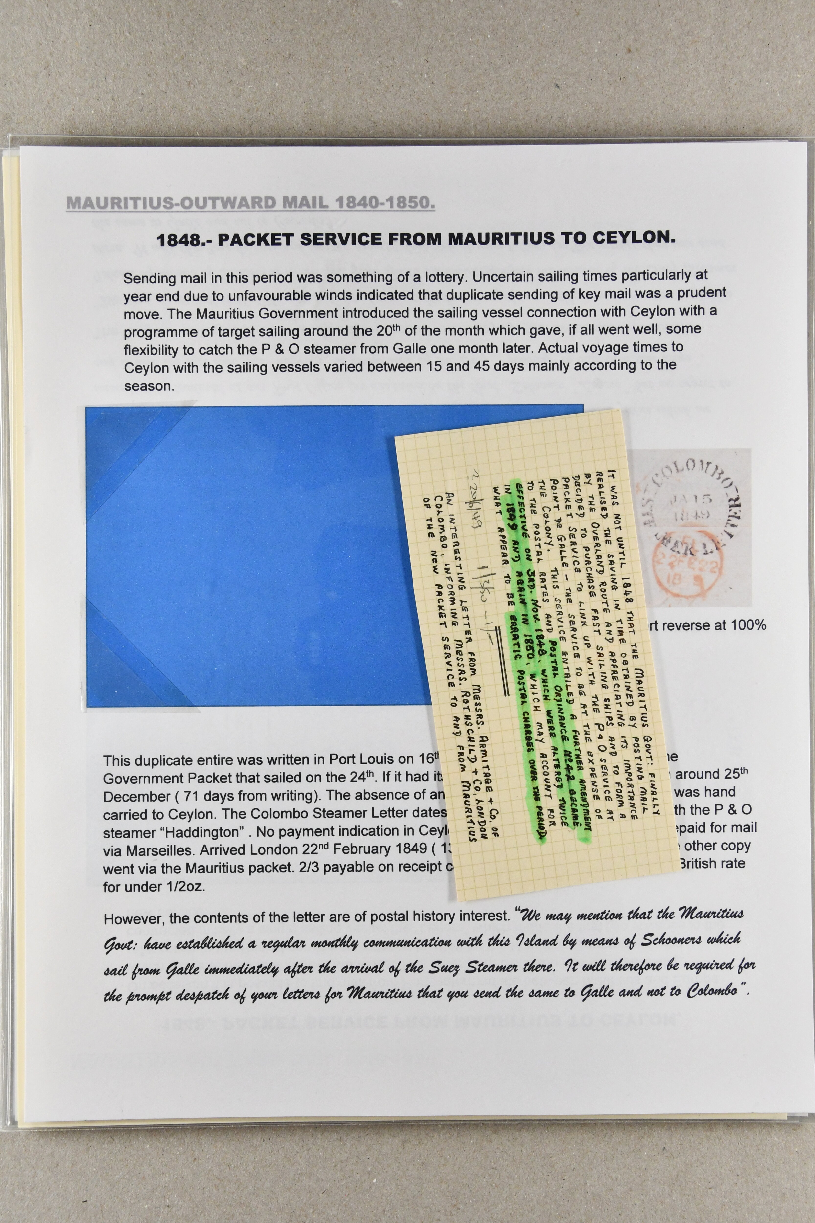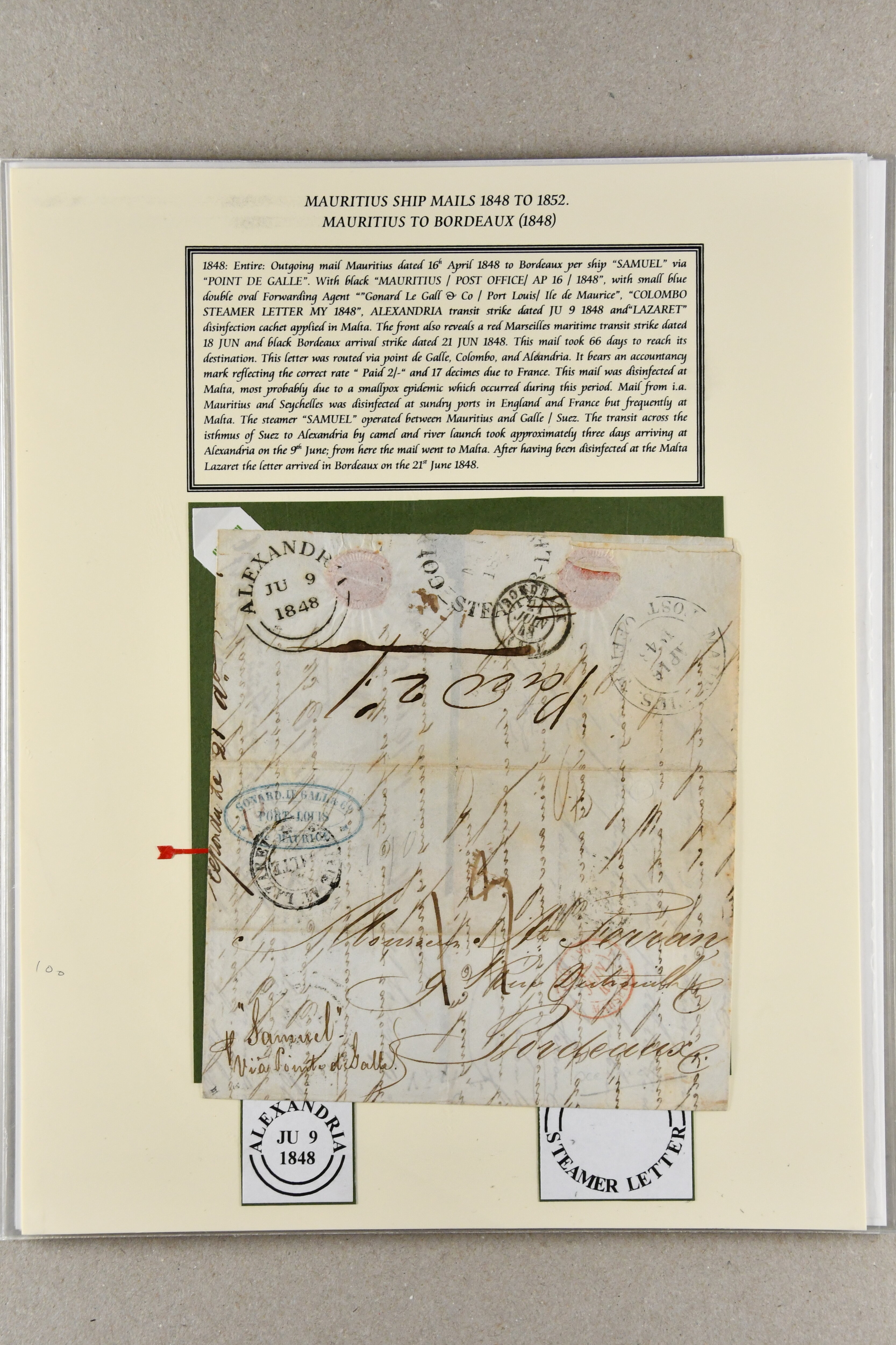1848/1850: Packet Service from Mauritius via Ceylon and Red Sea and return; the collection on leaves with 16 April 1848 entire prepaid 2 s. in manuscript via Galle, Alexandria and Malta; 16 Oct 1848 entire to