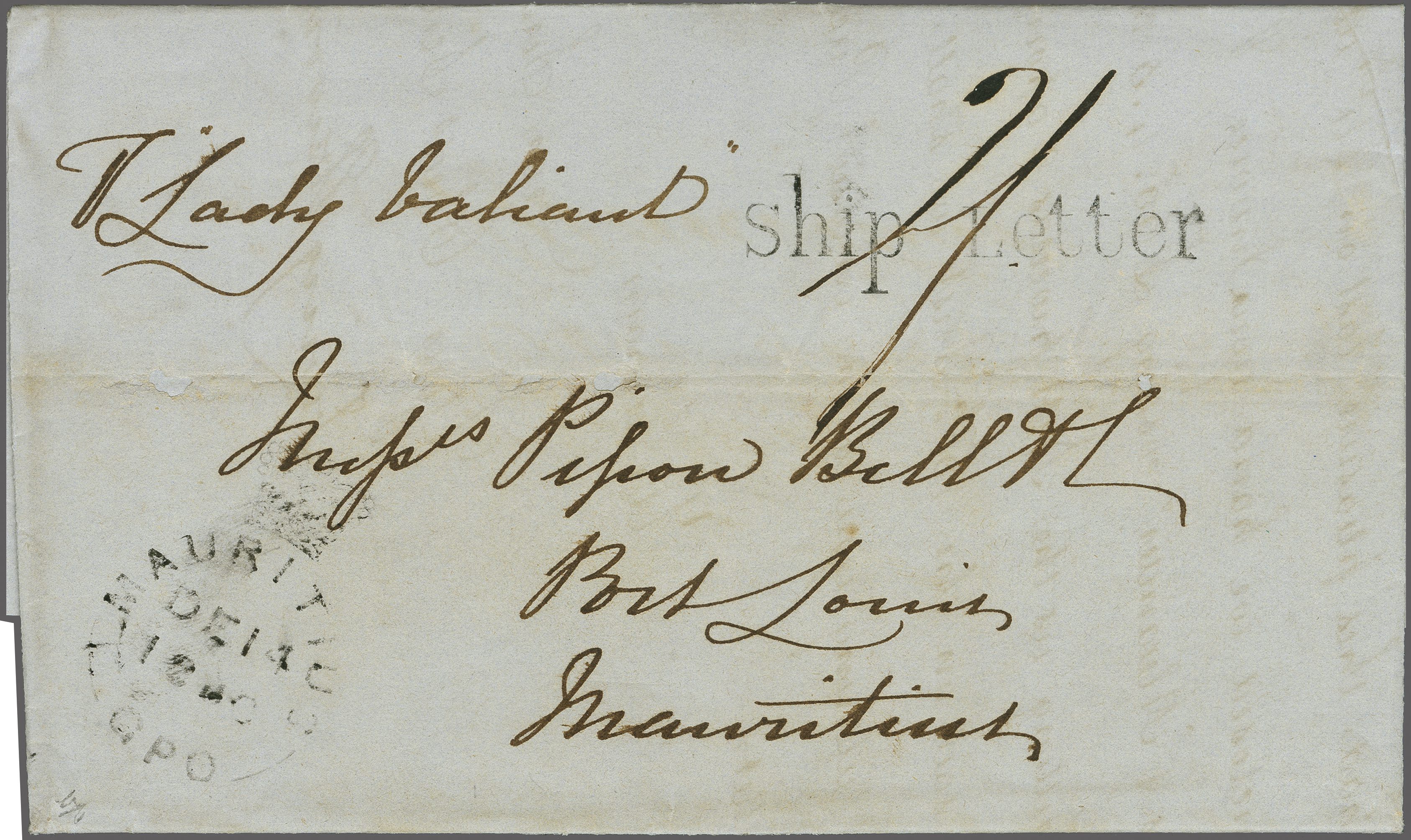 1850 (Sept 17): Entire letter from London to Port Louis, Mauritius endorsed "p. Lady Valiant", struck on arrival with "♚ / MAURITIUS / GPO" datestamp (Dec 14) and superb "ship Letter" straight line handstamp, both in black -