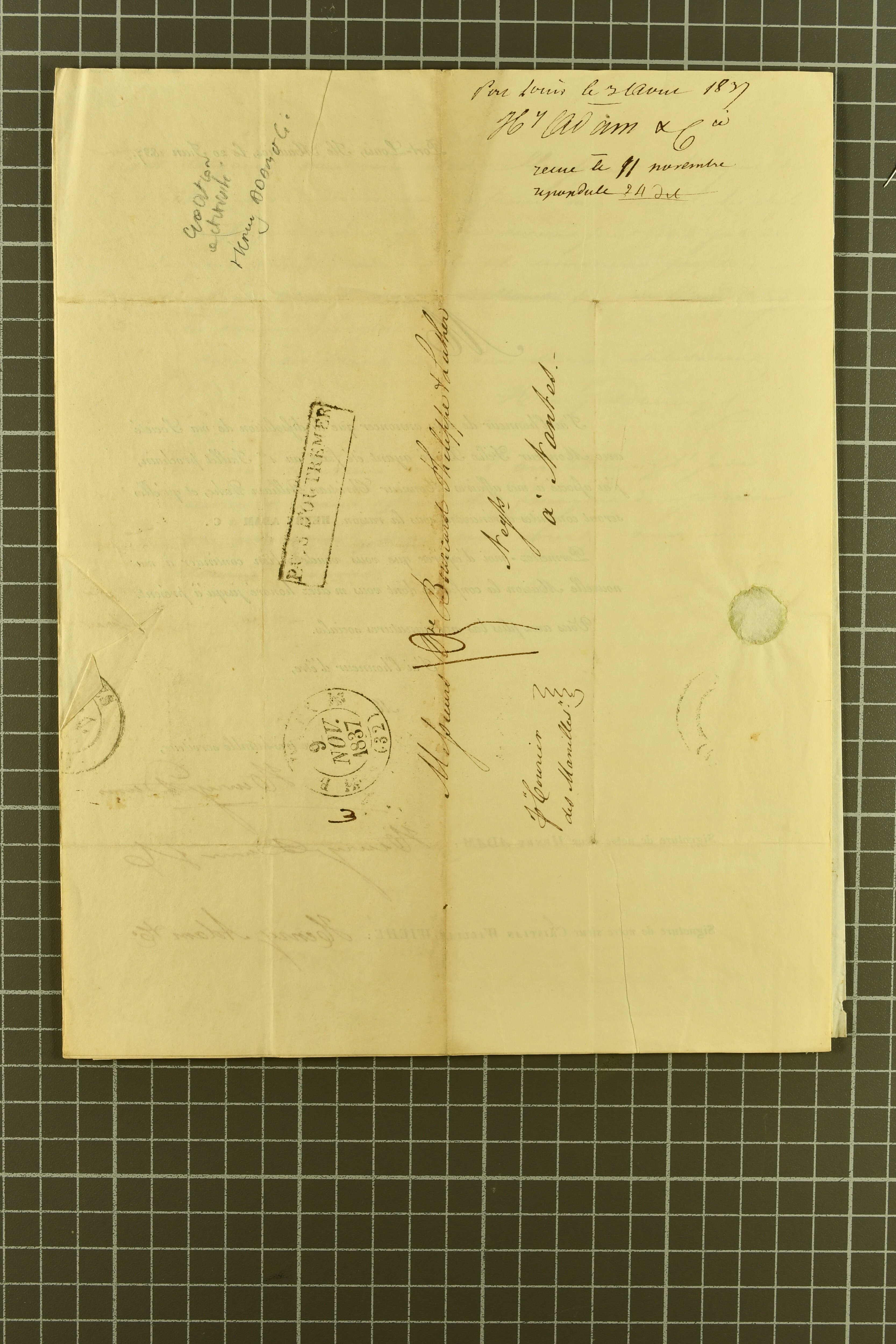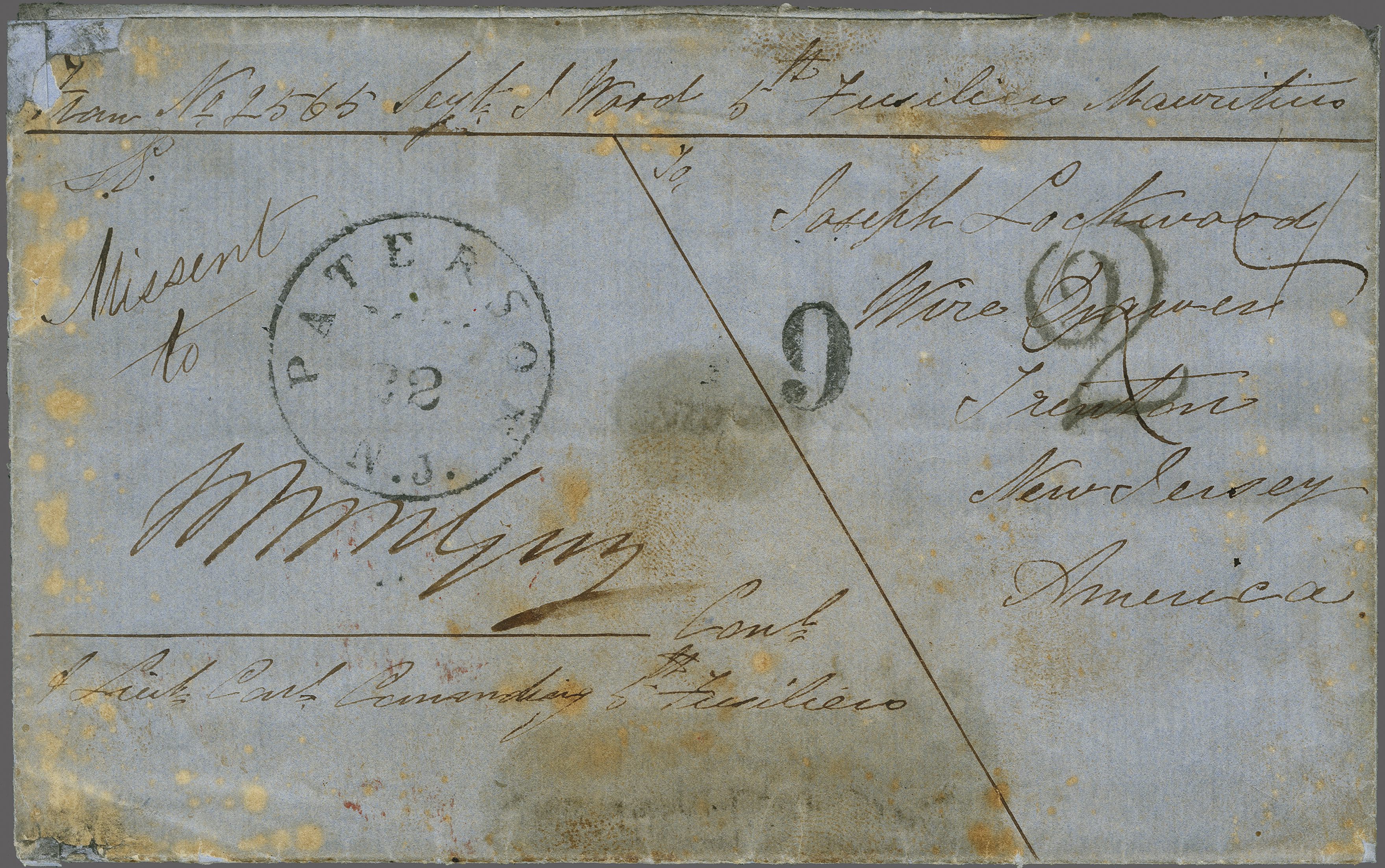 1857 (March 7): Soldier's Letter from Sgt. Wood, of the 5th Fusiliers in Mauritius and sent to Trenton, New Jersey, USA; countersigned by Commanding Officer at left. Reverse with oval framed "PACKET LETTER / MAURITIUS" and