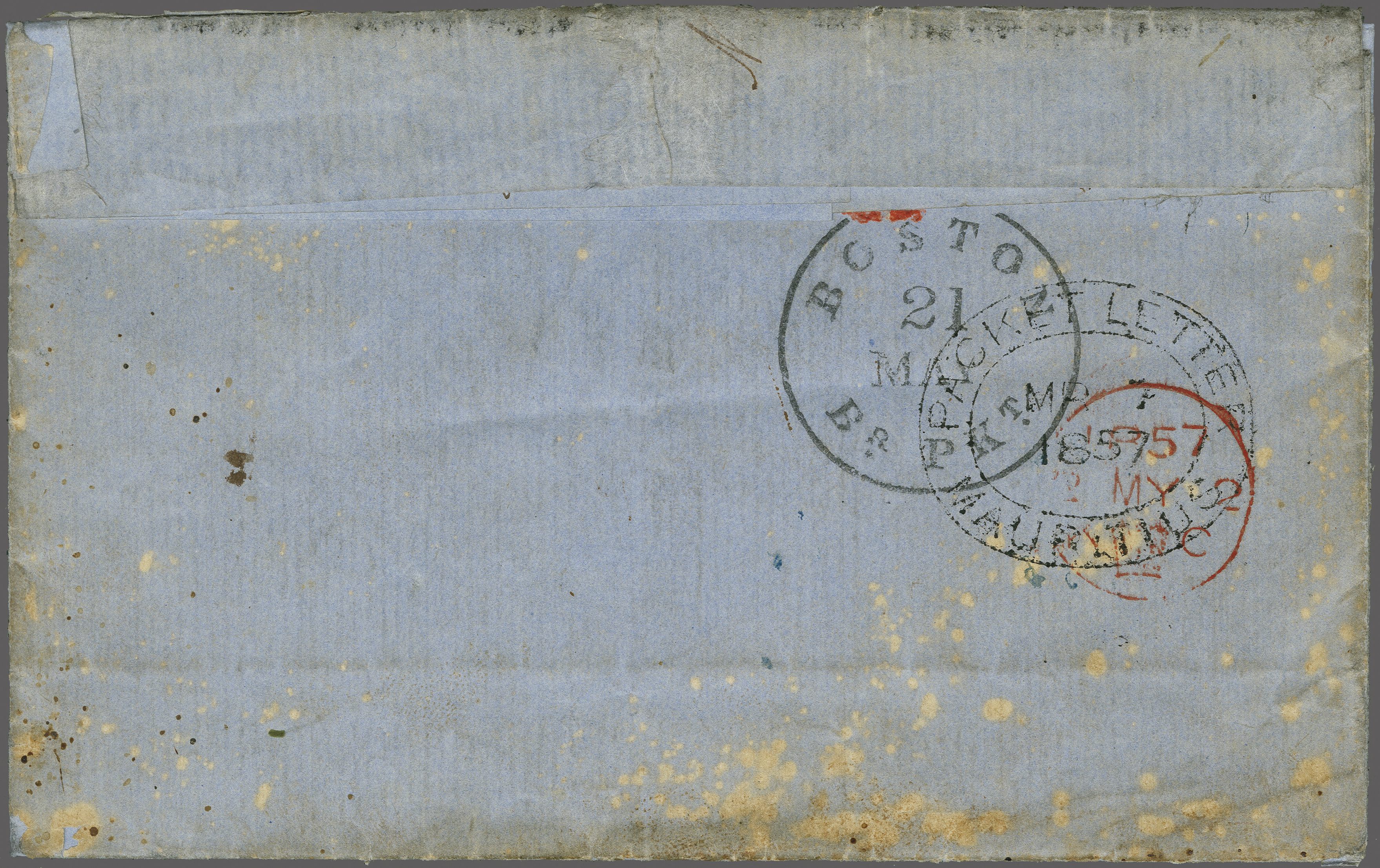 handstamped "2" (pence) for the unpaid amount due in London (double the concessionary rate), sent onwards from London to Boston where struck with "BOSTON / BR. PACKET" cds (May 21) in black, Petterson cds (in error, with "Missent to" alongside) and