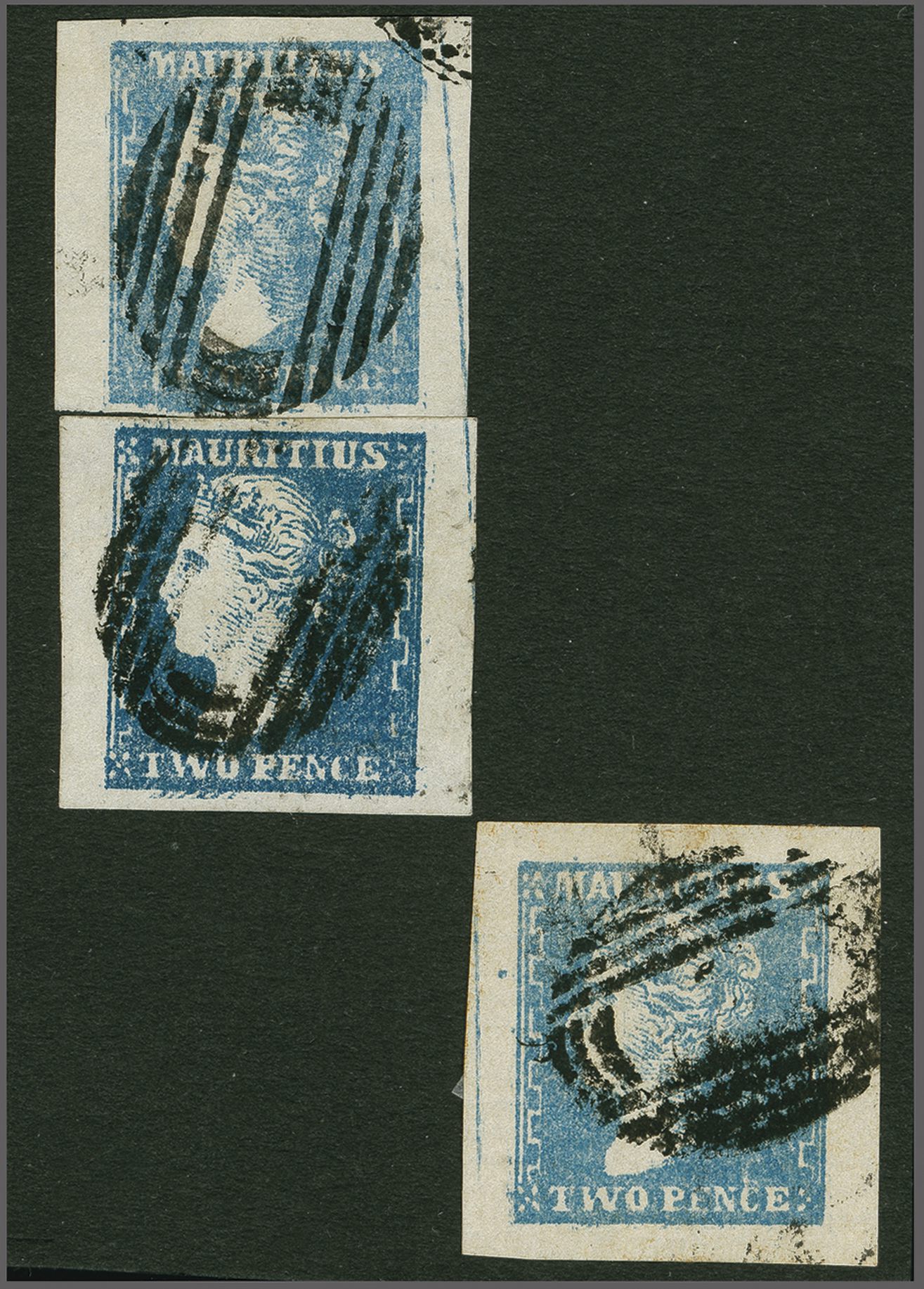 to 11; with 2 d. pale blue (Row 9, stamp 4, position 52) with ample margin at base and huge on three sides cancelled in black showing the "Stone Line Flaw" in right margin (signed A. Diena); 2 d. blue with good to huge margins (Row 10, stamp 4,