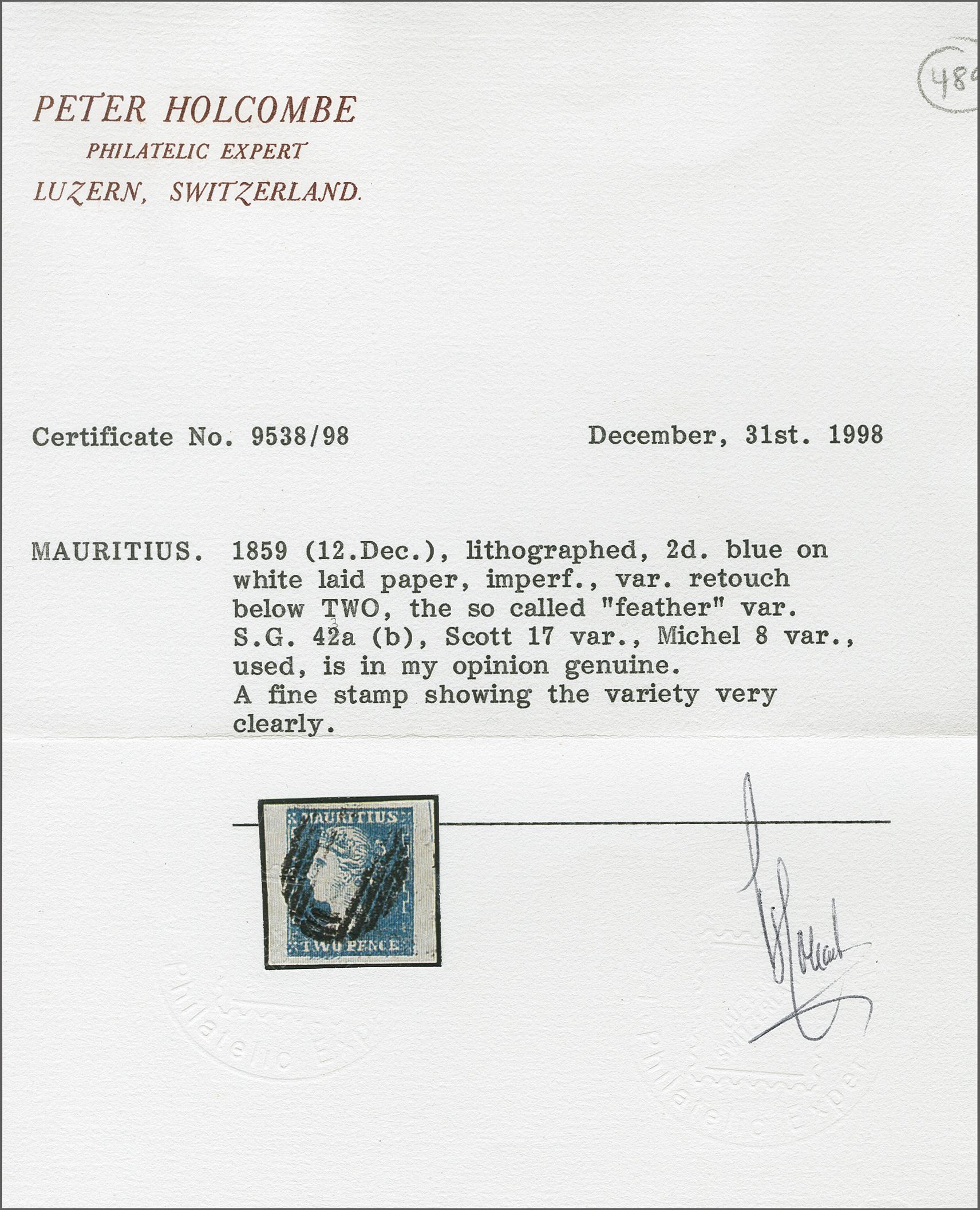 position 58) with "Retouch under TWO" (feather variety) also showing the "Stone Line Flaw" in right margin and very fine (signed and cert. Holcombe, 1998) and 2 d. pale blue with four huge margins (Row 11, stamp 5, position 65) and showing the end of