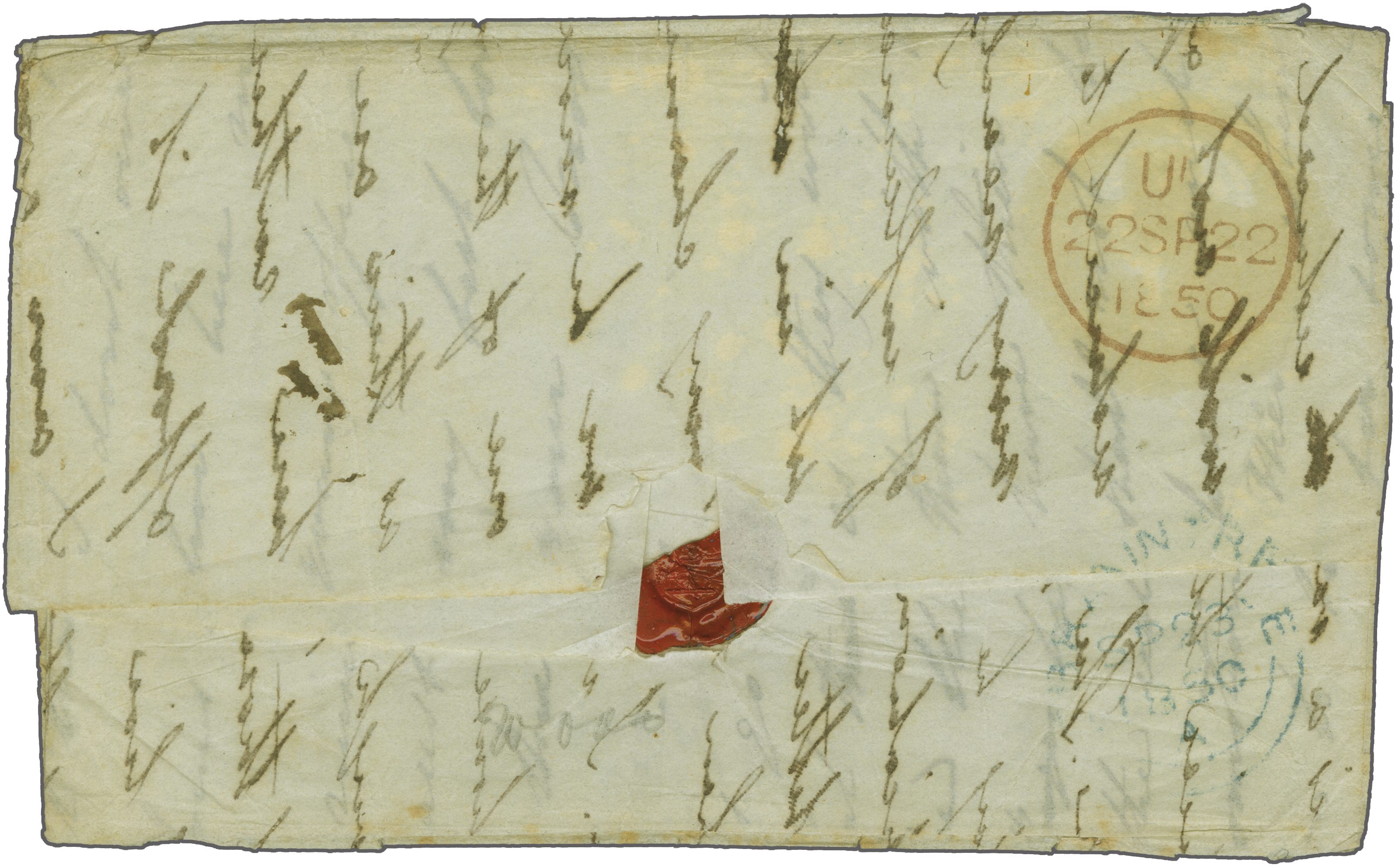 an early usage of the Ship Letter handstamp formerly believed delivered on 1 November 1850. Rated "2/-" in manuscript for a ship letter between 1 and 2 ounces. An attractive and scarce entire (Image 1)