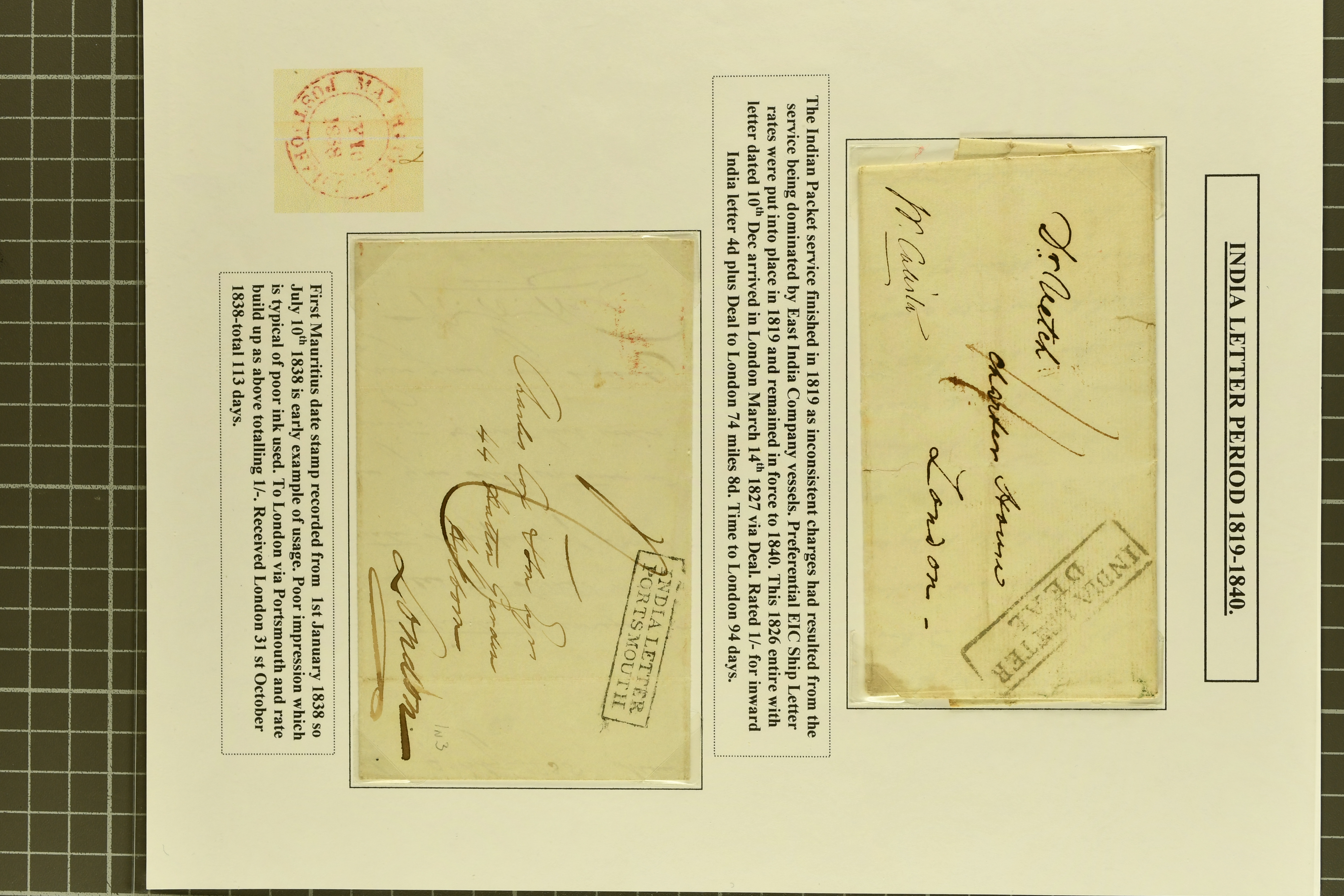 to pay; and 1838 entire struck on entry with fine framed "INDIA LETTER / PORTSMOUTH" in black (Robertson fig. In.3) with reverse showing "MAURITIUS / POST OFFICE" cds (July 10) in red applied in first year of use (Proud PS6) also charged 1 shilling
