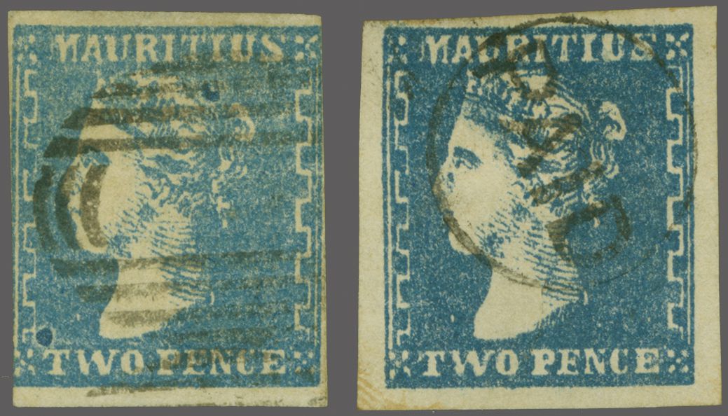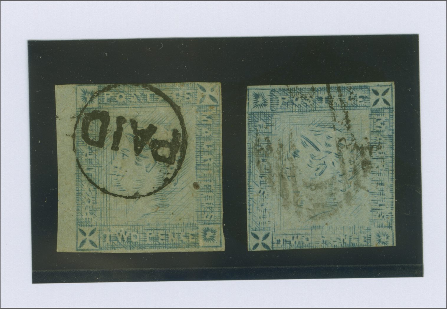 above "T" of TWO, the second example in the true blue shade with good to large margins all round but with small thin, cancelled by circular PAID in black showing the "ink clog" obscured. Scarce Gi = £ 2'300 (Image 1)
