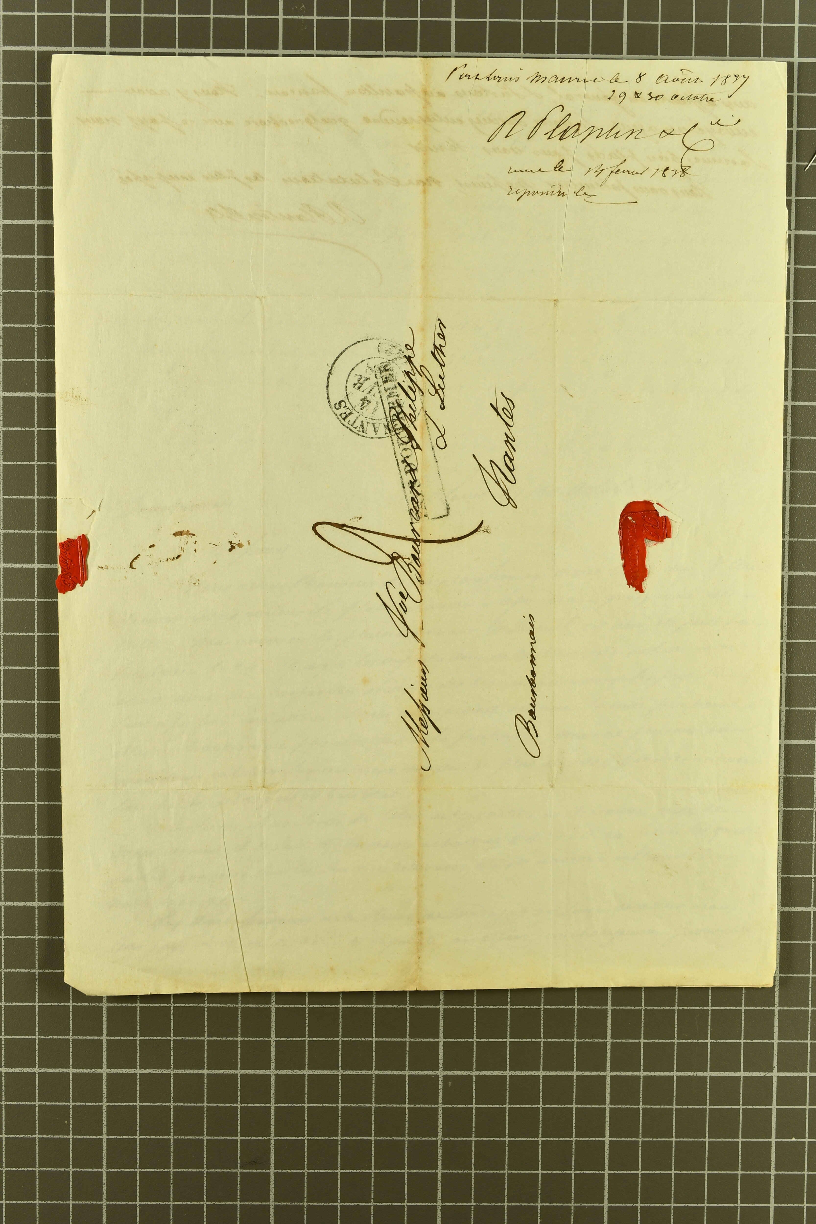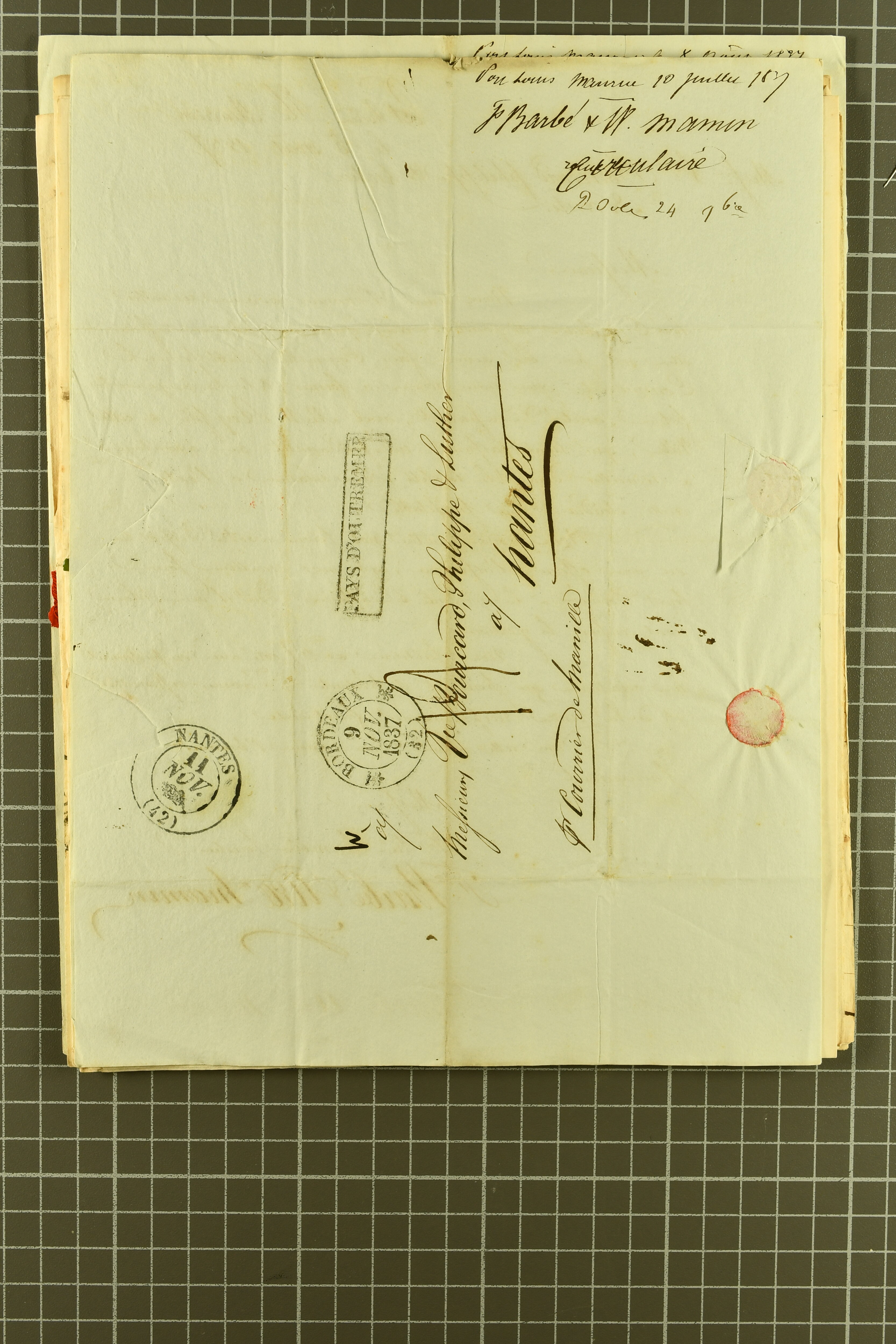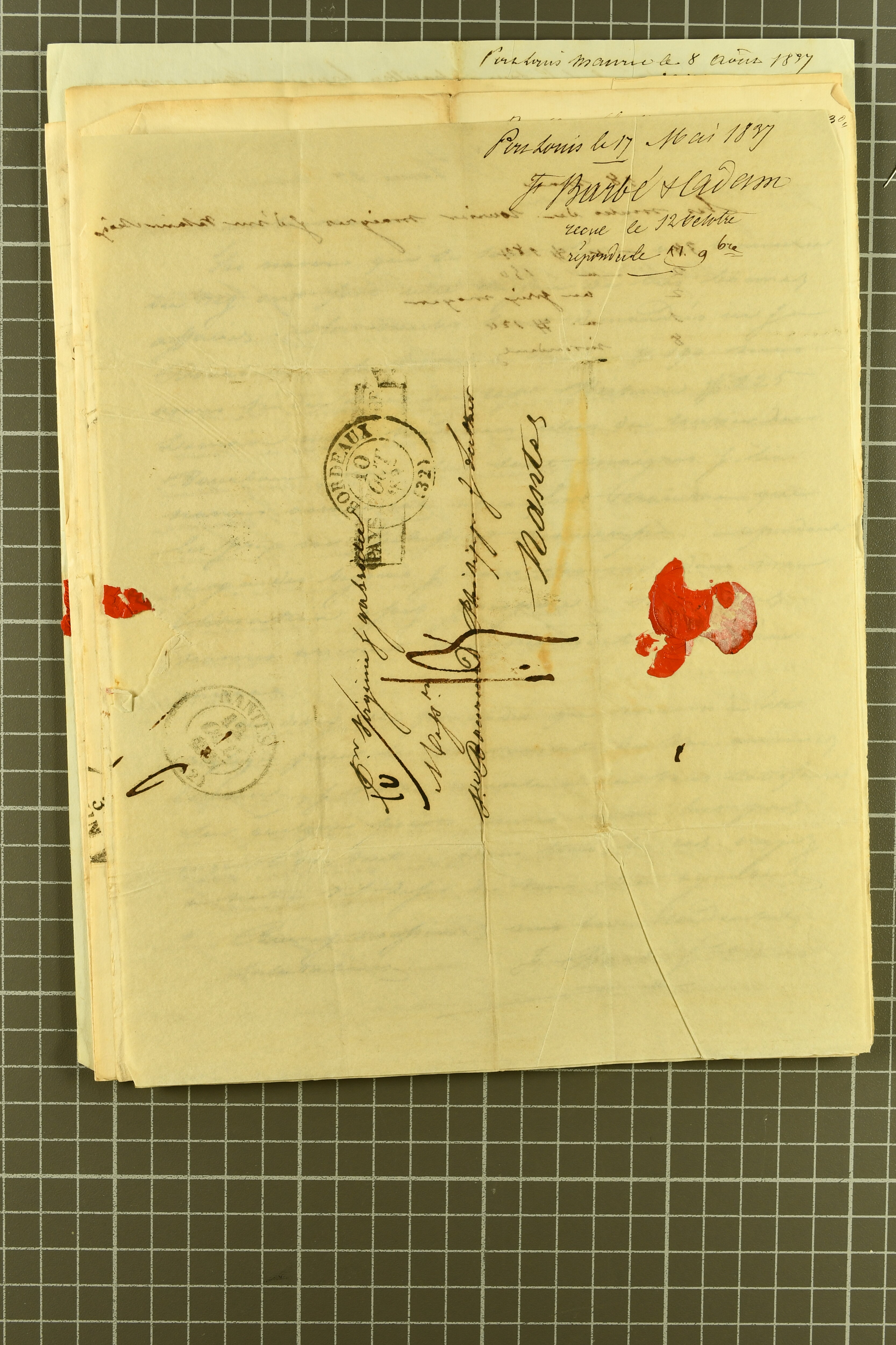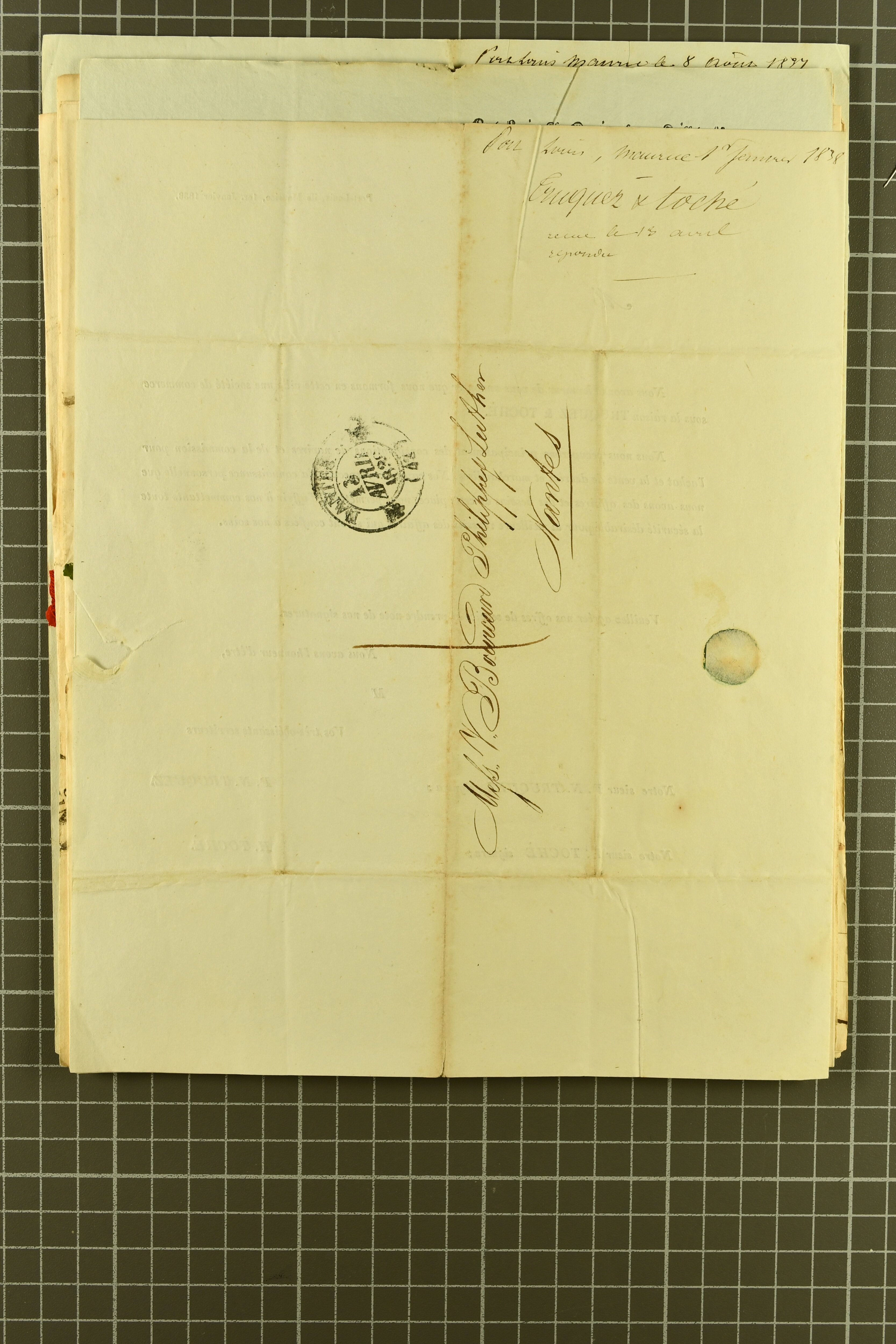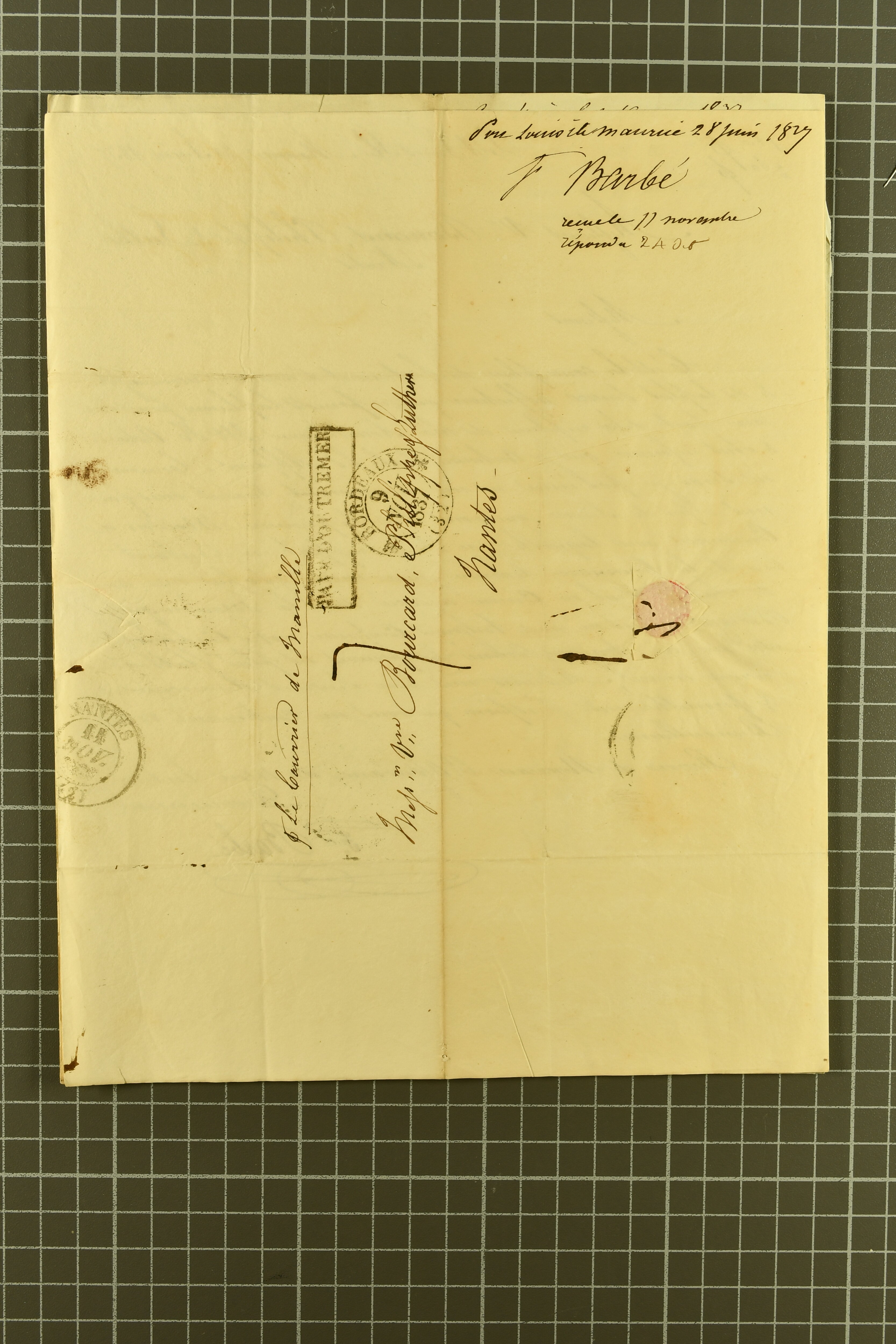 1828/46: Interesting group comprising 13 pre-philatelic letters/documents sent from Port Louis to Nantes, addressed to Bourcard & Luther, bearing manuscript charge marks alongside despatch, transit and arrival
