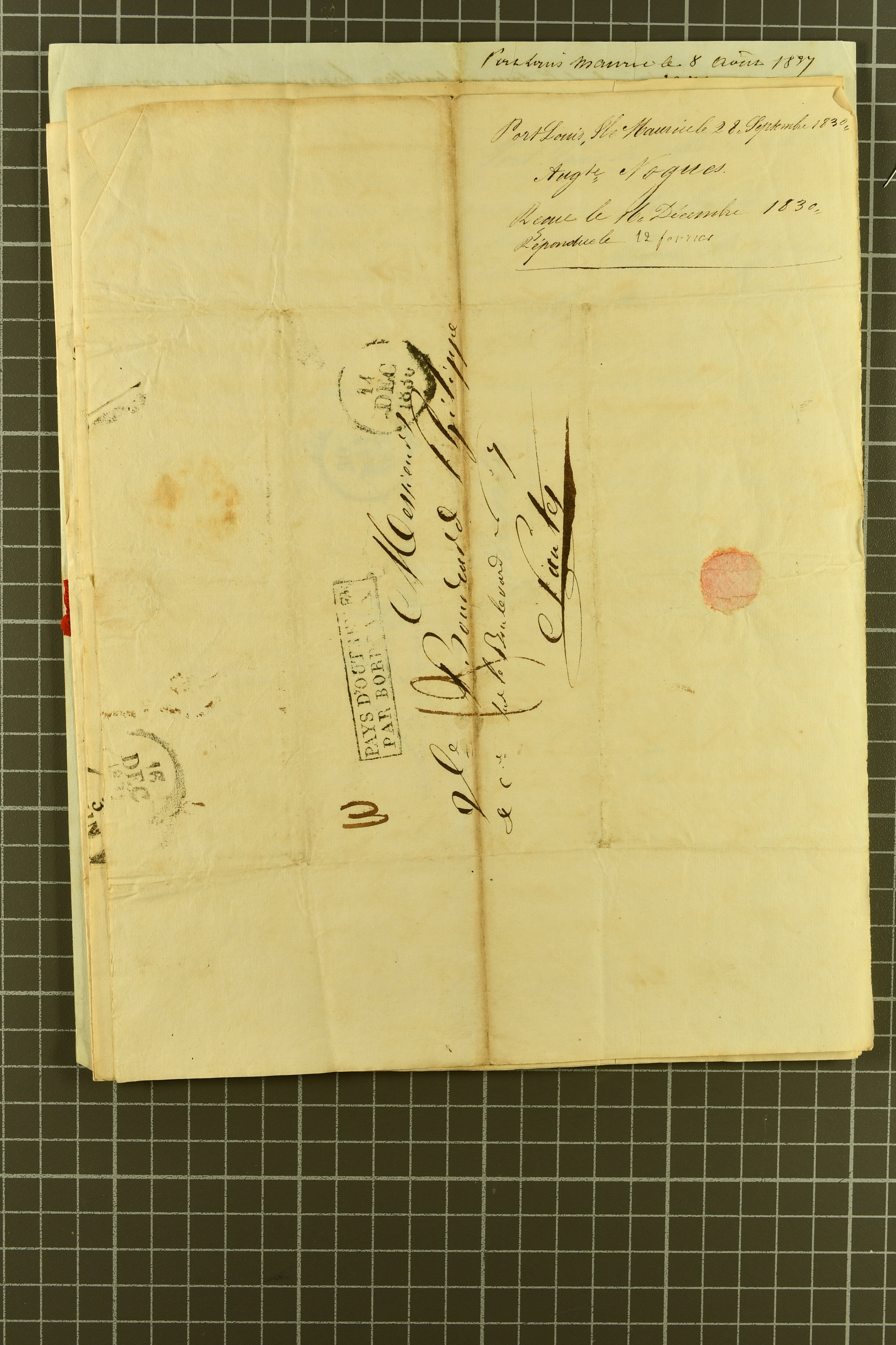 Valognes, France to Mauritius, struck with framed "PP" in red, readdressed on arrival to Plaines Willhems; prepaid June 1836 entire to Grand Port, Mauritius with oval "PAID SHIP LETTER / ♚ / LONDON" in red, similar entire mailed in 1837 with