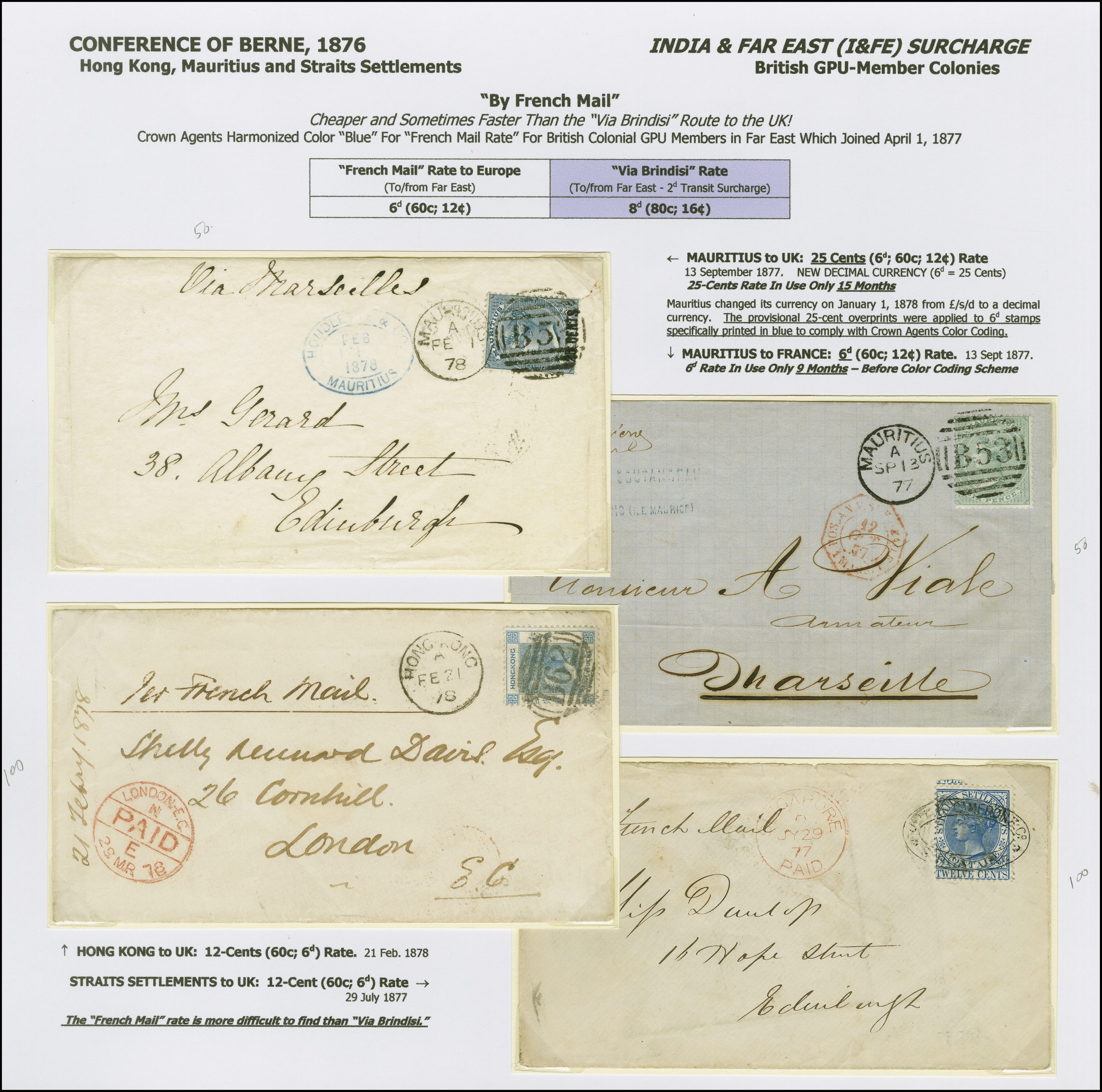 1877: Album page comprising four covers illustrating the British GPU India & Far East surcharge rate on mail from Mauritius (2) - to Edinburgh and Marseille, Hong Kong (1) - to London (via French Mail) and Straits