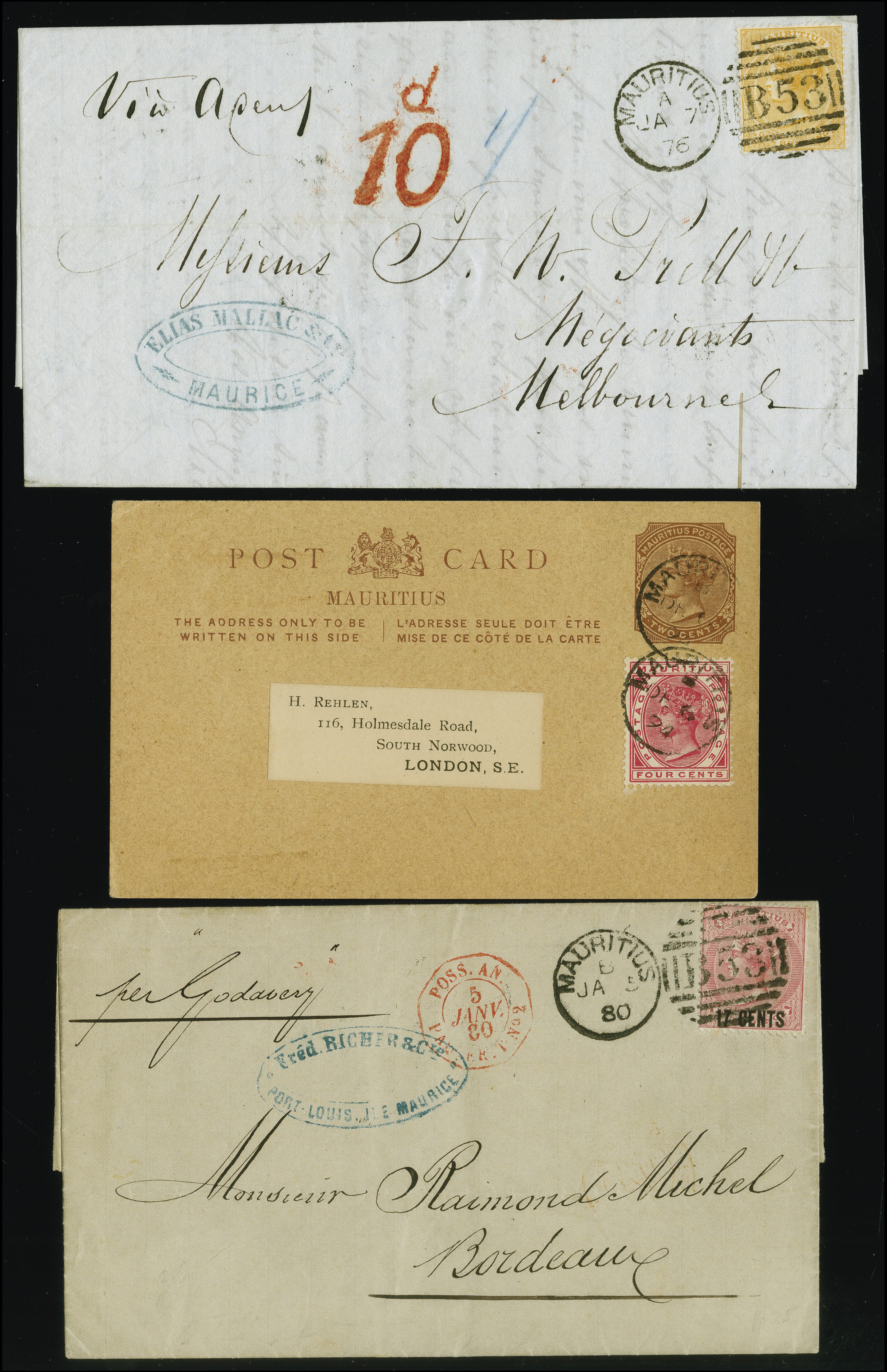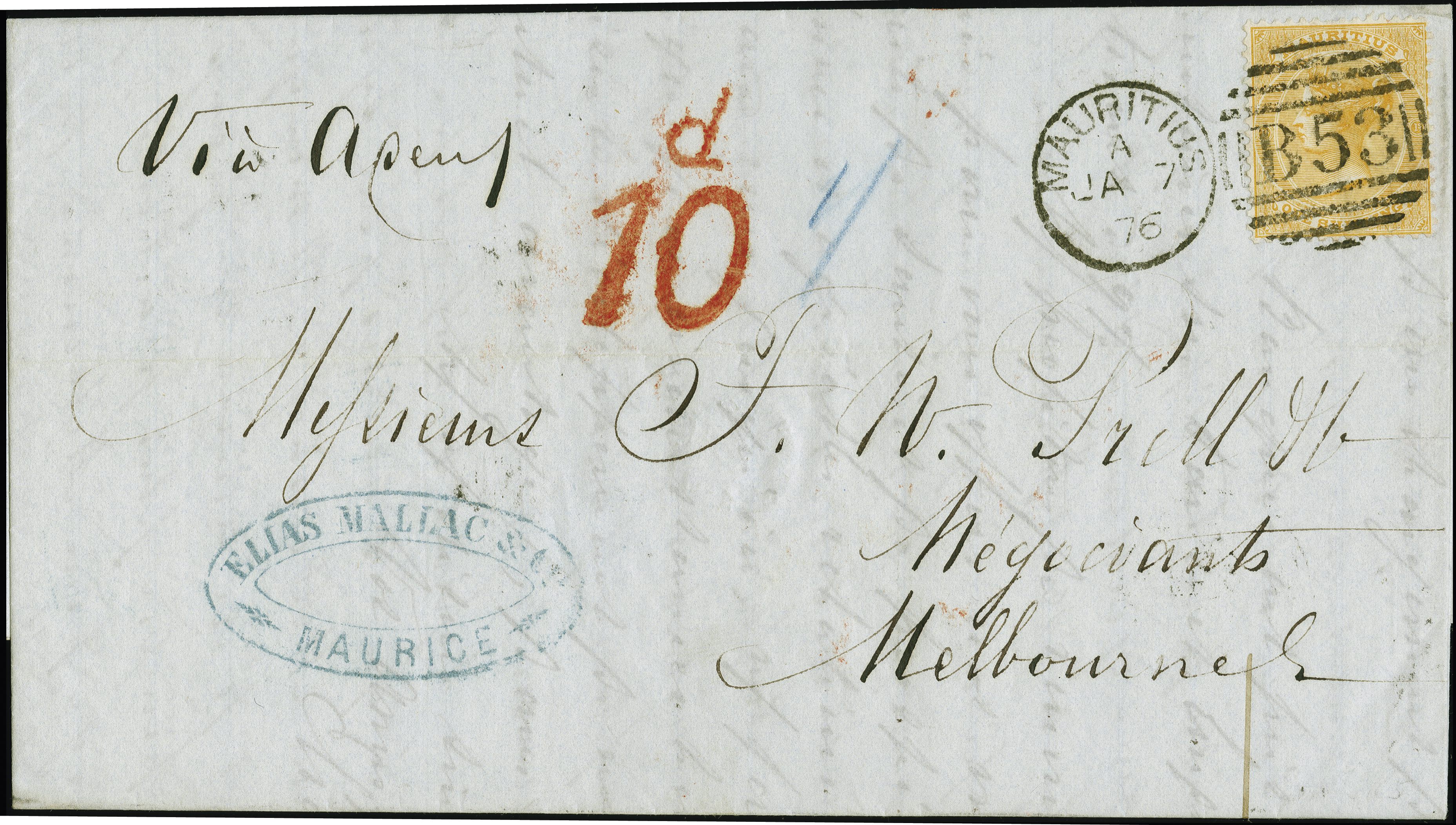 entire to Melbourne, Australia, with red accountancy “10d” and endorsed “Via Aden”. Reverse, with arrival cds “MELBOURNE FE 21 76”. Fine 1s rate from Indian Ocean to Australia. Also, 1878, surcharge 17 CENTS on 4 pence rose, fresh colour and