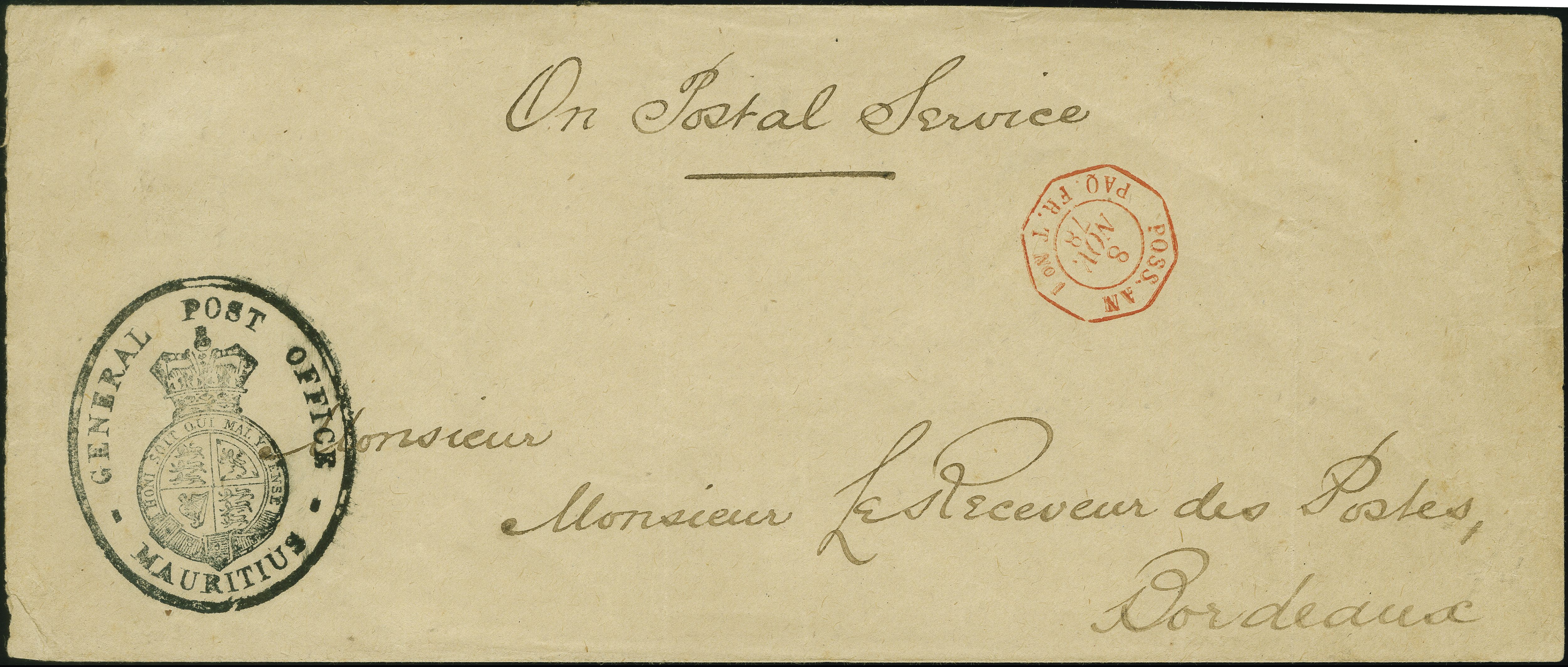 1878: Stampless envelope endorsed “On Postal Service” and with handstruck “GENERAL POST OFFICE MAURITIUS” Crown oval seal in black to lower left, sent to Bordeaux, France, transit cds “POSS. AN PAQ. FR. T No1 8 NOV. 78”.