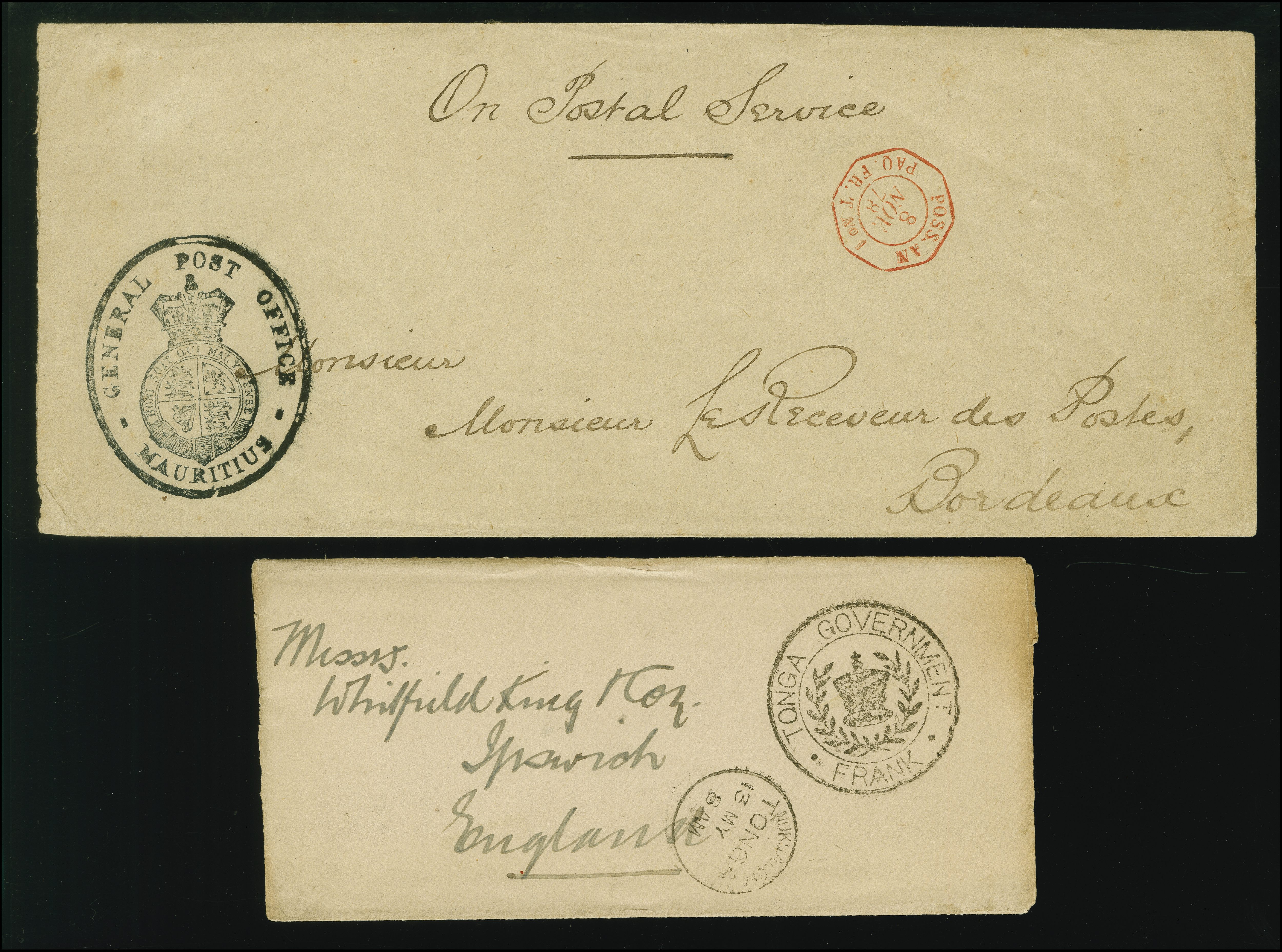 from Tonga, the stampless envelope sent to Ipswich, England bearing the free frank “TONGA GOVERNMENT FRANK” seal alongside a despatch cds of Nukualofa (Image