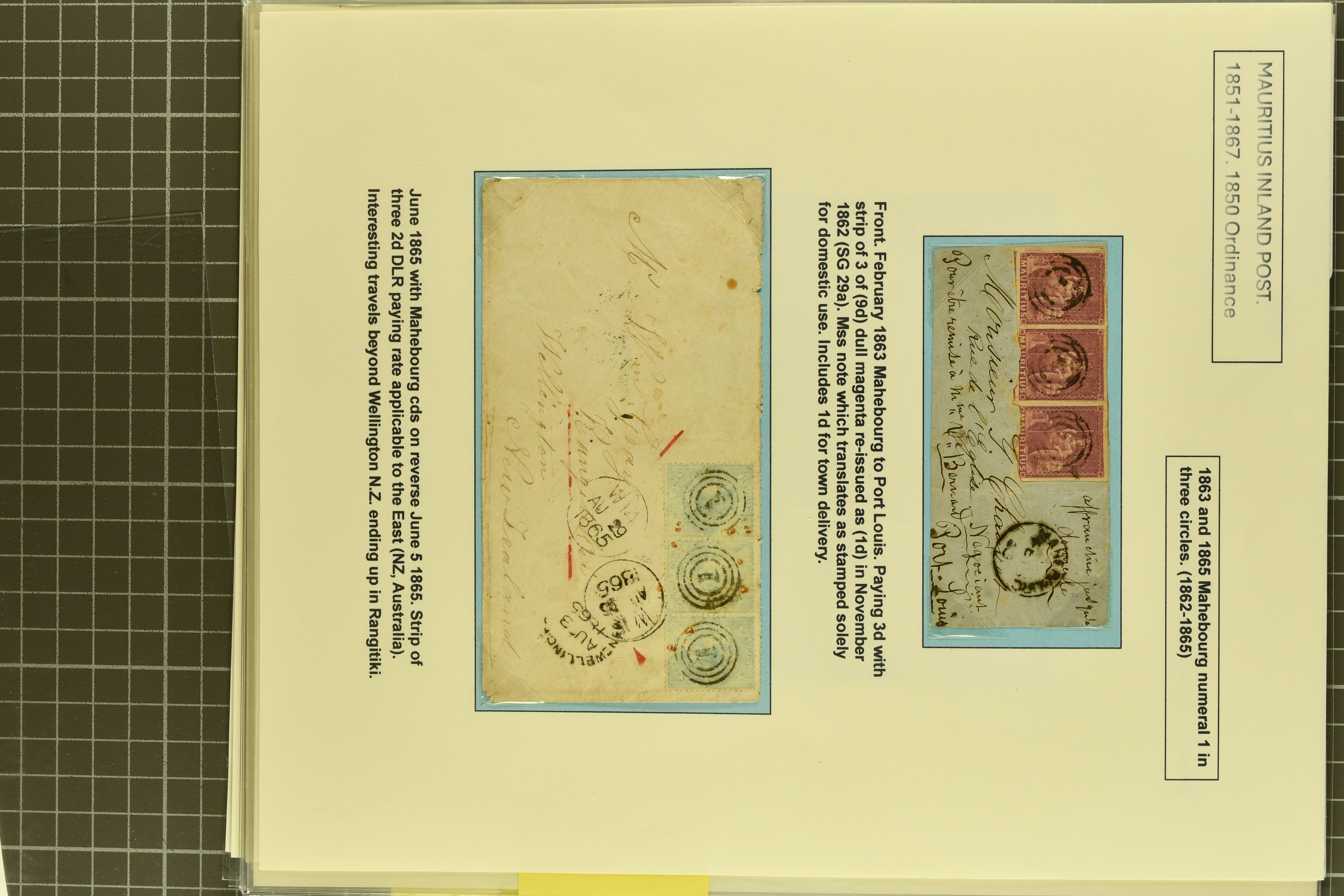 issues; rare front of cover with (1 d.) re-issue in magenta in a strip of three all cancelled "1" of Mahebourg and used to Port Louis (Gi 29a), 1865 cover with three 2 d. blue used to New Zealand; rare 1863 cover from Souillac with 1 d. brown and 2