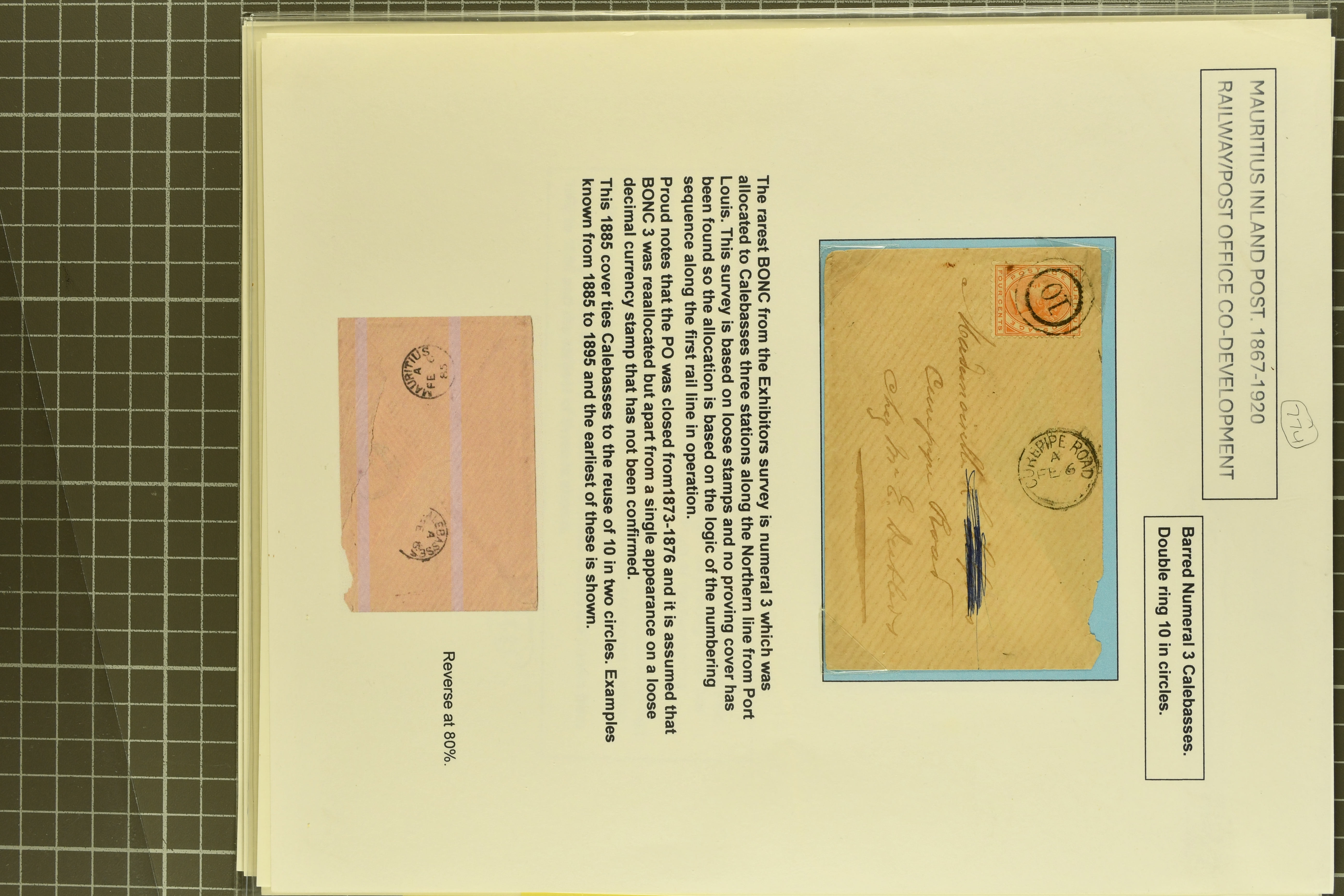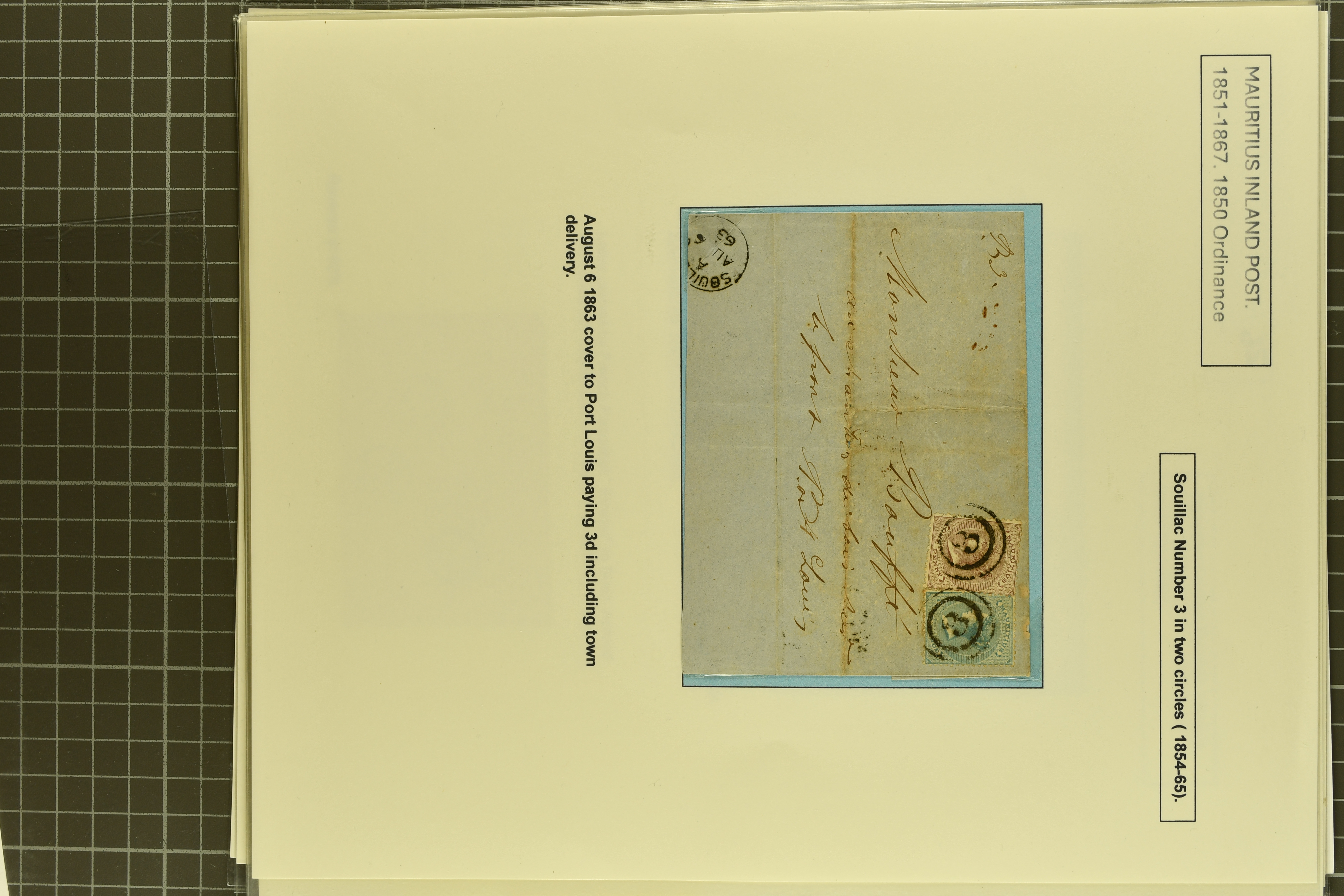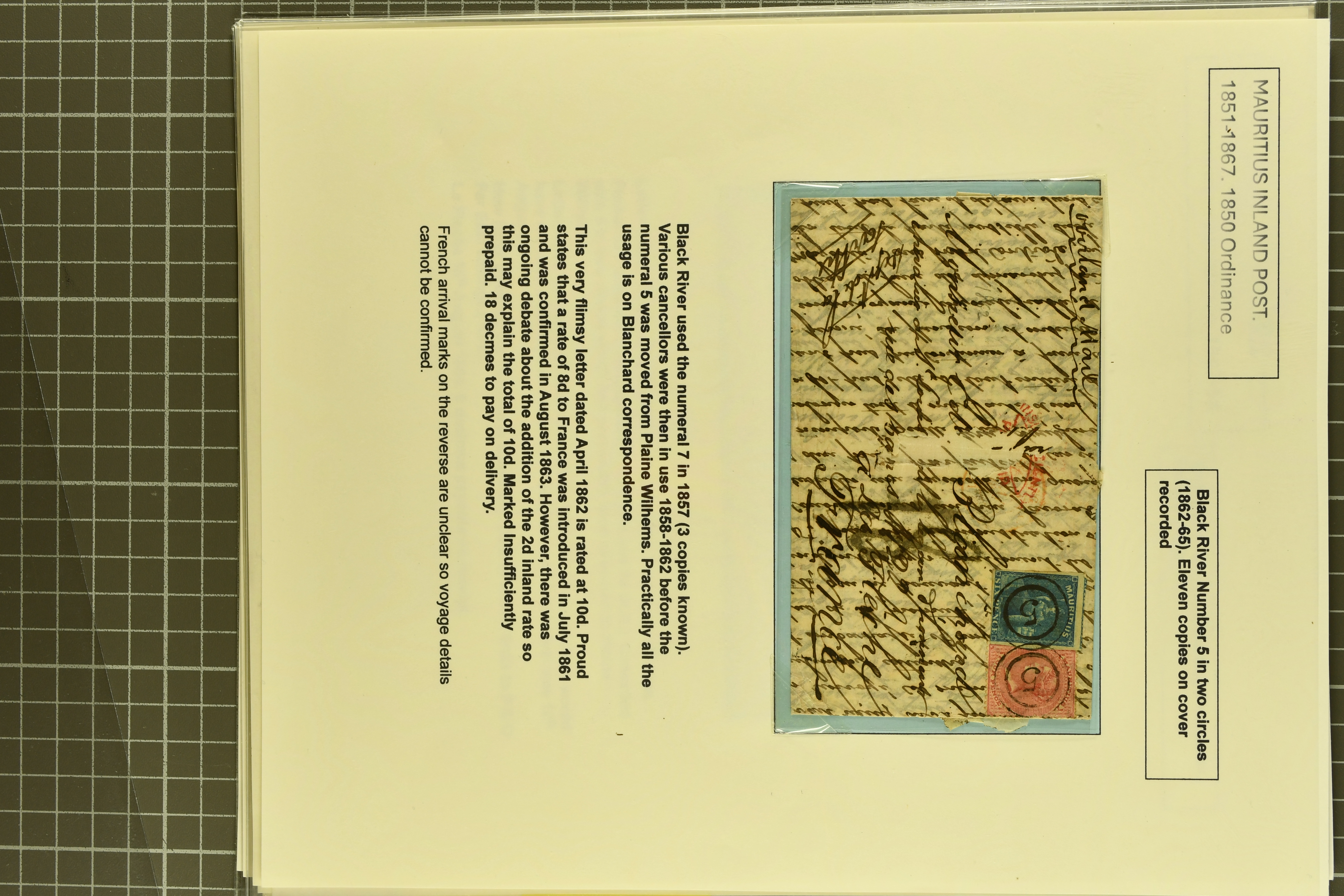 tied by "5" numerals of Black River mailed via Calcutta; 1885 cover from Calabasses to Curepipe Road bearing 4 c. orange tied by rare "10" numeral - earliest recorded date of use; 1848/54 Post Paid 1 d. pale blue, latest impression, used on 1858