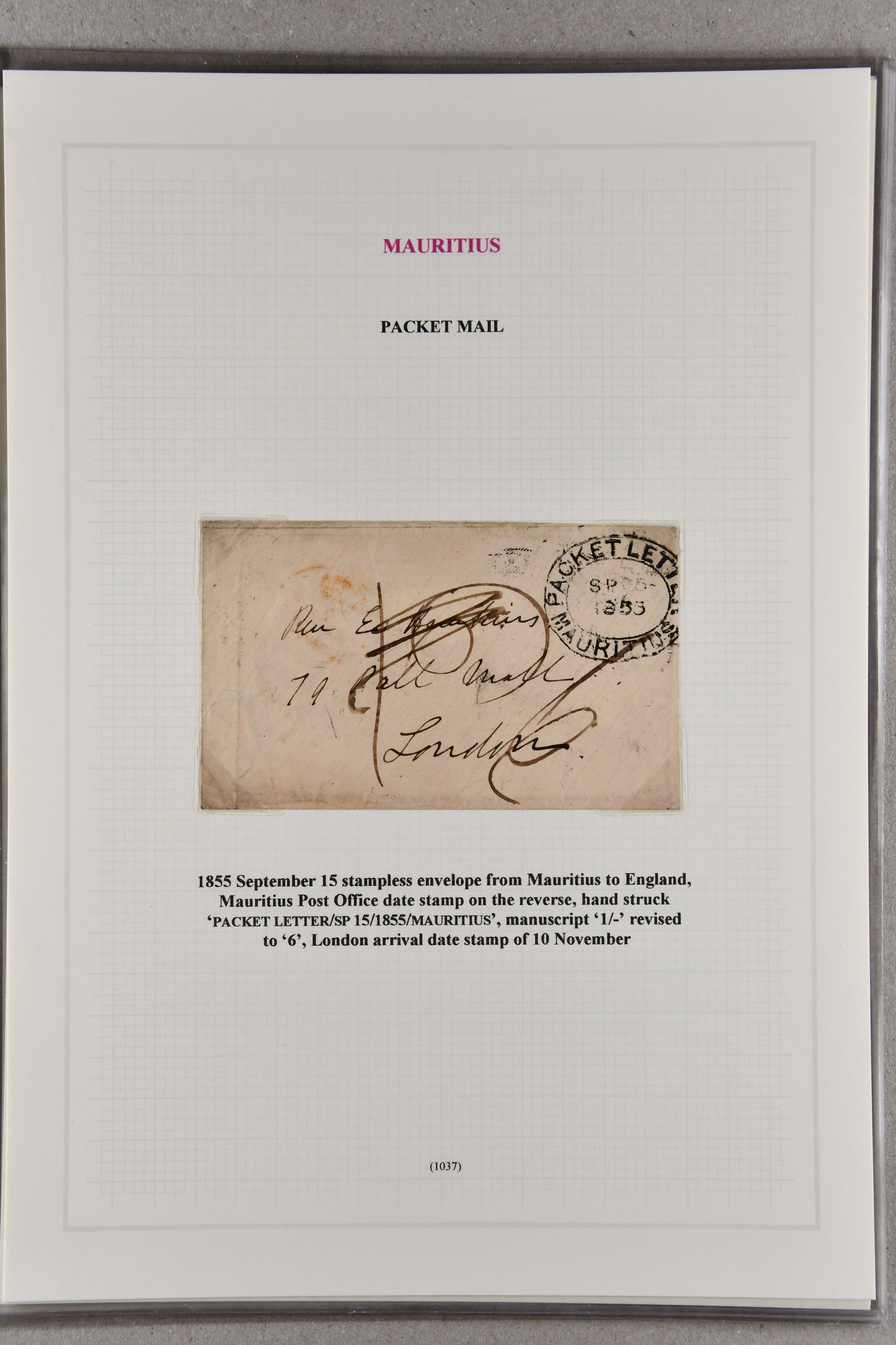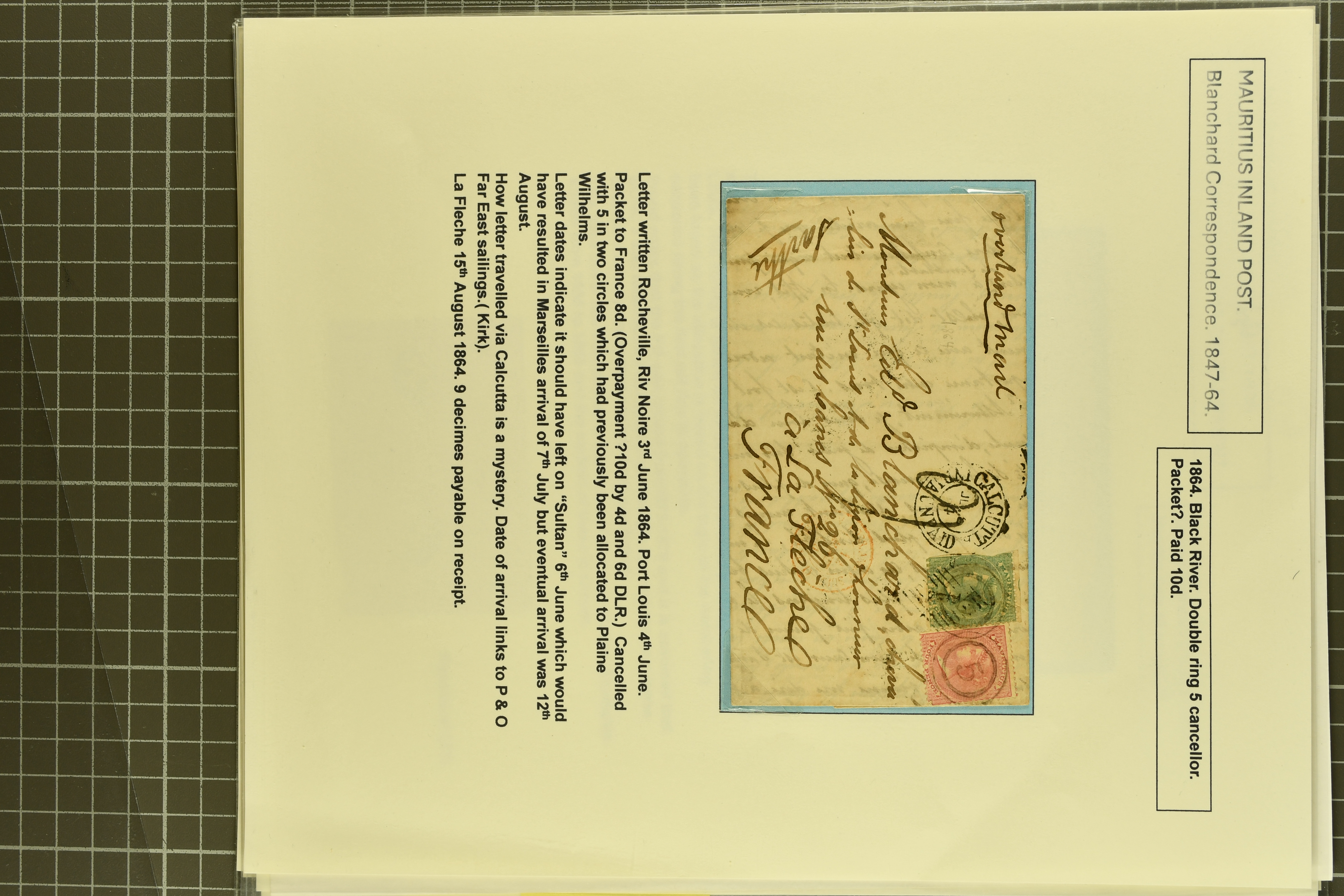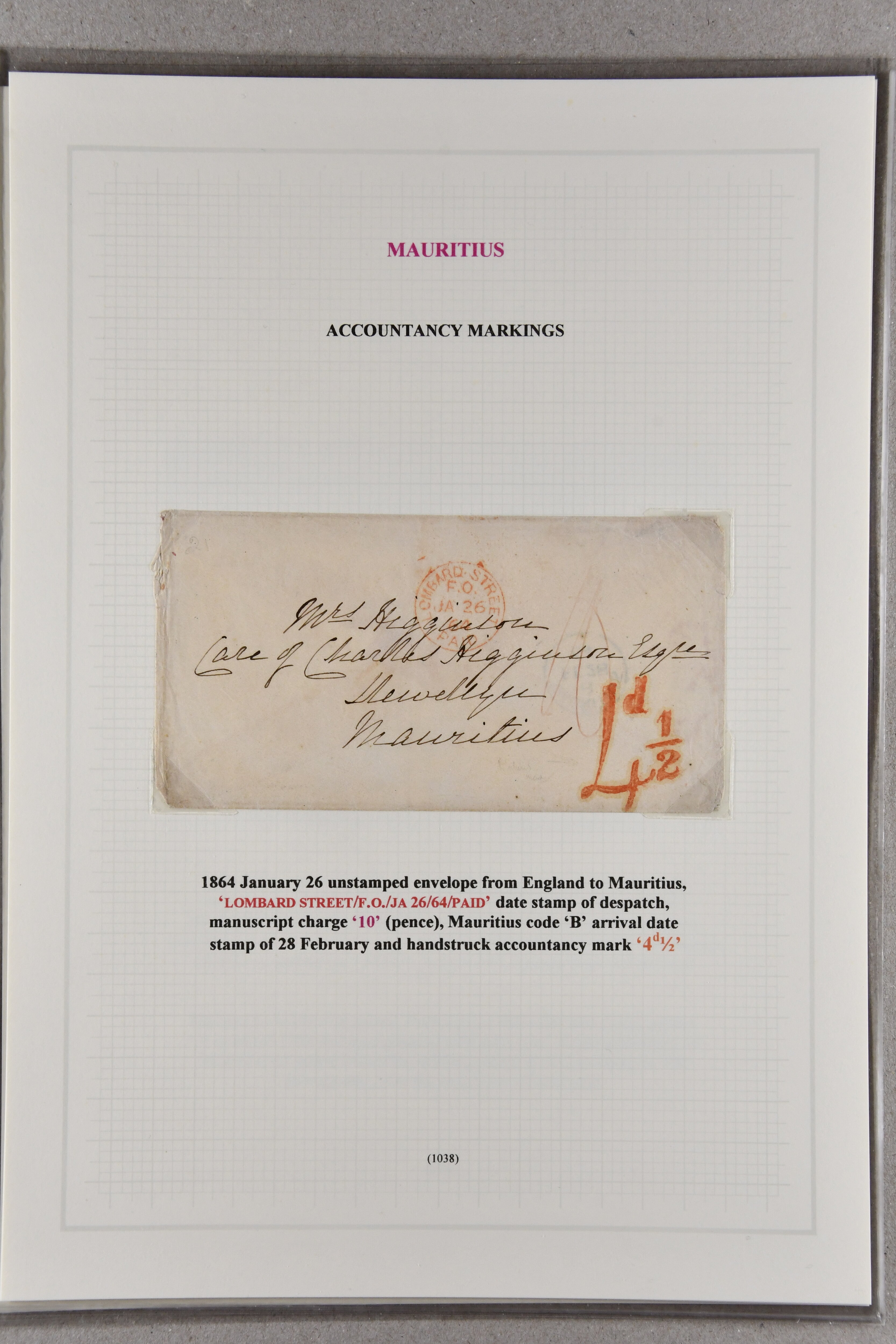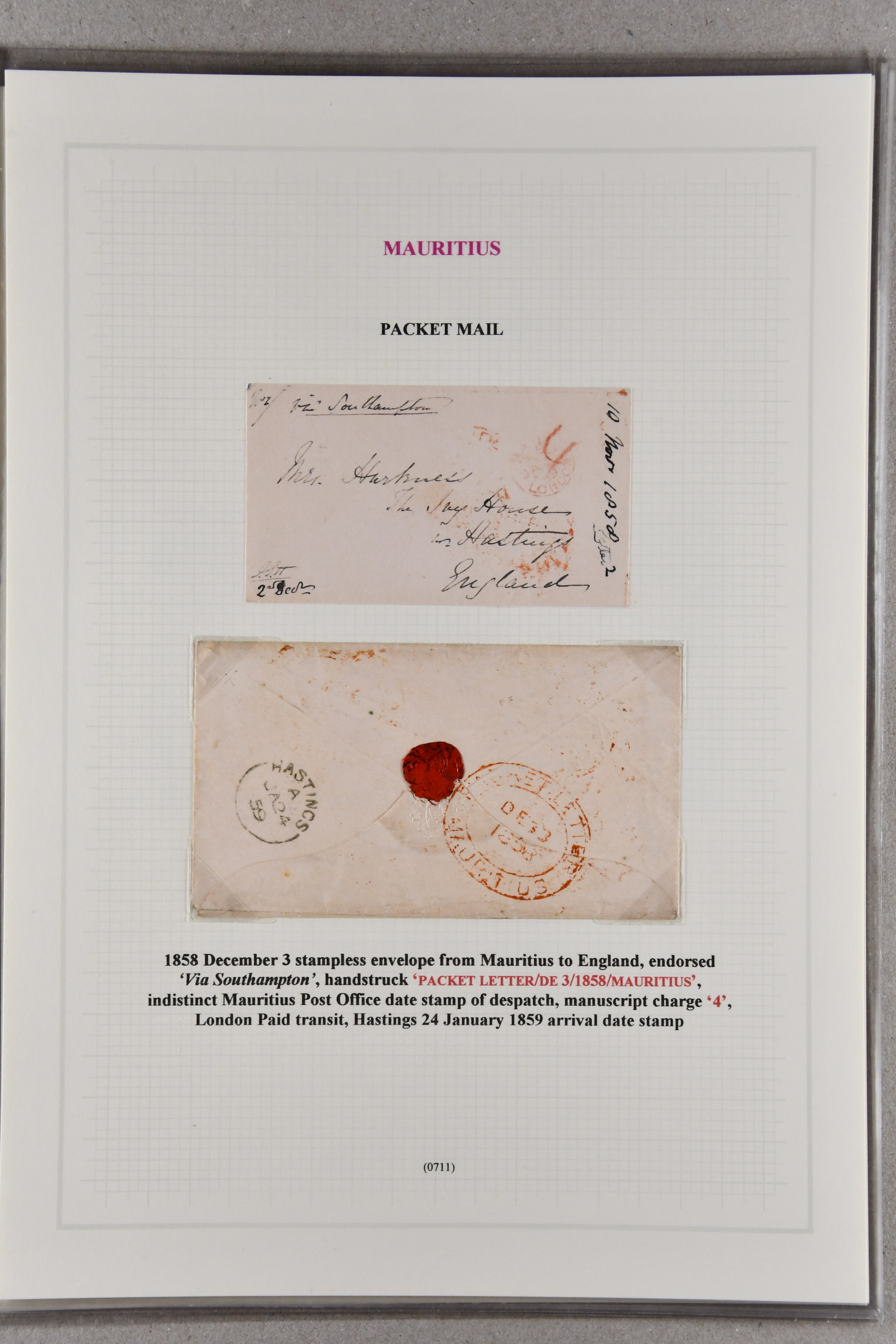 LETTER / MAURITIUS" in black to London, 1859 cover via Southampton to Hastings with oval "PACKET LETTER / MAURITIUS" in red, 1864 stampless envelope from London to Governor Higginson's wife struck with superb "4½d." rate marking in red, France 1866