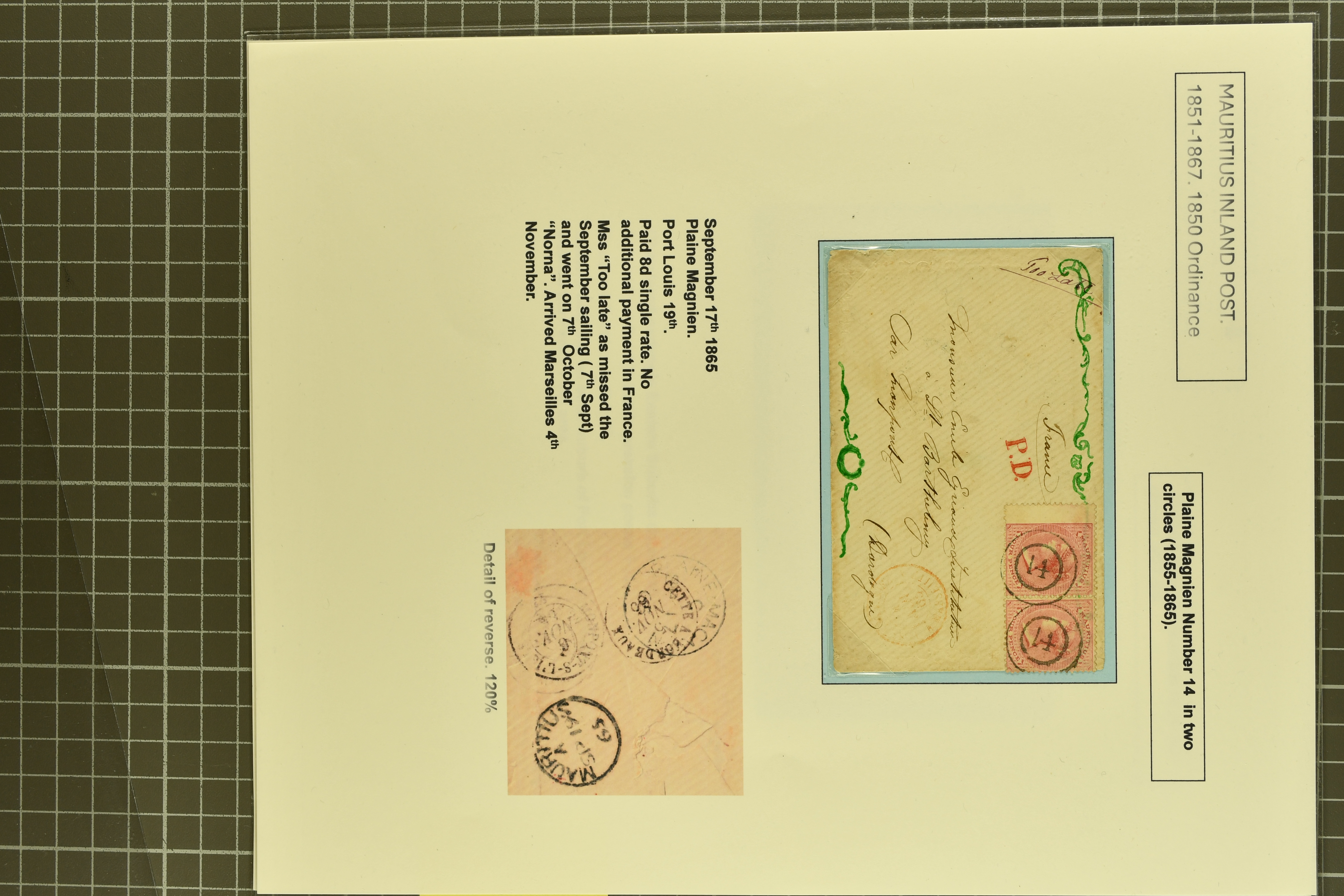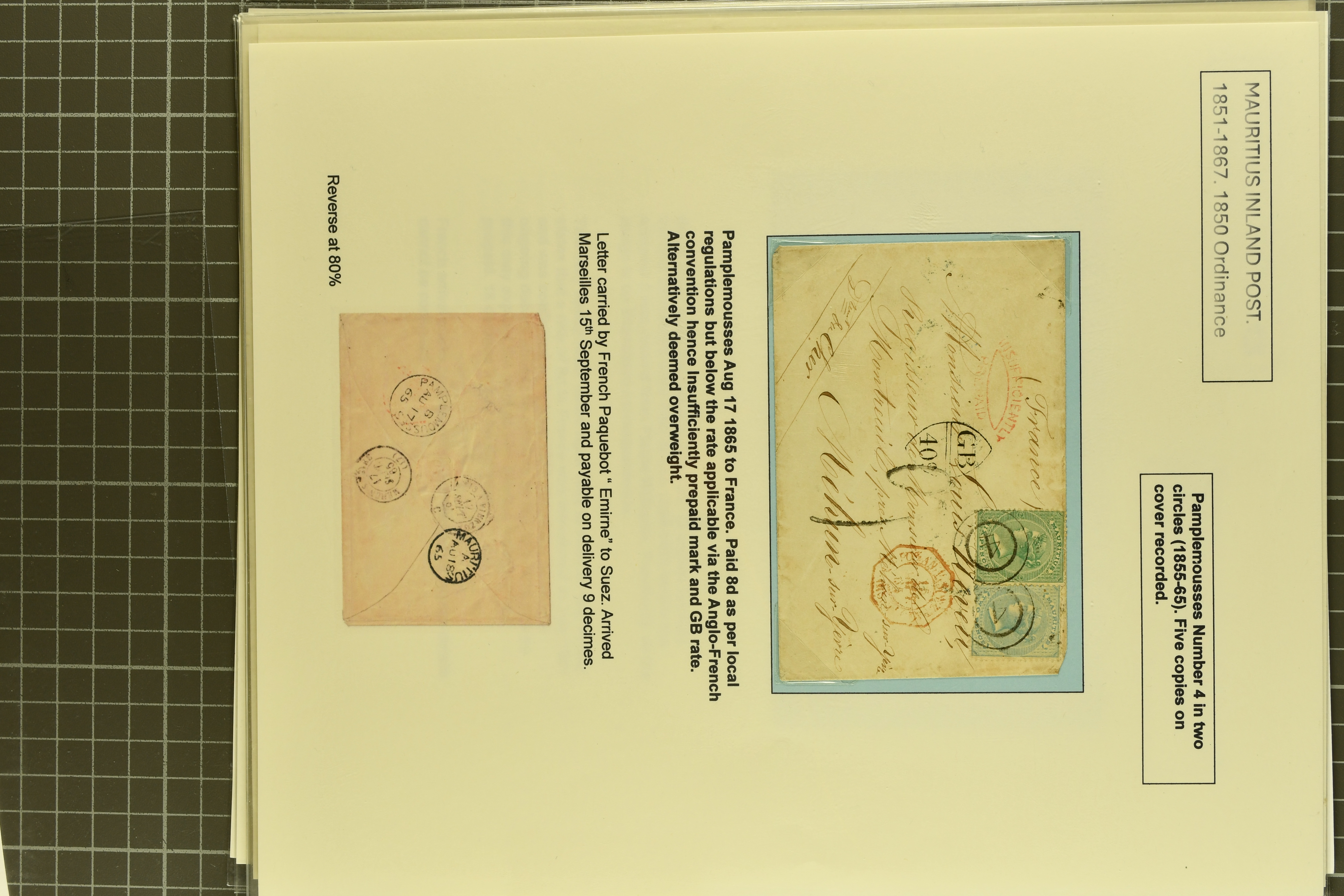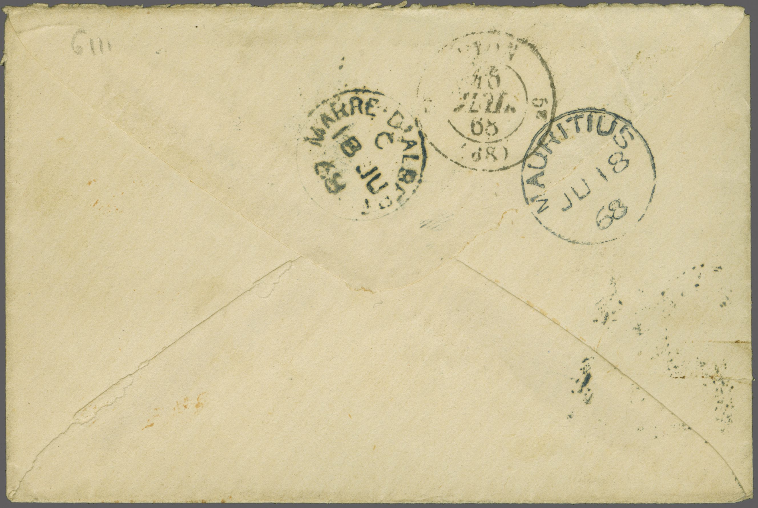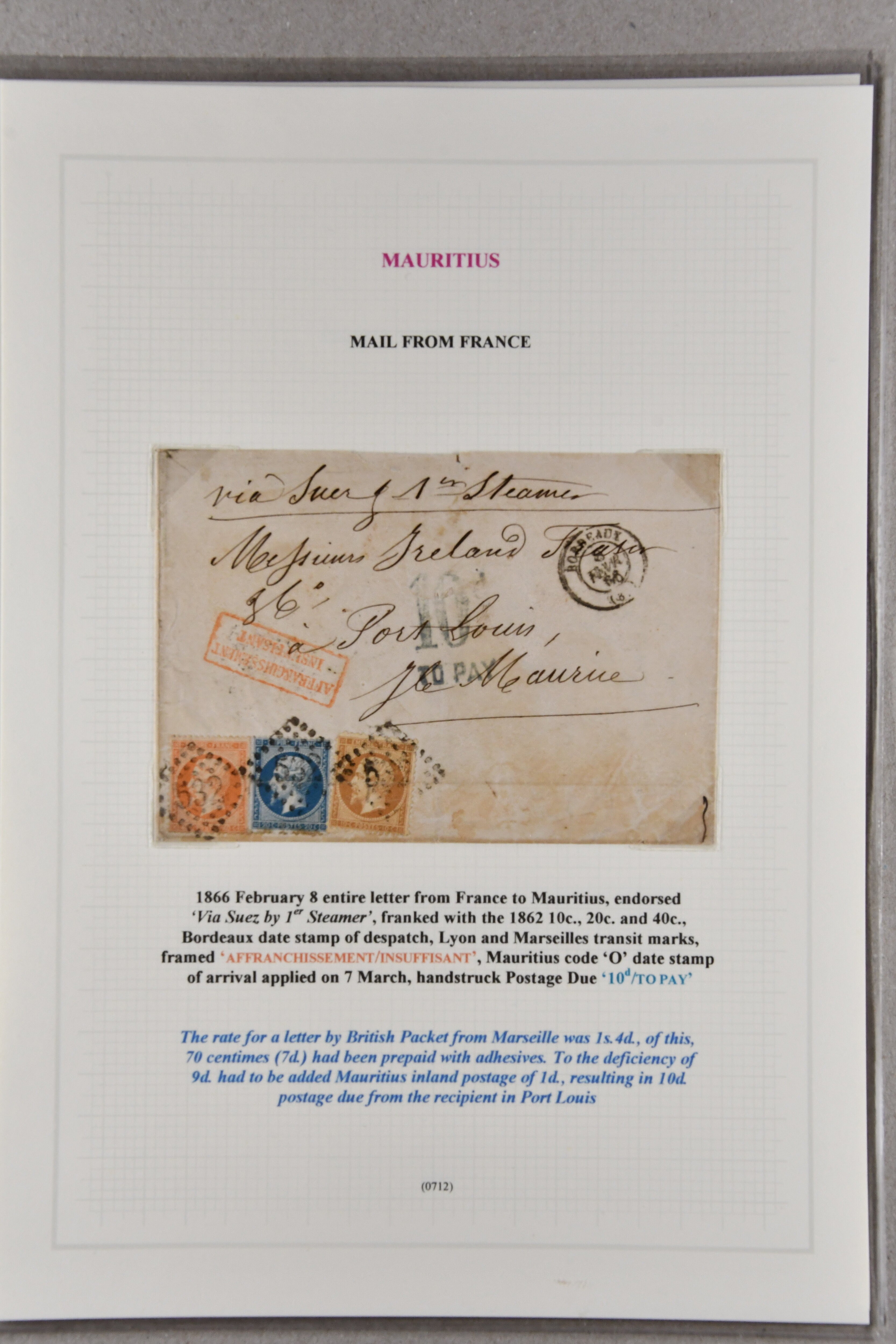 LETTER / MAURITIUS" in black to London, 1859 cover via Southampton to Hastings with oval "PACKET LETTER / MAURITIUS" in red, 1864 stampless envelope from London to Governor Higginson's wife struck with superb "4½d." rate marking in red, France 1866