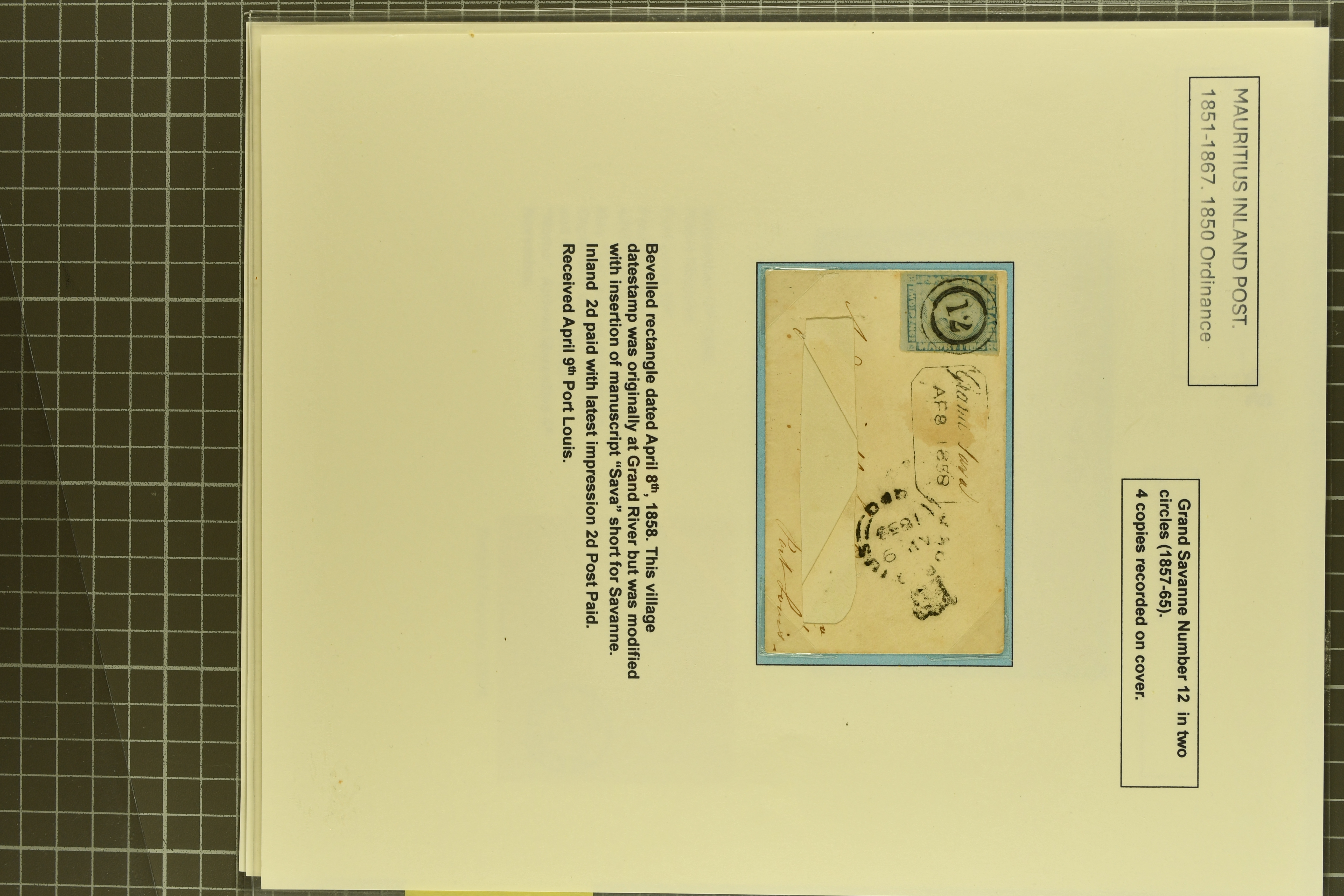 cover to Port Louis tied by "12" numeral handstamp with champfered "Grand Sava" handstamp (Proud figs K1 and D1) with "Sava" in manuscript adjacent; delightful 1865 cover to France with 4 d. rose pair tied by "14" numeral handstamps in blue with