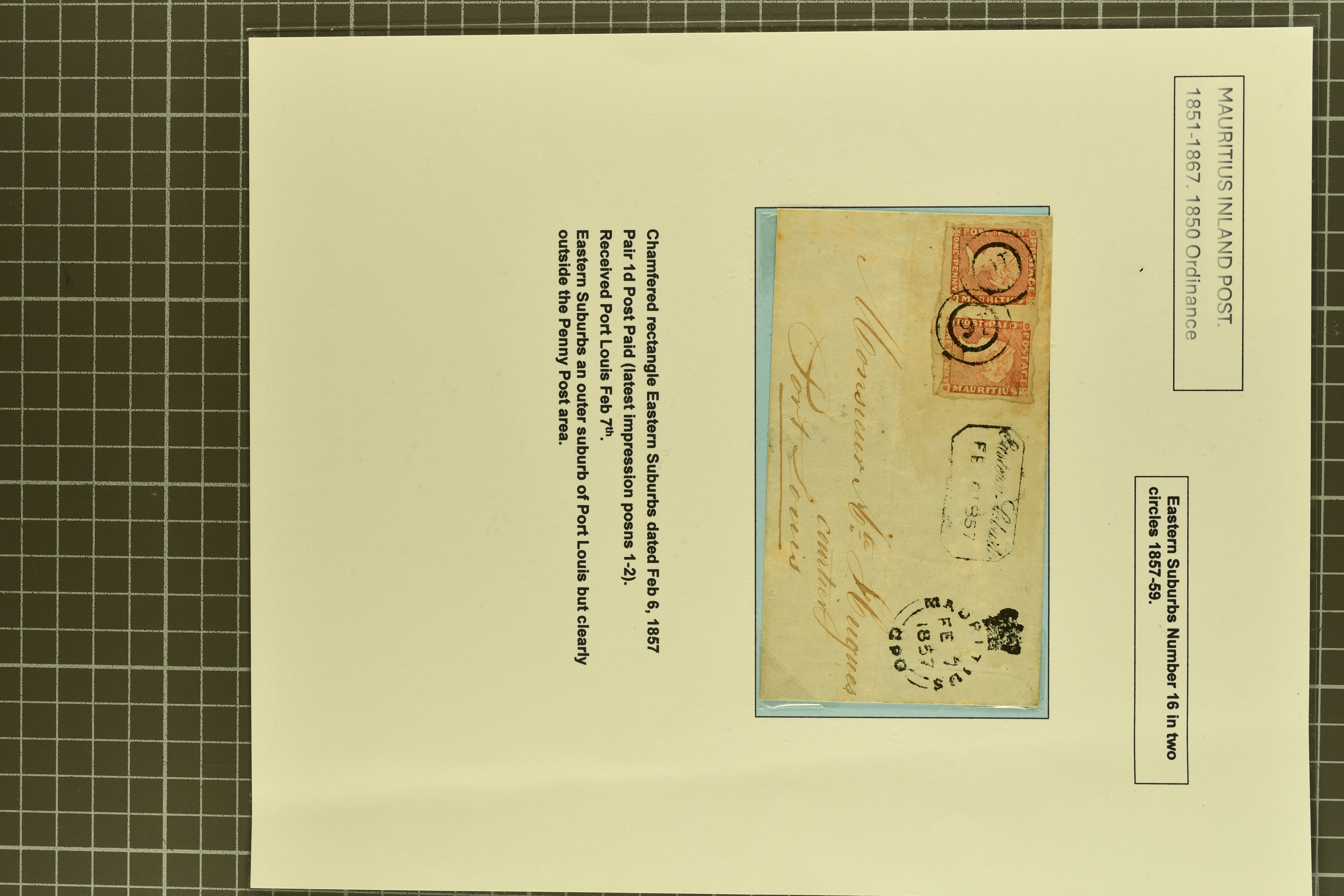 "Plaine Magnien" cds on reverse (latest recorded usage - (Proud K2 and D3) and 1857 cover to Port Louis franked by defective Post Paid 1 d. red-brown pair cancelled by "16" numeral obliterators (Proud fig. K1) with champfered "Eastern Suburb"