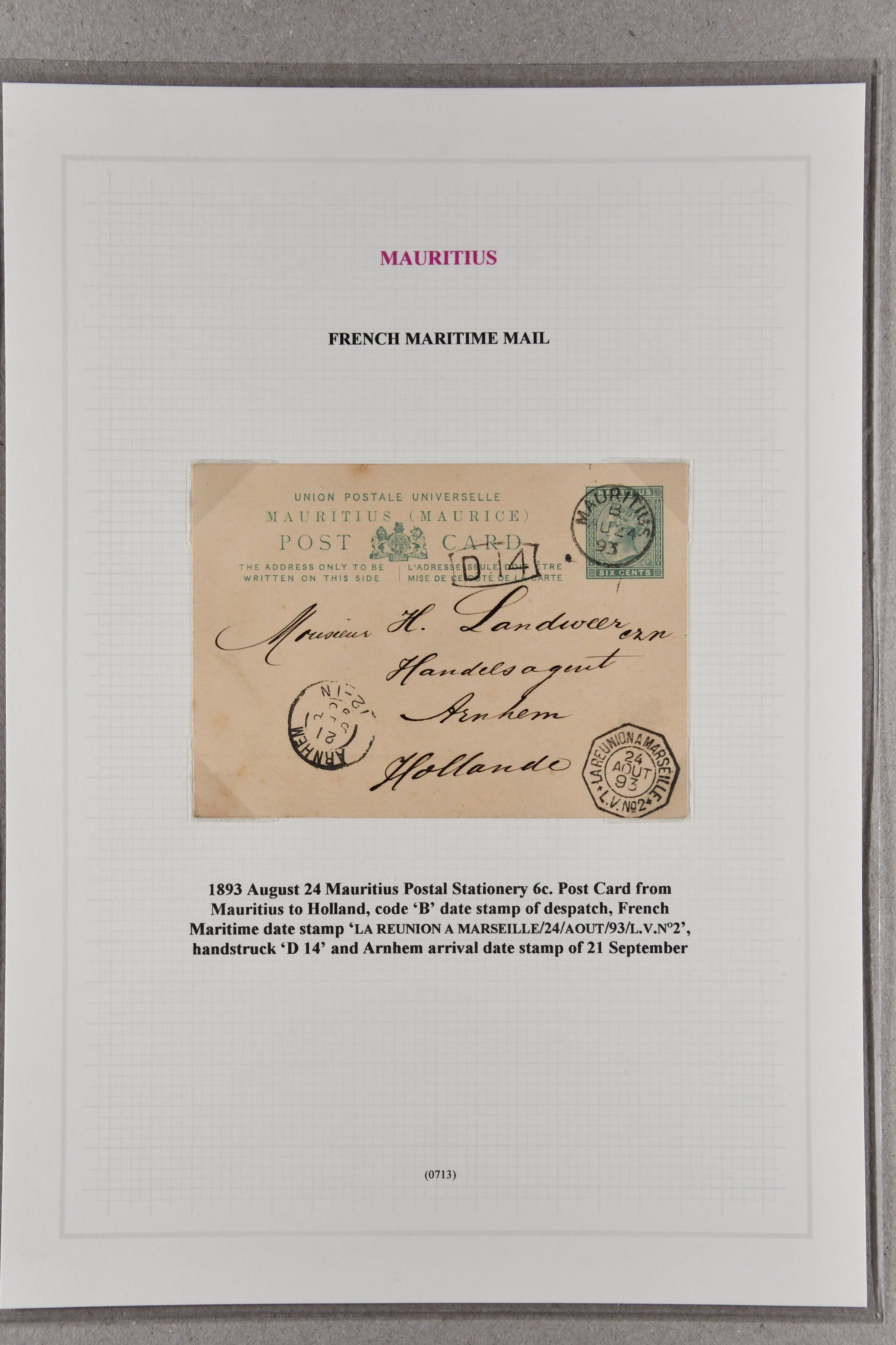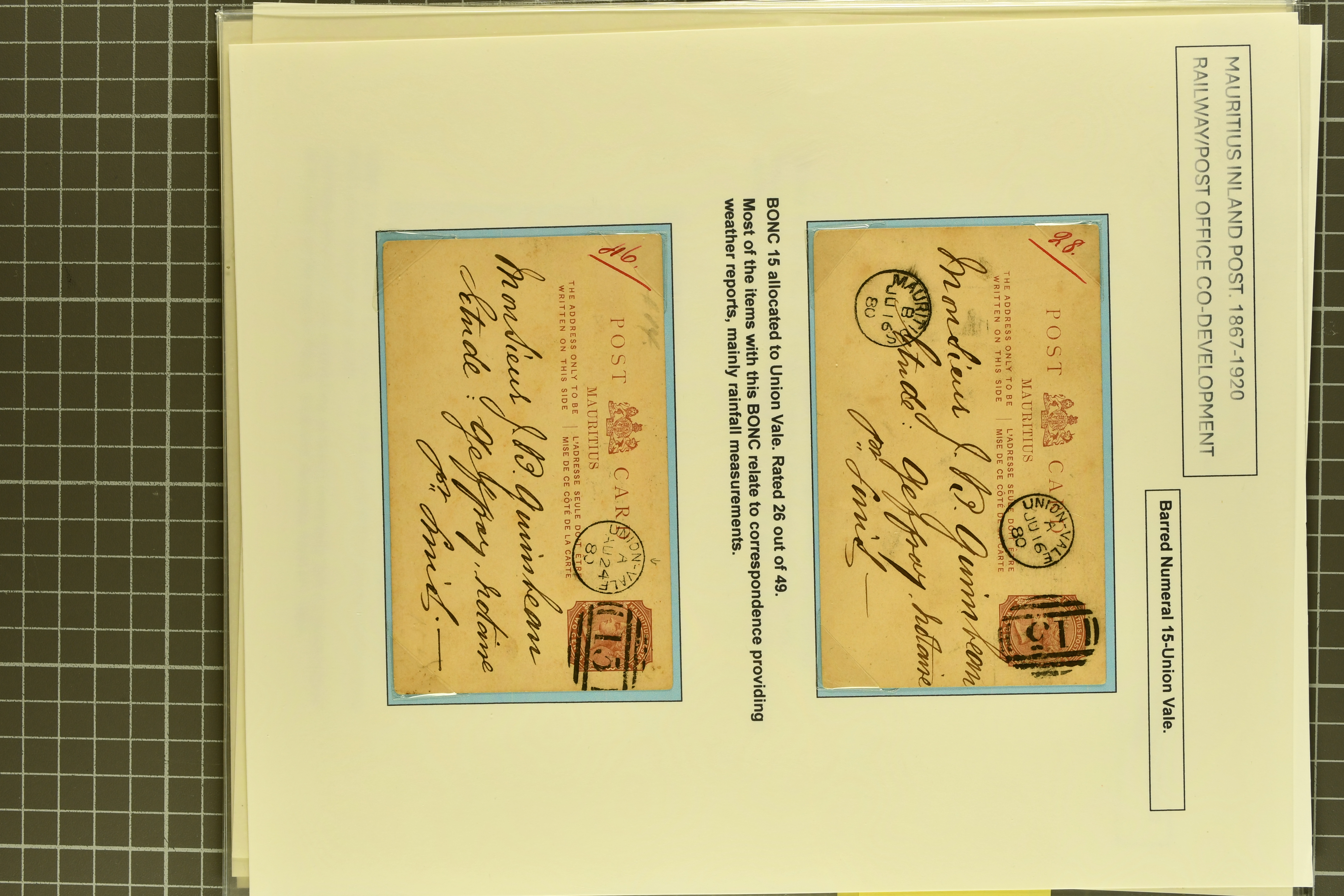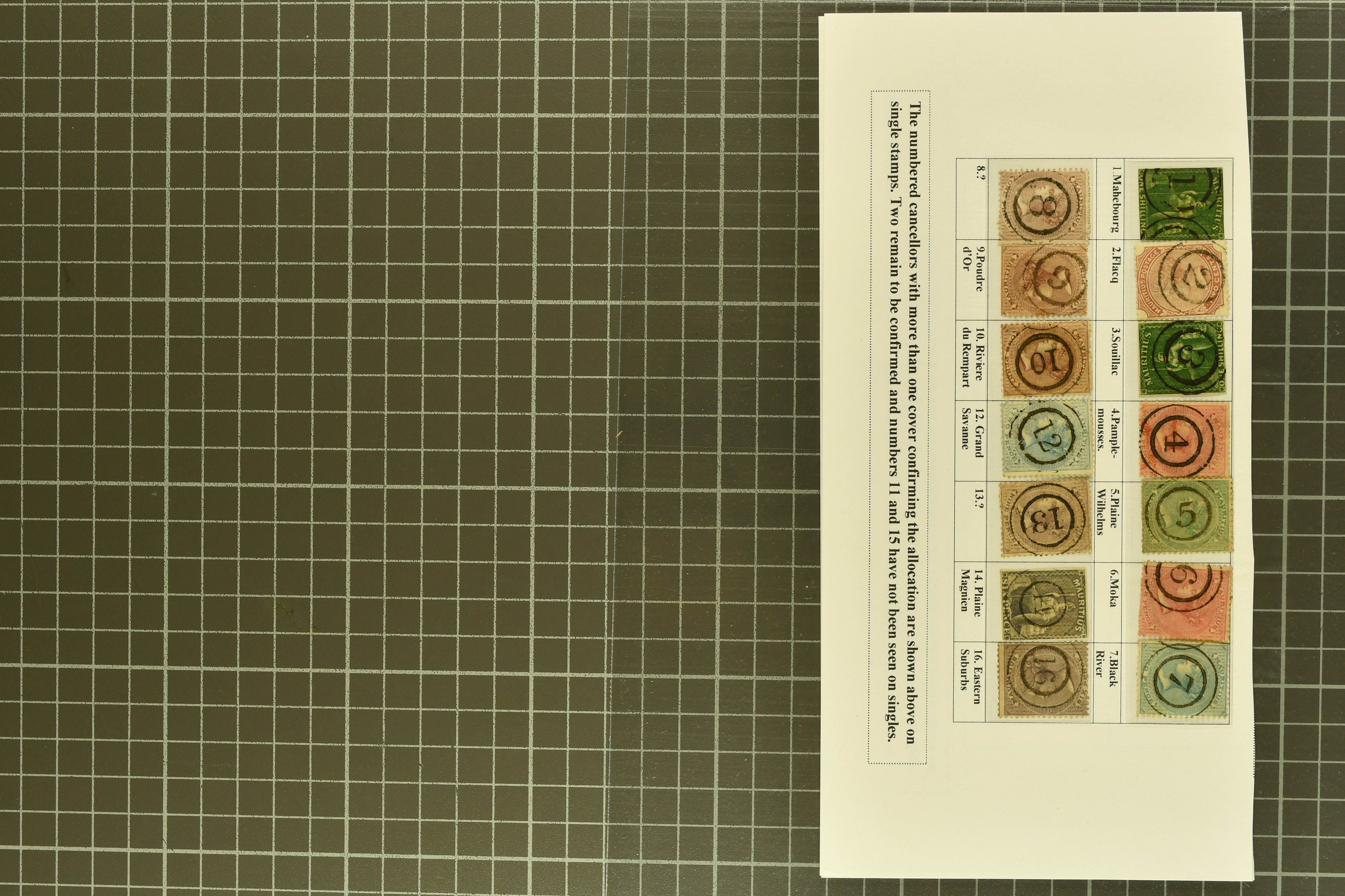 (Proud fig. K3); 2 c. brown card with Mahebourg "14" numeral; 2 c. brown cards, each being 1880 usages with superb strikes of "15" numeral of Union-Vale in black (Proud figs. K1 and D2); 1868 cover with 2 d. blue tied by bold "16" numeral in black