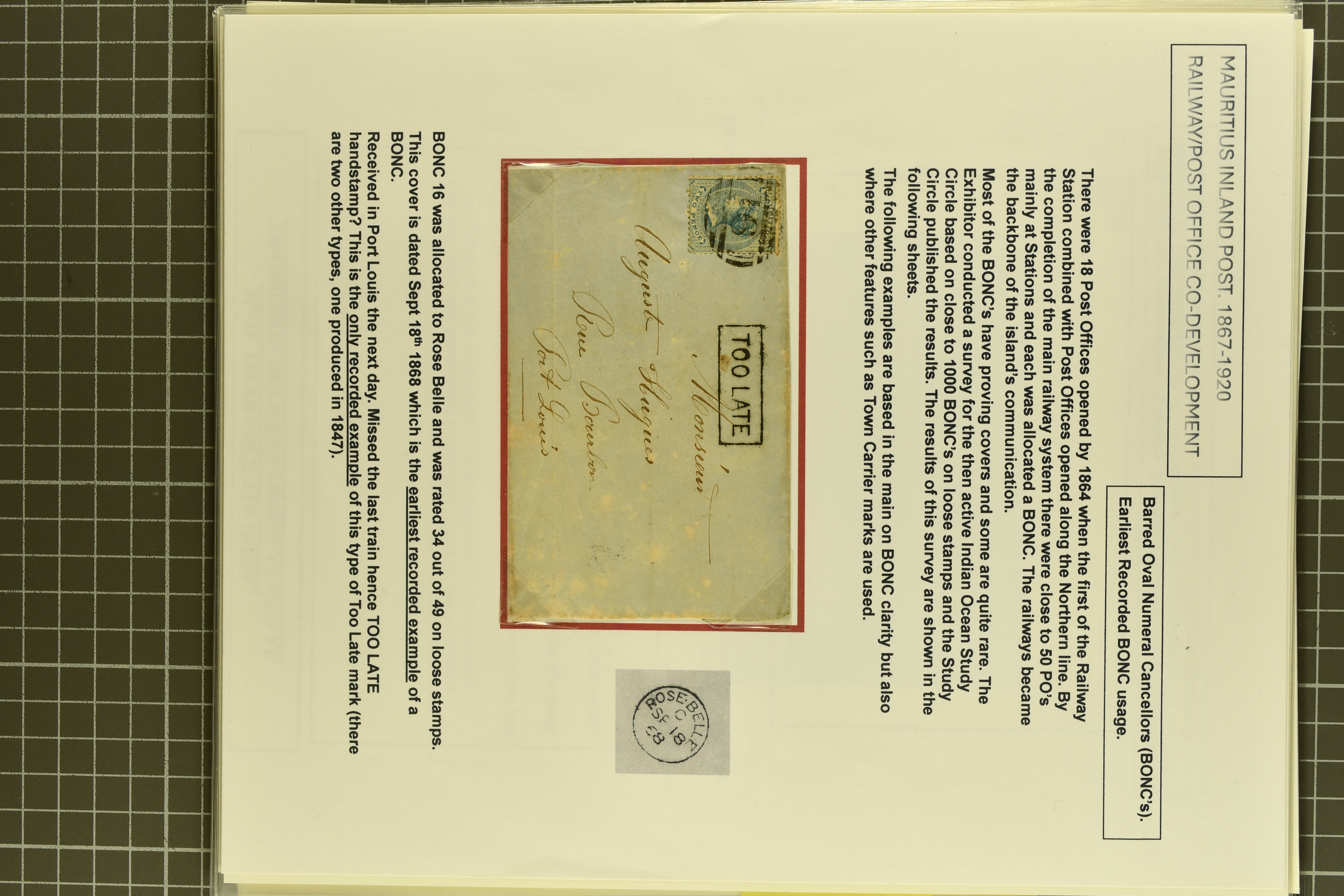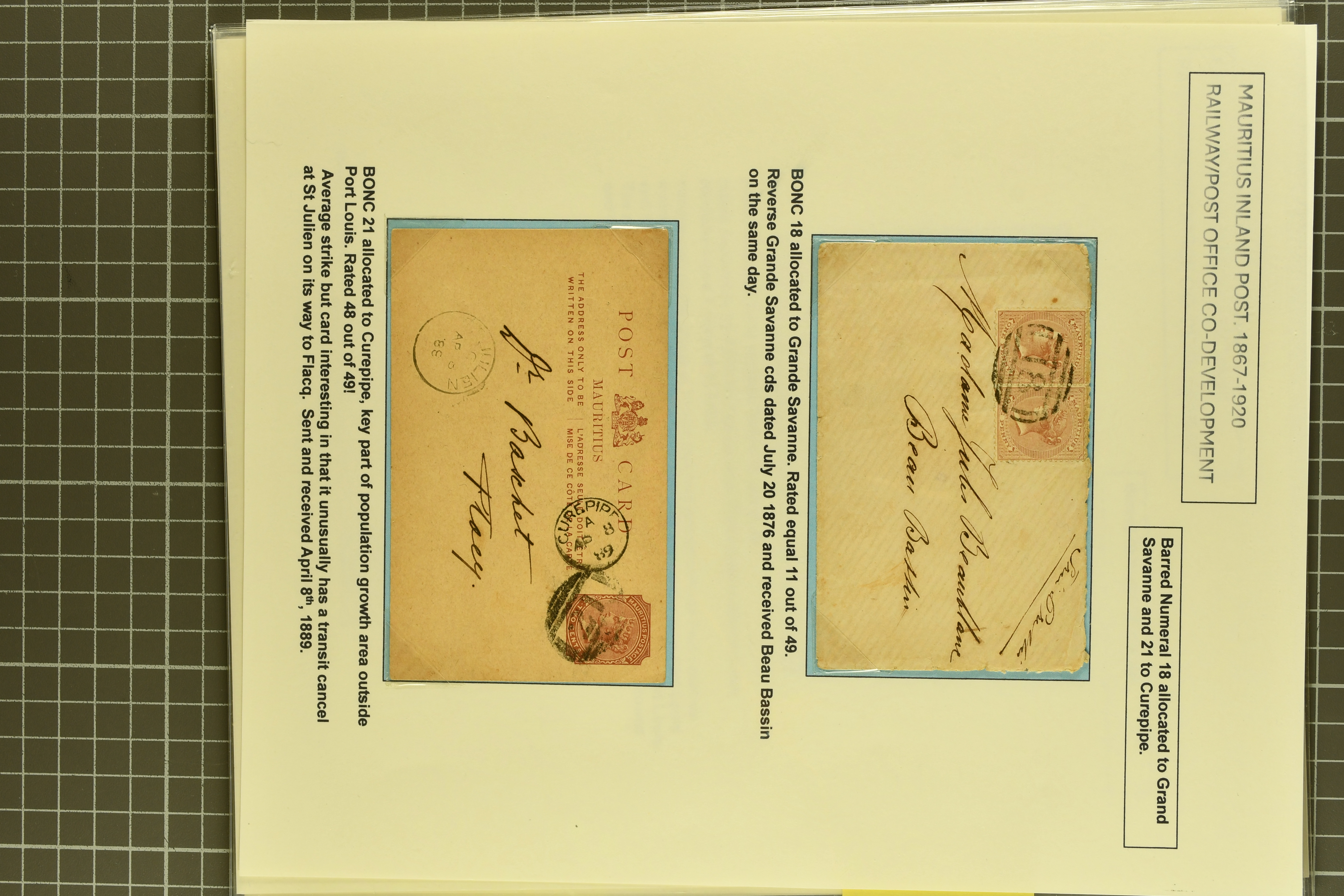 (Proud K1) with rare "TOO LATE" alongside of Rose Bellw, this being the earliest known usage of a BONC handstamp; rare 1876 cover to Beau Bassin with 1 d. brown pair tied by bold "18" numeral of Grand Savane (Proud figs. K2 and D2); 2 c. brown card