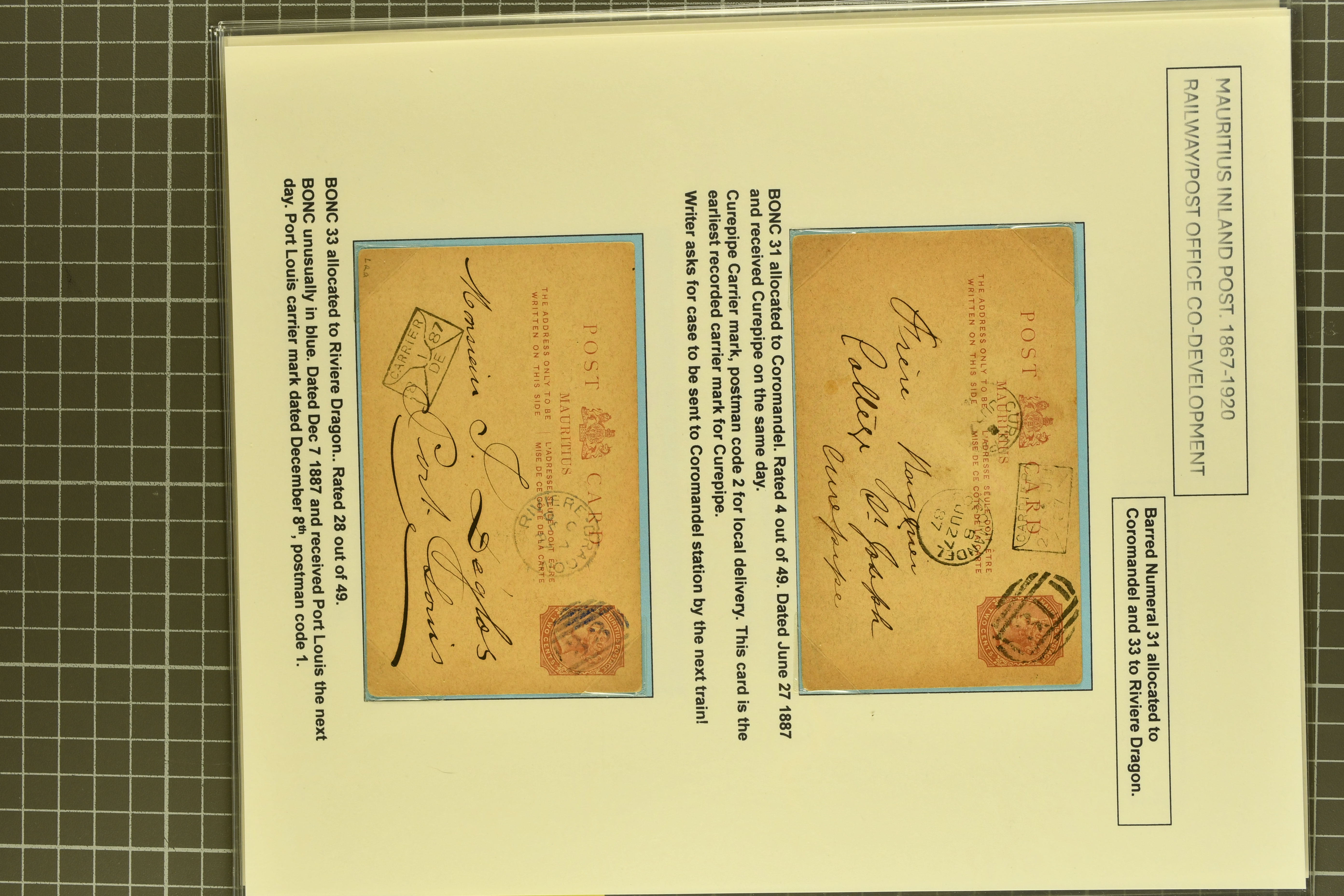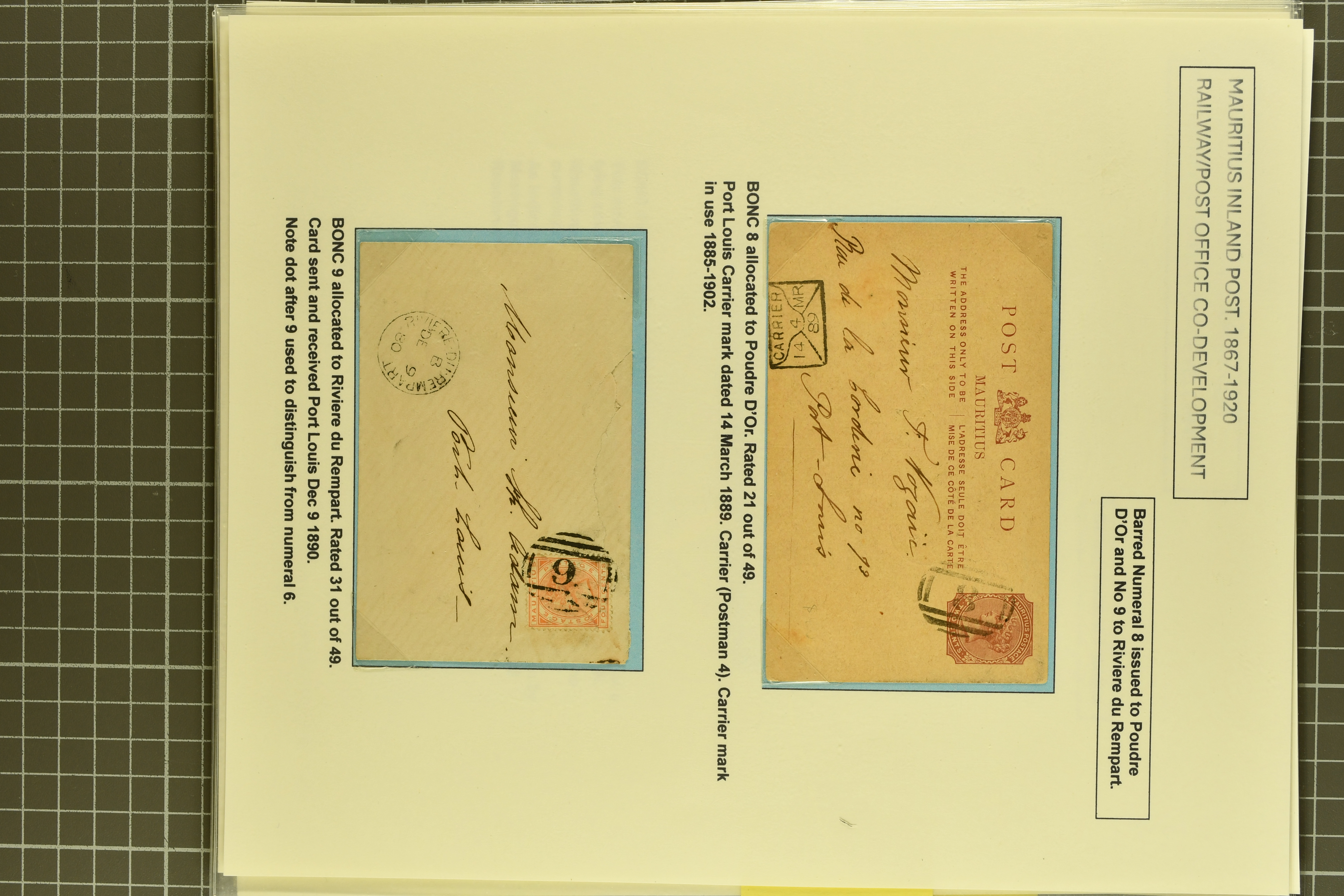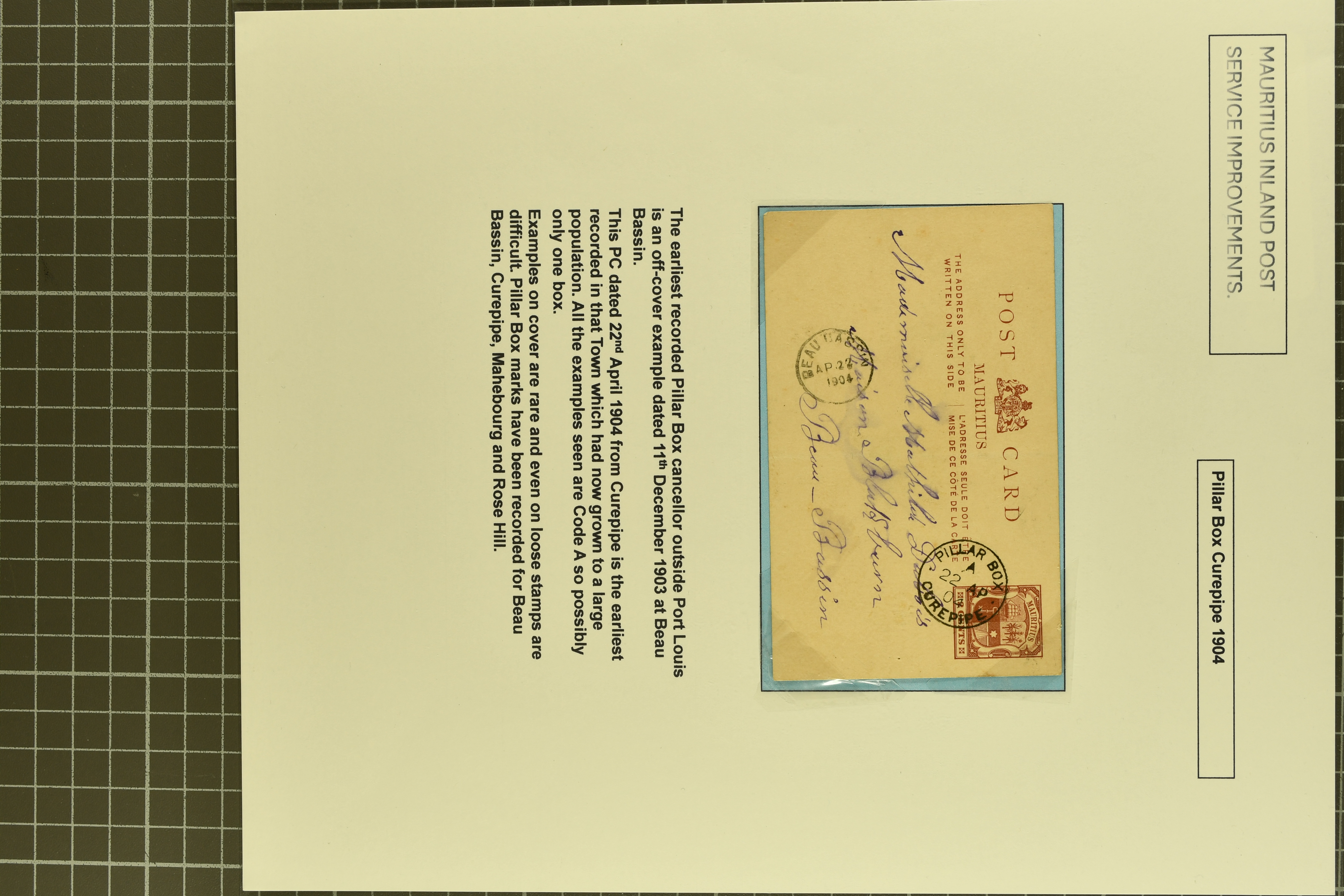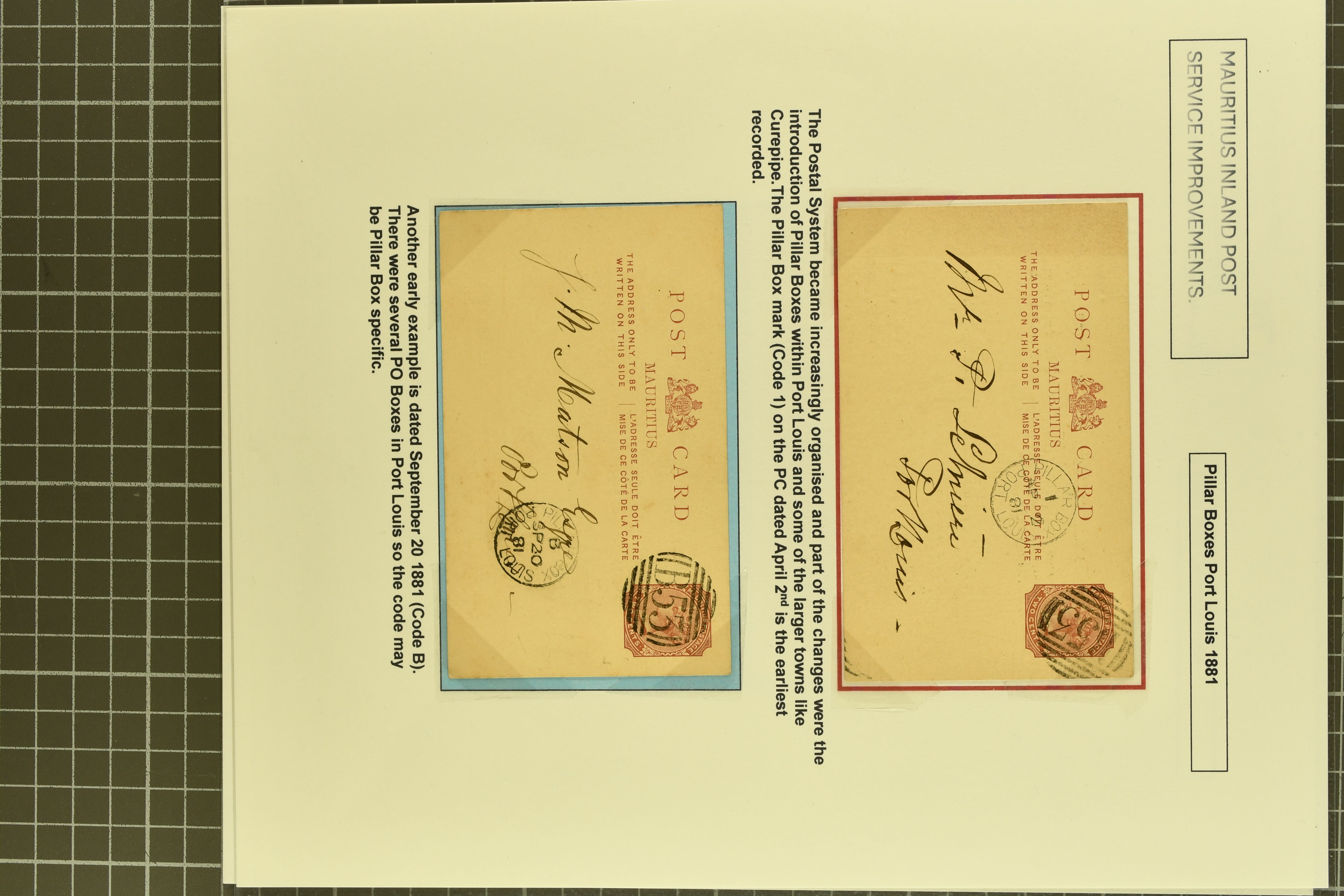 card with PILLAR BOX / B / PORT LOUIS cds (20 Sept 1881) in black (As Proud fig. D100, code B unlisted); and 2 c. brown card used to Beau-Bassin cancelled by bod strike of PILLAR BOX / A / CUREPIPE in black (22 April 1904) - a rare early usage as