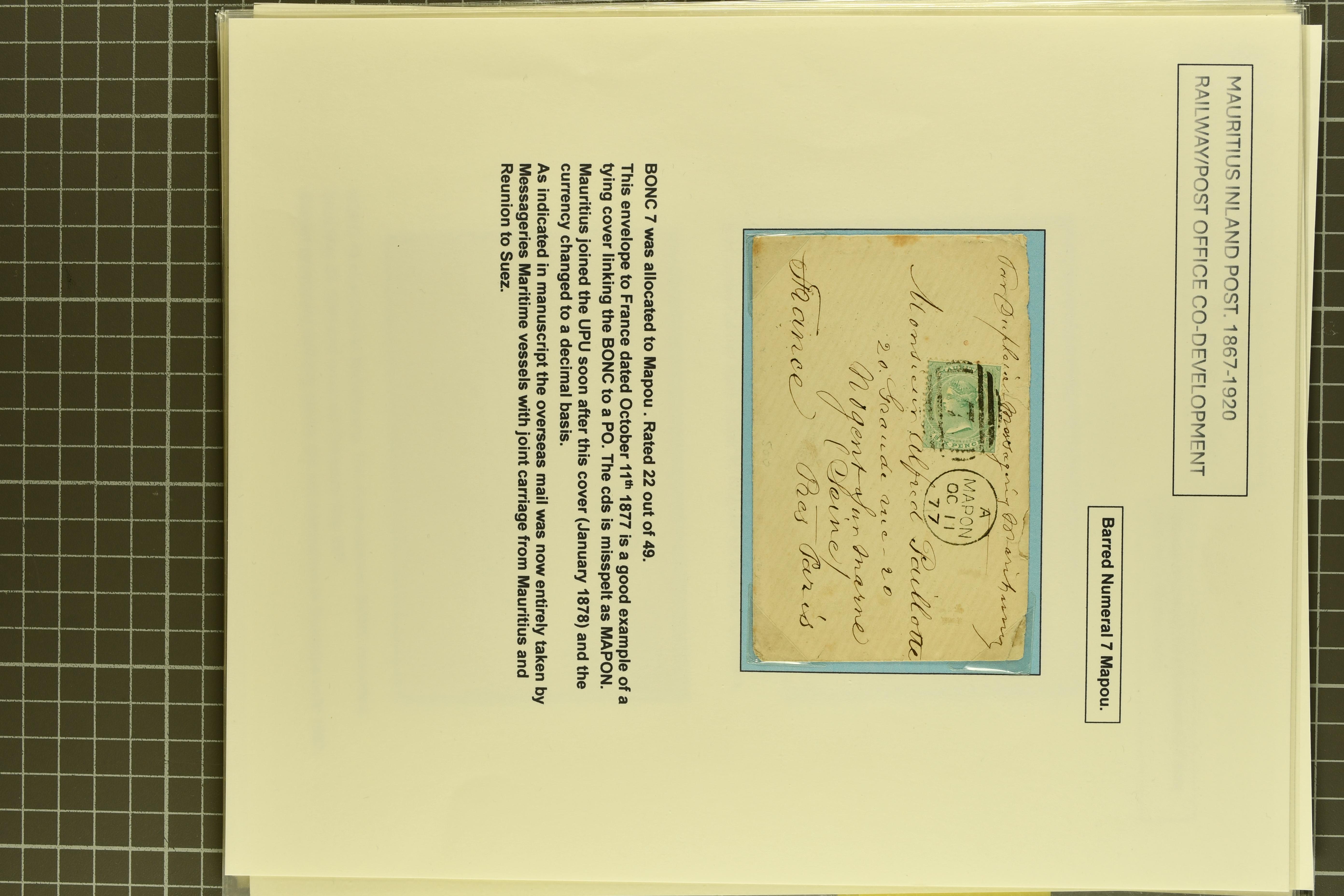 numeral (Proud fig. K2 - first week of use); rare 1877 cover from Mapou with 6 d. green to France tied by "7" numeral (Proud K2 - earliest recorded date of use) with mis-spelt MAPON cds alongside; 2 c. brown card cancelled by Flacq "10" numeral