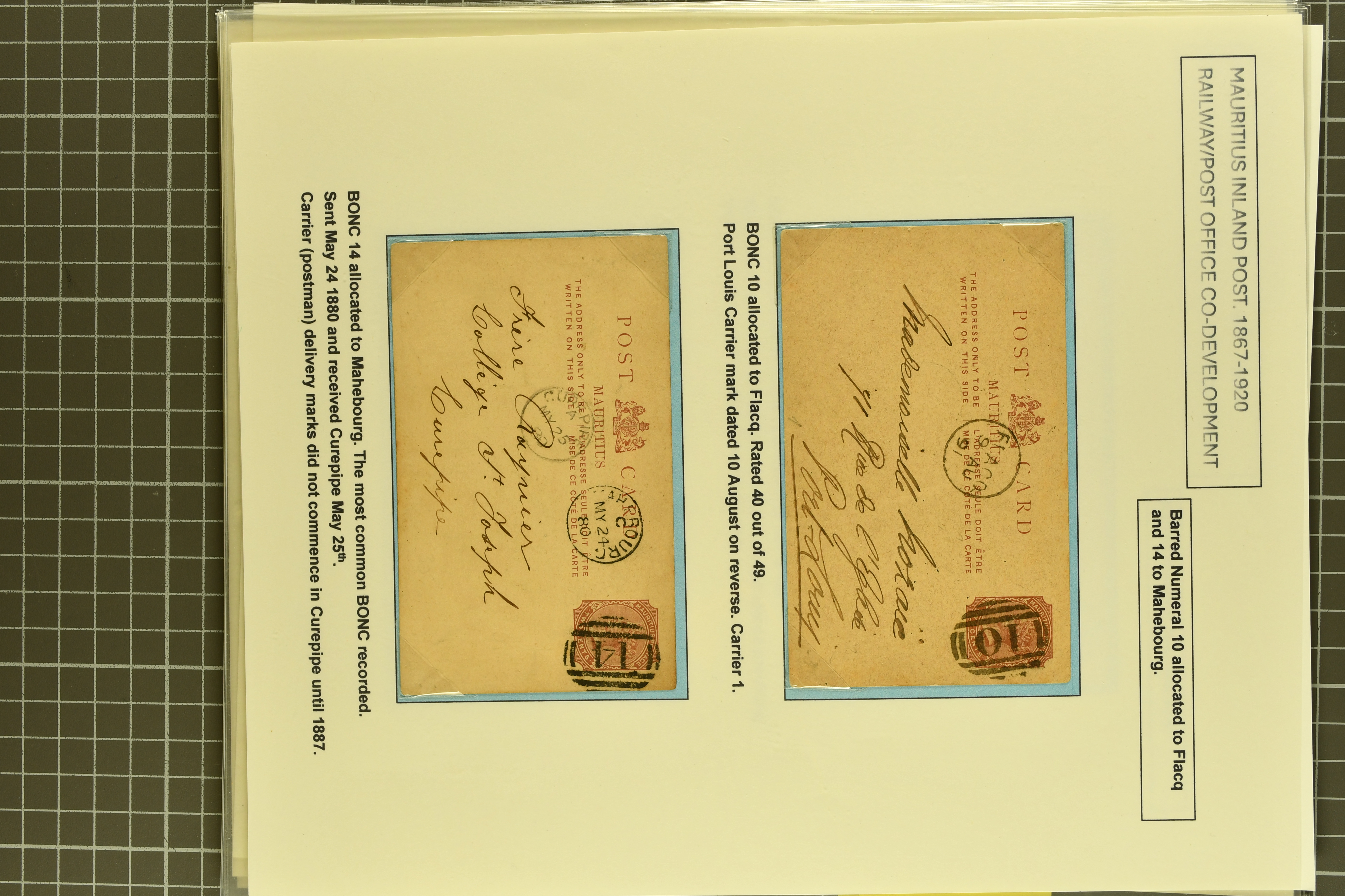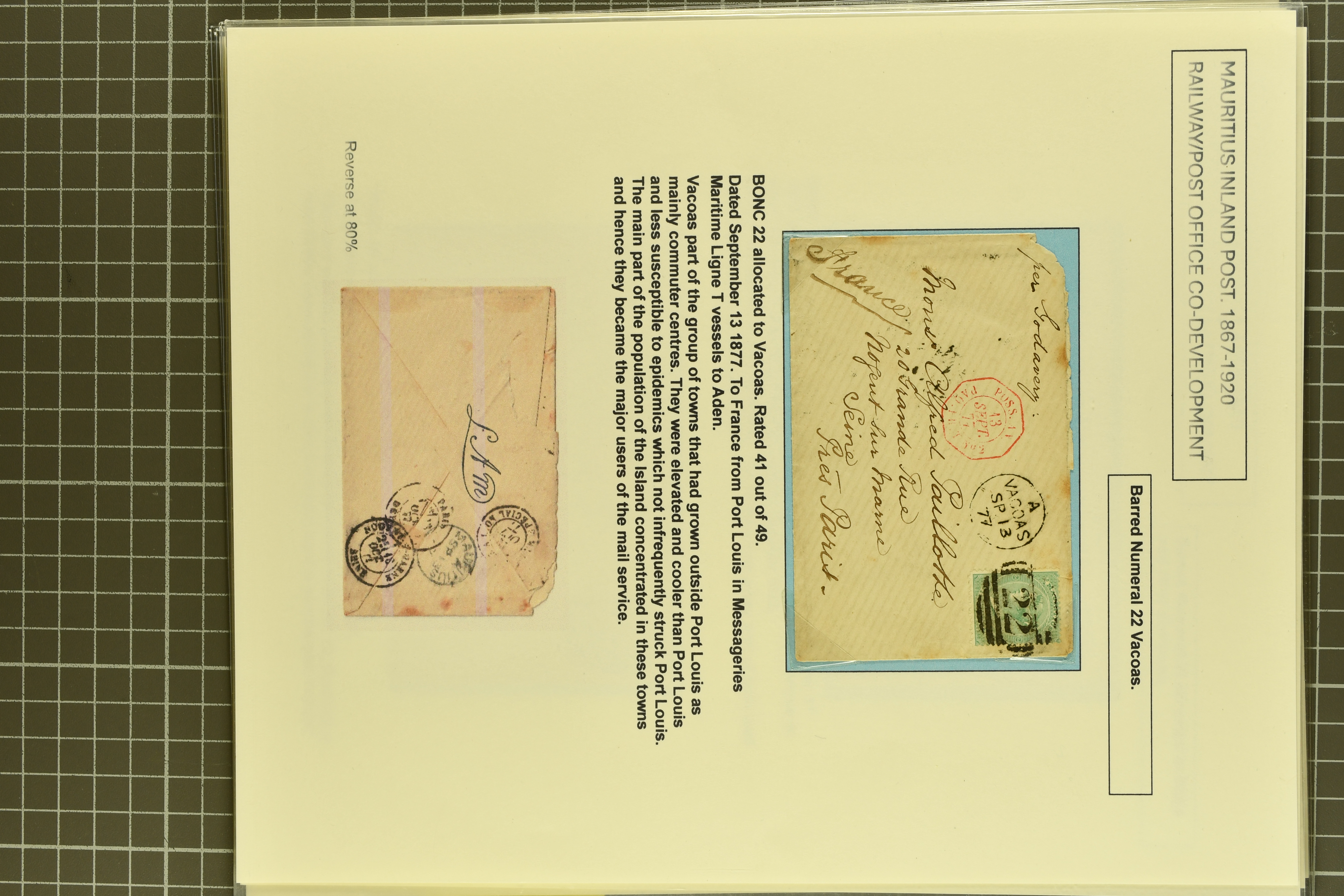 with "21" numeral of Curepipe mailed via St. Julien to Flacq - one of the rarest BONC numbers (Proud fig. K2); 1877 cover to France with 6 d. green tied by bold "22" numeral (Proud fig. K2 - earliest recorded date of use); 2 c. brown card with Moka