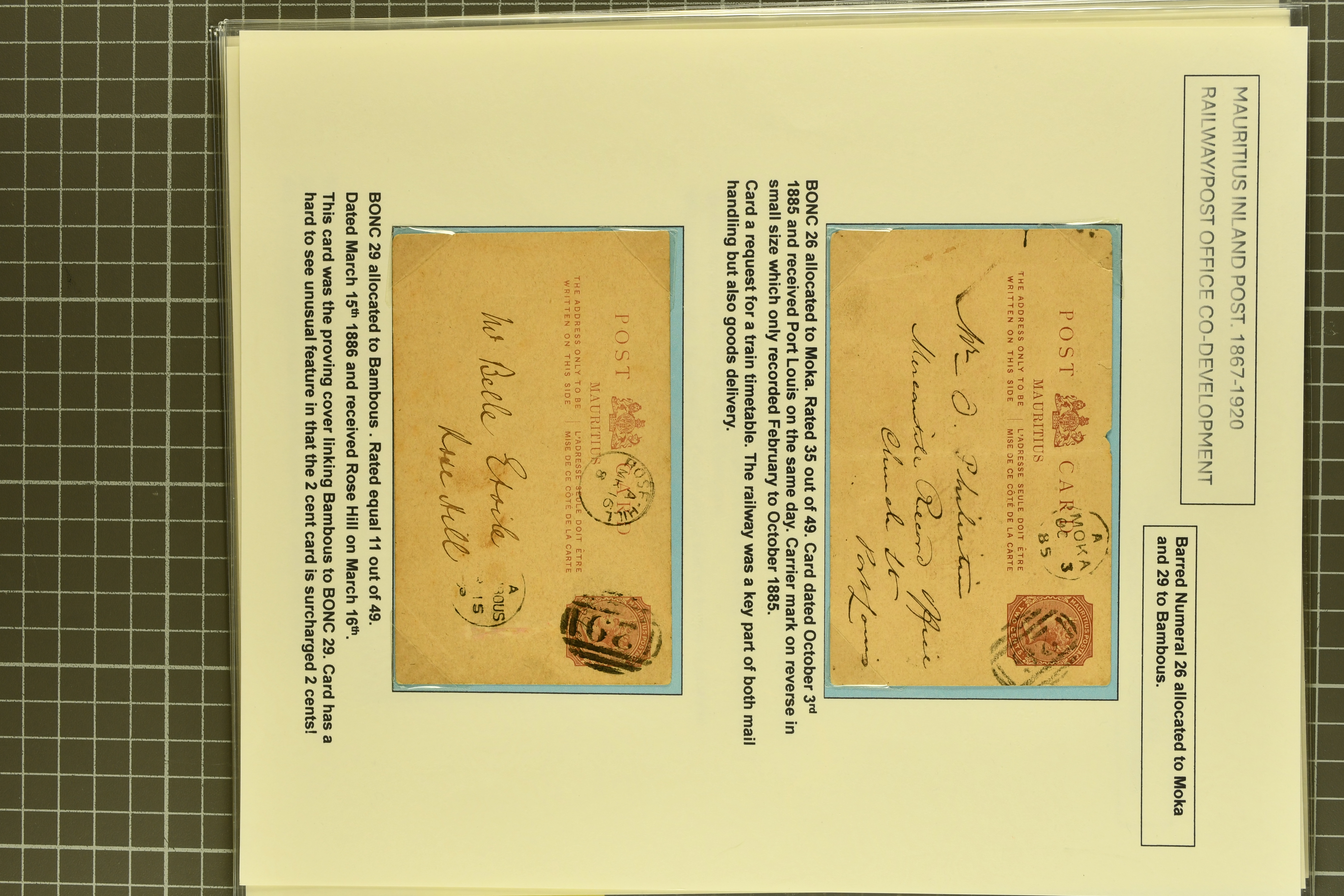 "26" numeral; 2 c. on 2 c. brown card with "29" numeral of Bambous - the proving card for this cancellation (Proud fig. K1); 2 c. brown card with rare "31" numeral of Coromandel; 2 c. brown card with "33" numeral of Rivieree Dragon struck in blue; 2