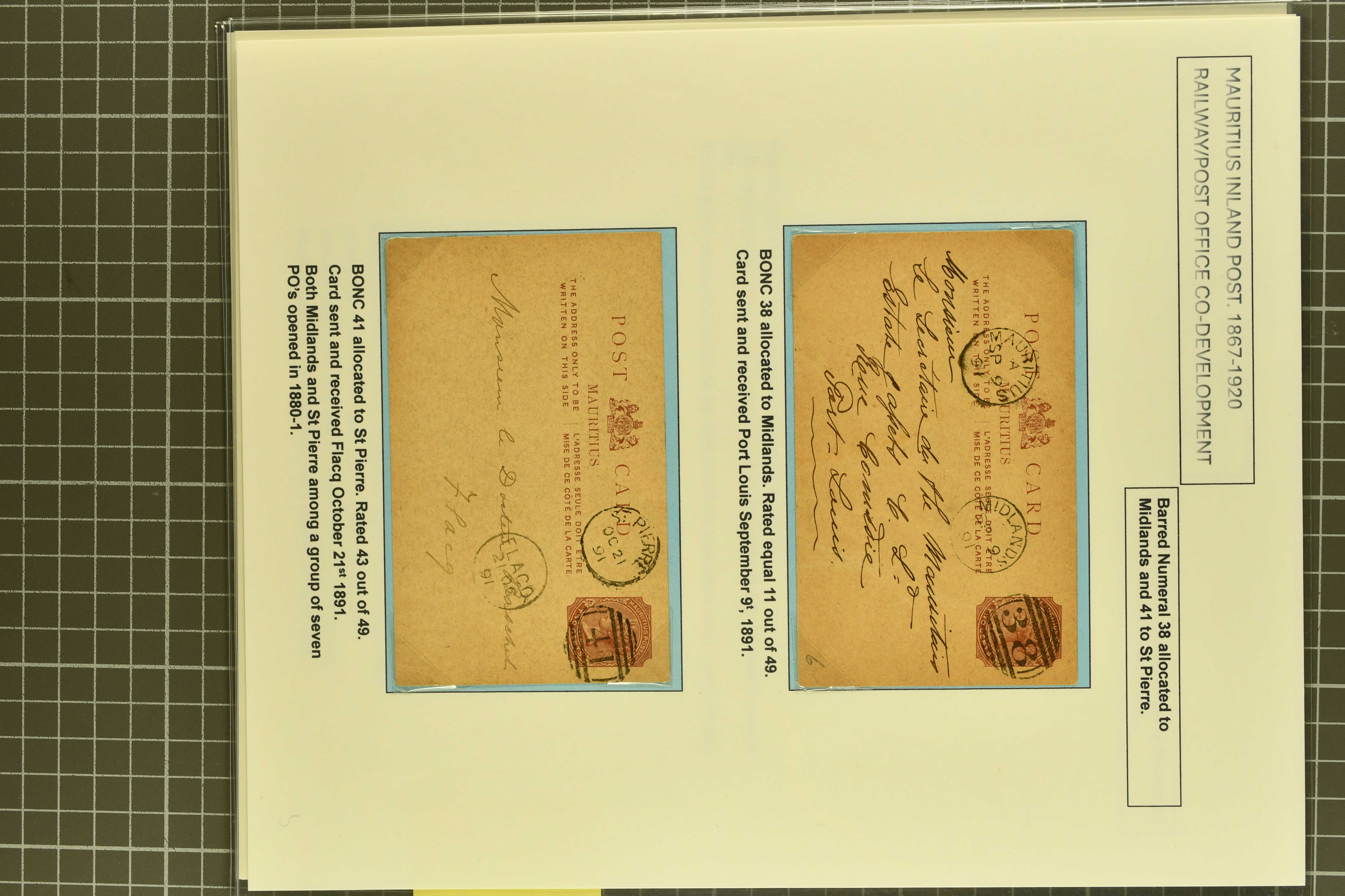 c. brown card with "38" numeral superbly struck with Midlands cds alongside; 2 c. brown card with superb "41" numeral of St. Pierre (Proud K1 - latest date of use now recorded) dated 21 Oct 1891 used to Flacq; 2 c. card with rare "B44" obliterator