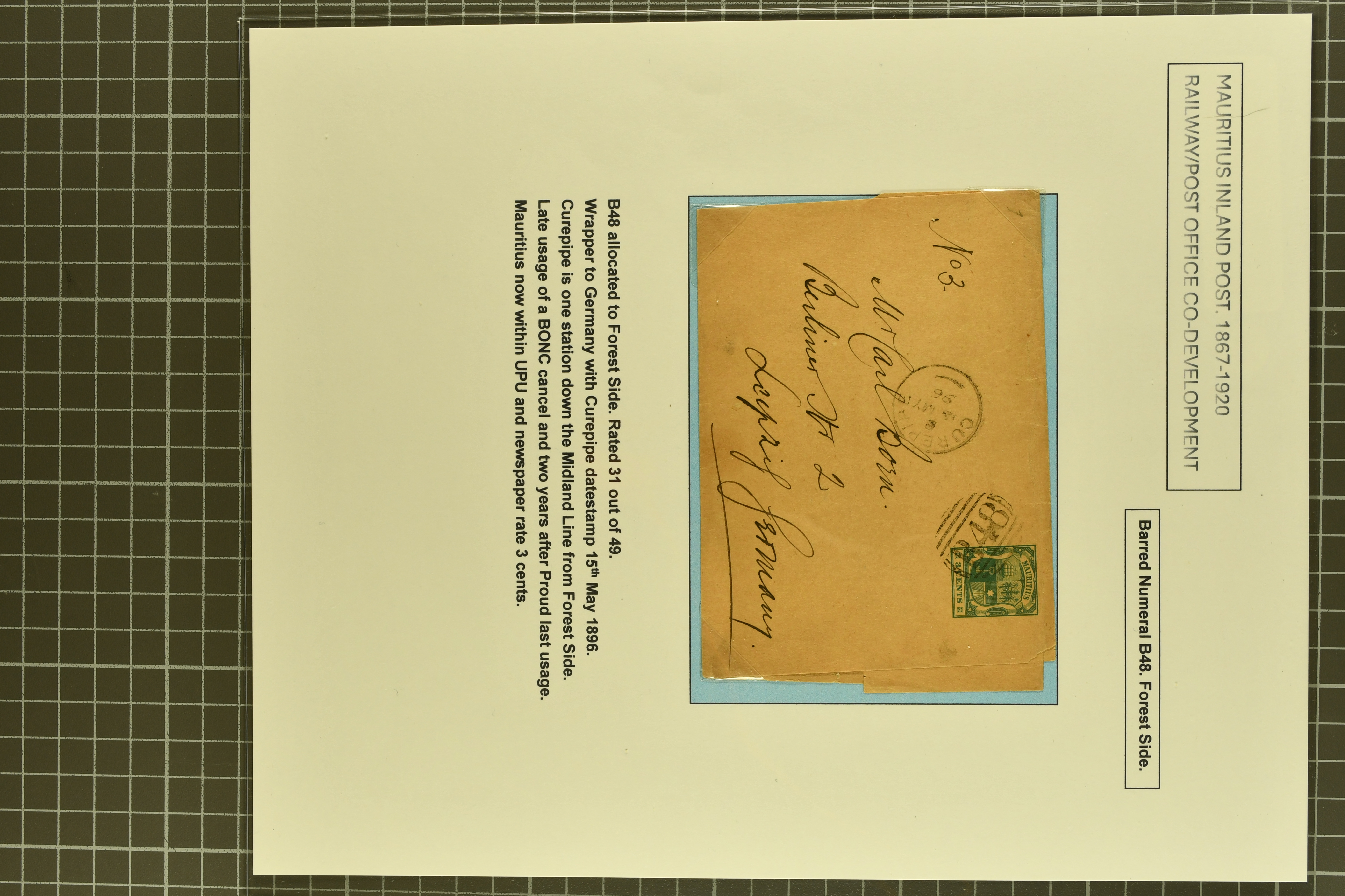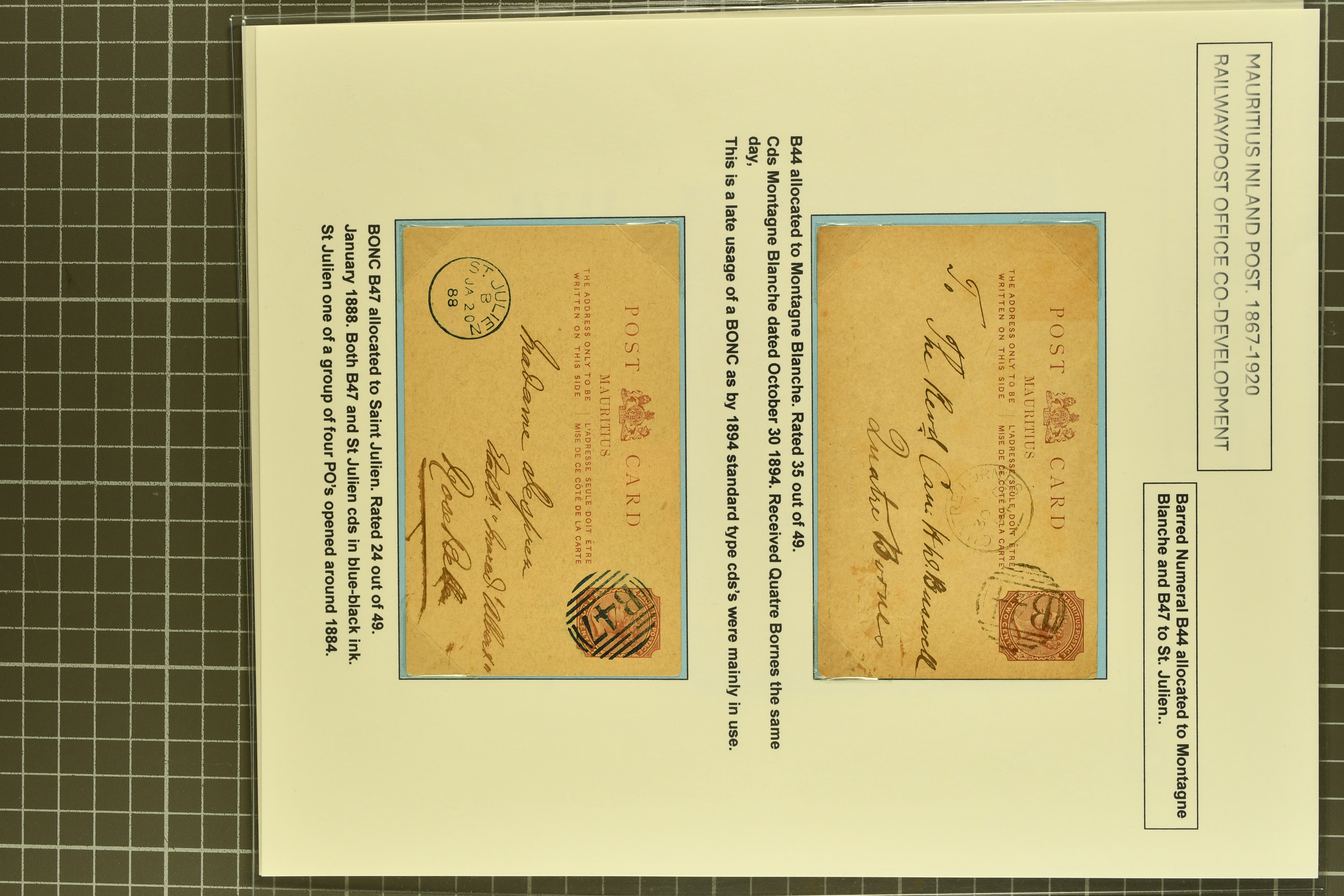 oif Montagne Blanche; 2 c. brown card with perfect "B47" obliterator in blue of St. Julien (Jan 20, 1888); 3 c. stat. wrapper with "B48" of Forest Side in black (Proud K1 - now the latest known usage). An outstanding collection with nearly all