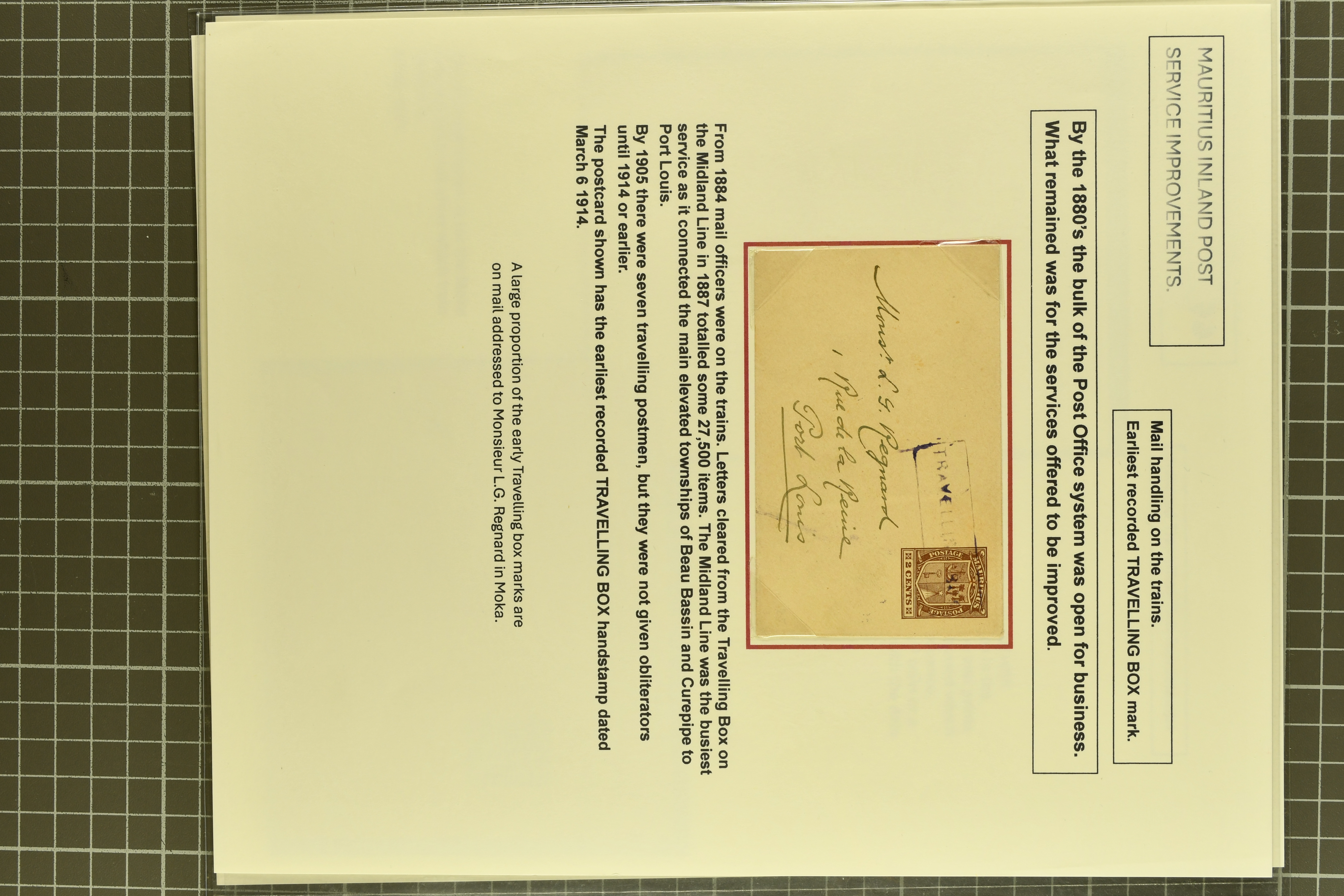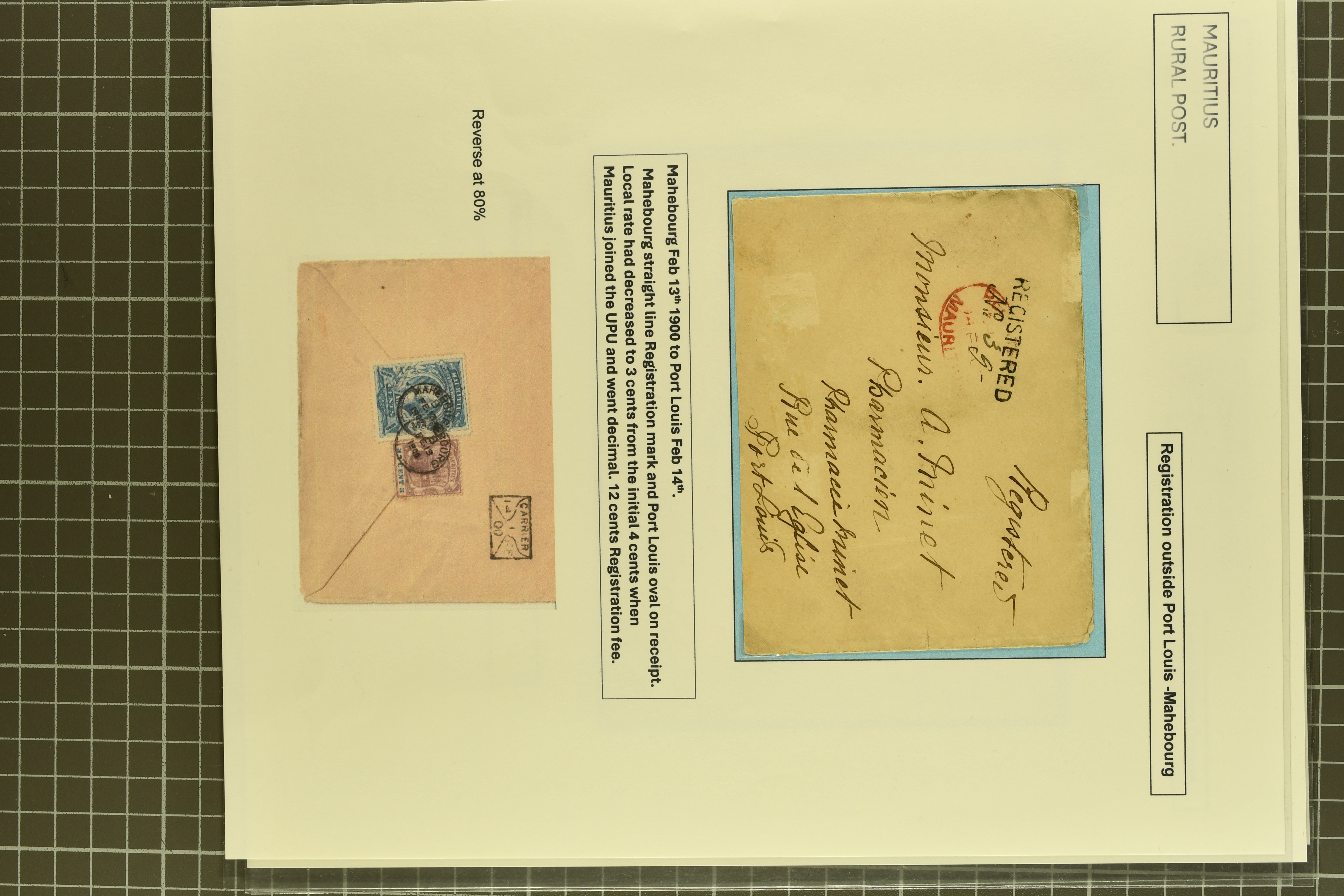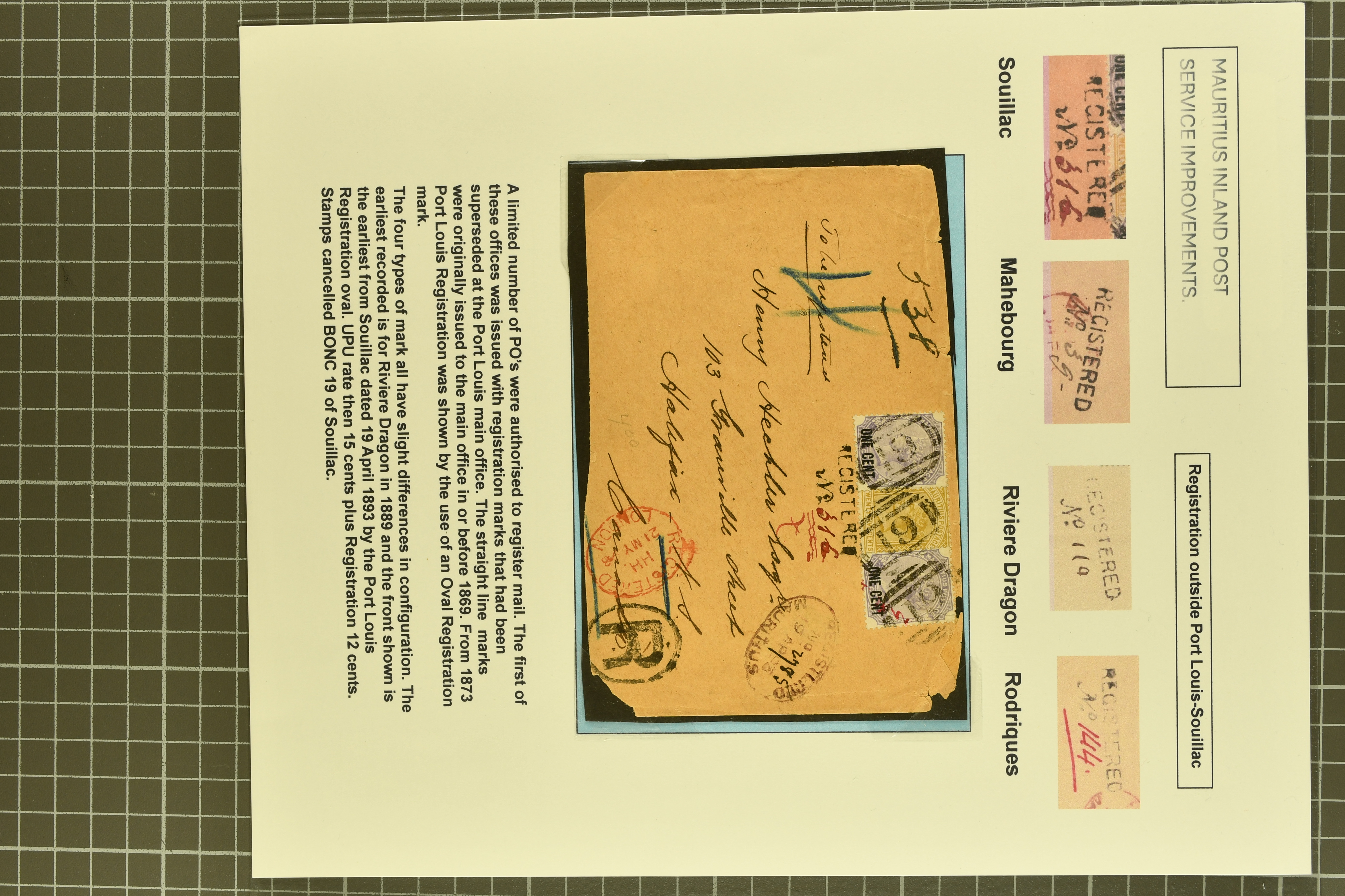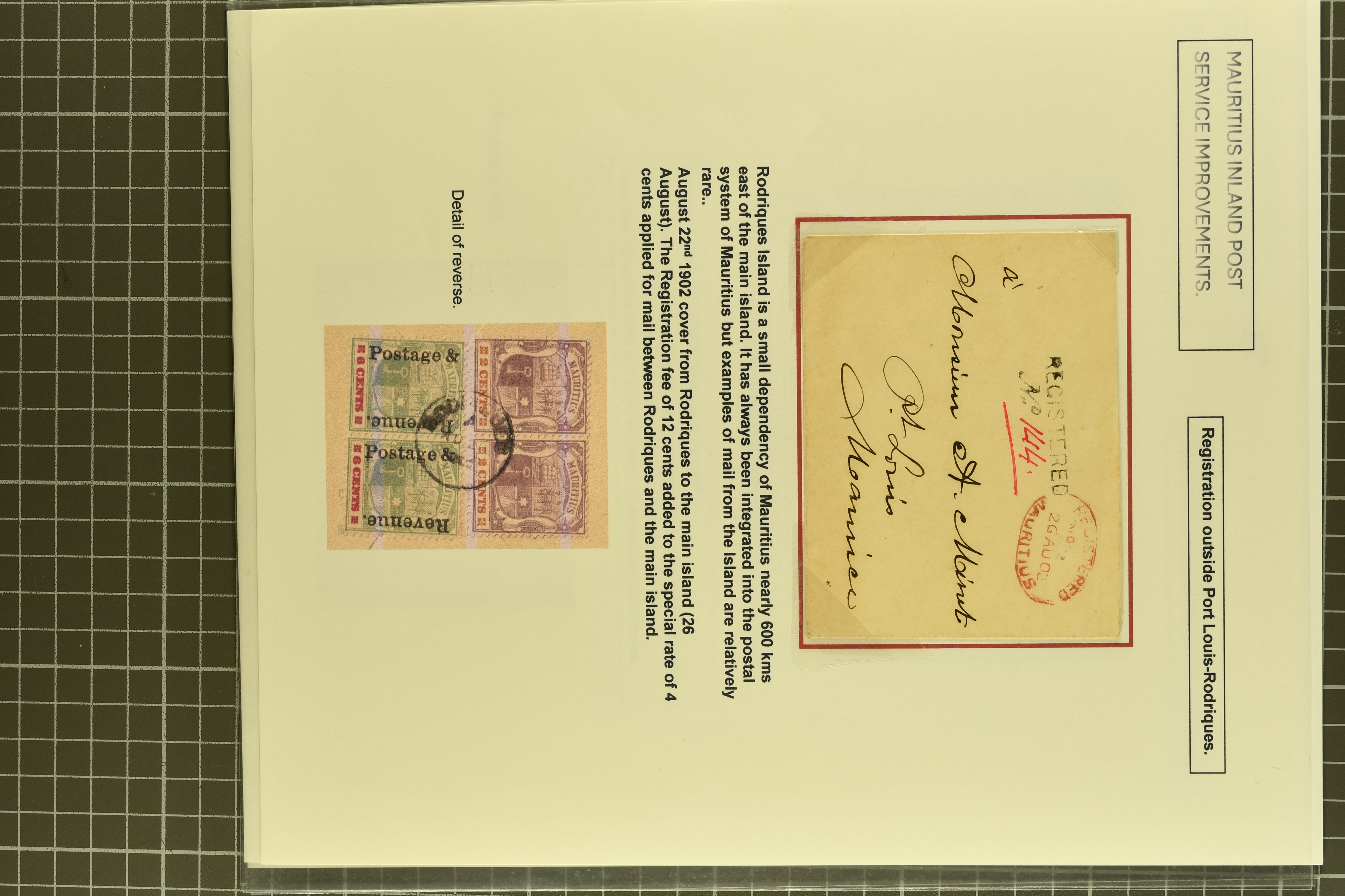 usage (Proud fig. R1); 1900 cover from Mahebourg to Port Louis franked at 16 c. with "REGISTERED / No." handstamp in black on obverse (Proud fig. R1); rare 1902 cover registered from Island of RODRIGUES to Port Louis at special reduced rate of 16 c.