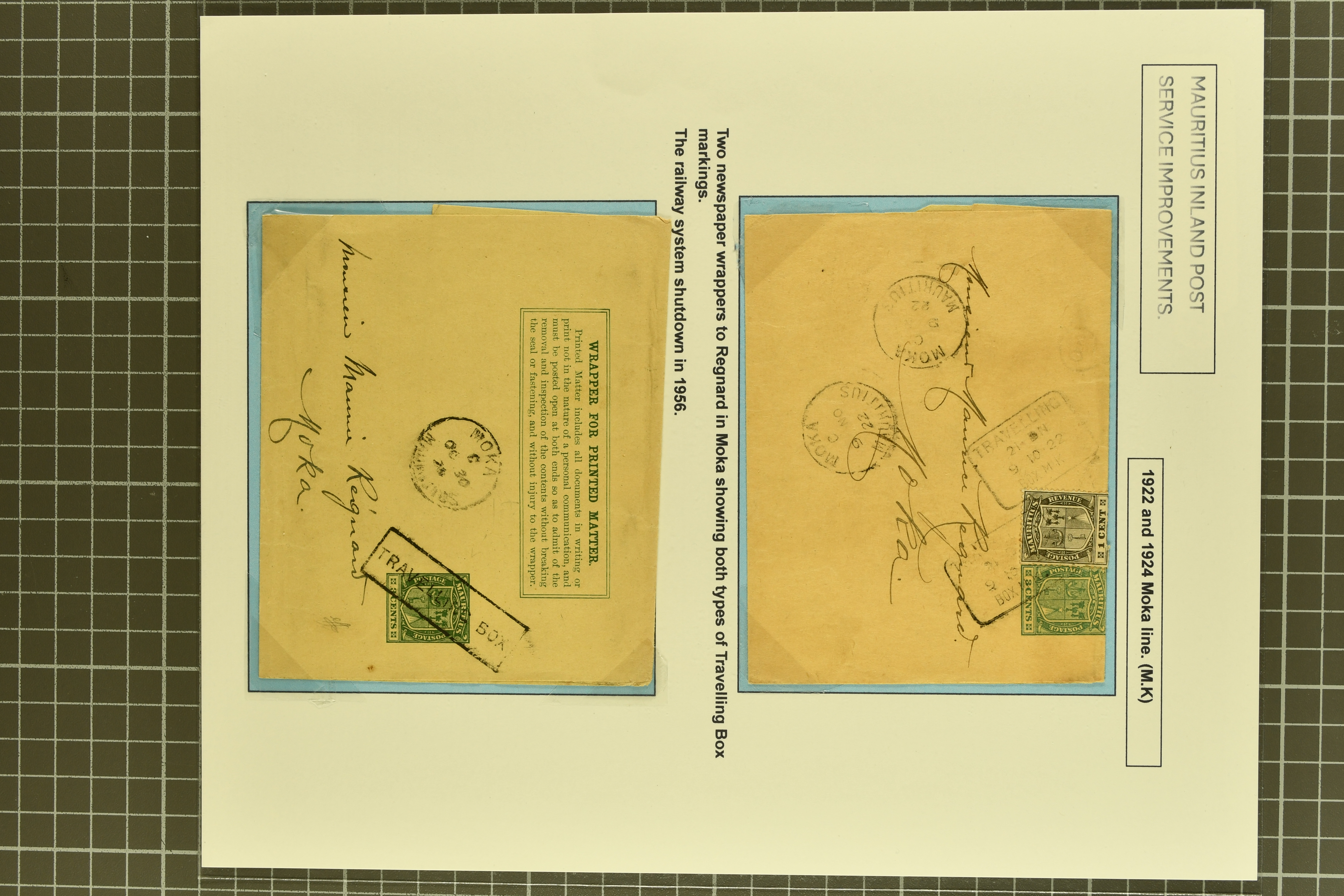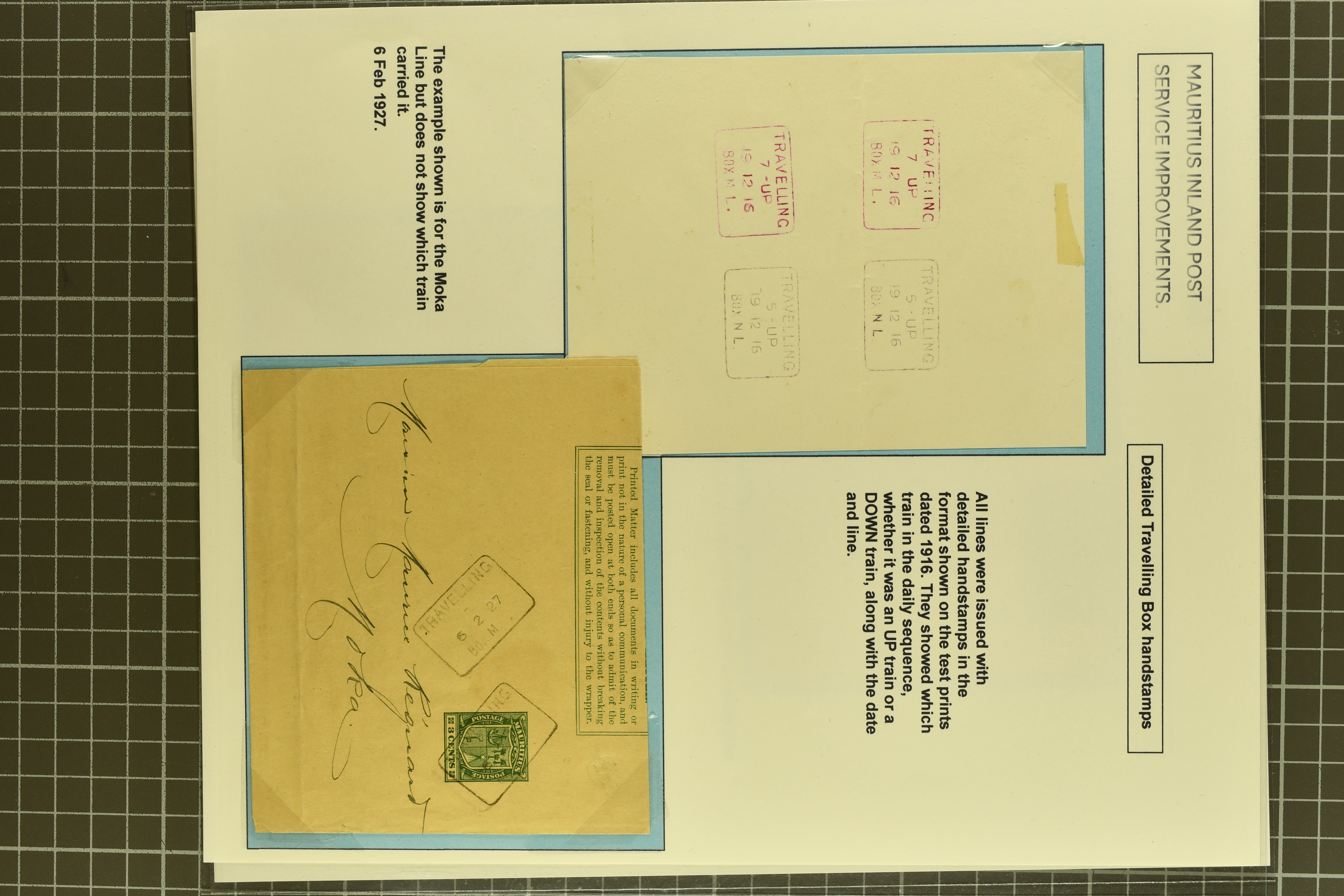 D1), 1916 detailed handstamps with piece showing four "Test Prints / Proof Strikes" from the Midland Line with "Travelling 5 UP " and "Travelling 7 UP" strikes; 1927 3 c. stationery wrapper to Moka cancelled "Travelling / Box M.L" datestamp in black;